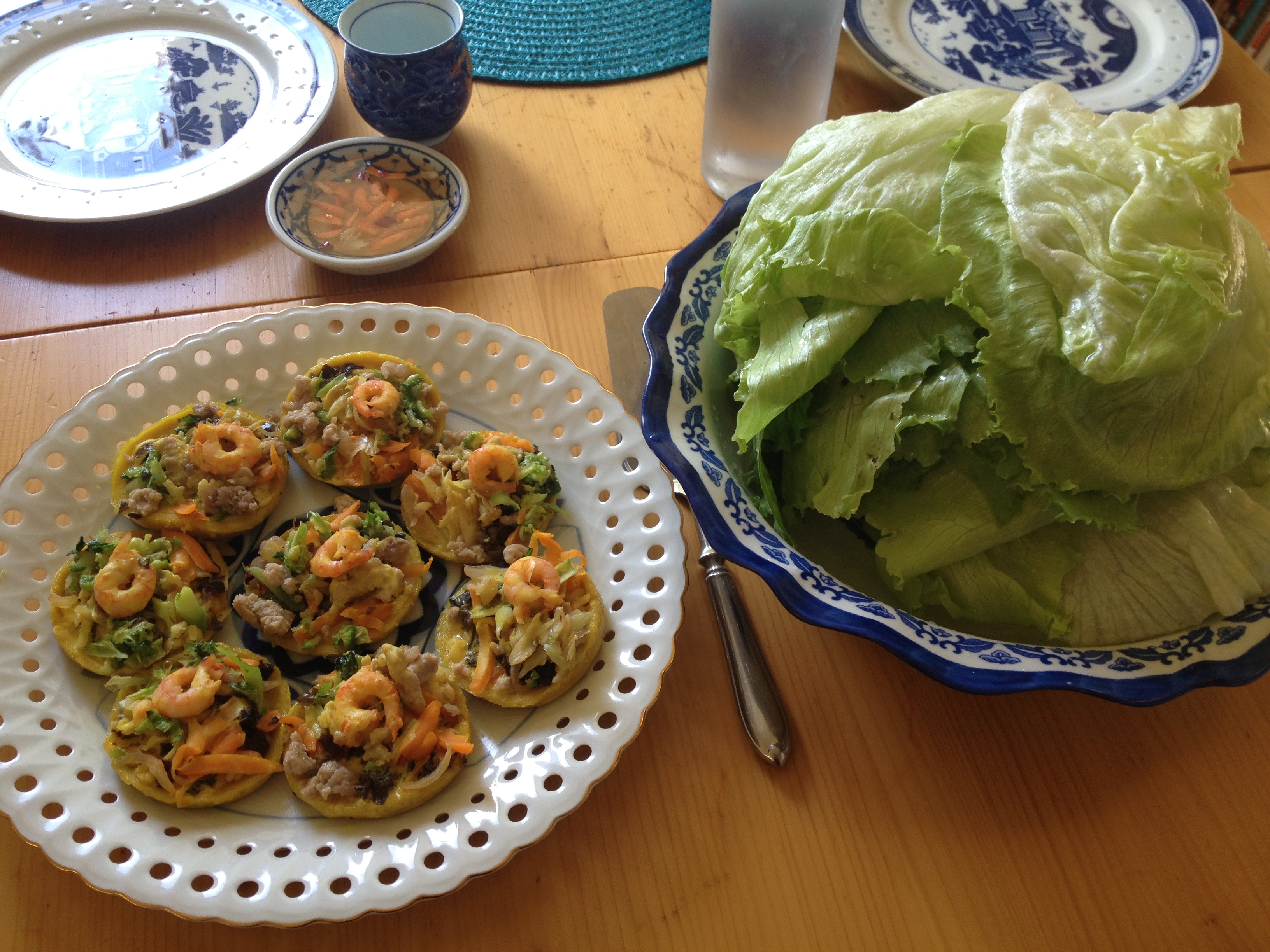 Serve with wrapping a pancake in green leaves to make your own spring roll with each pancake and dip in the fish sauce.