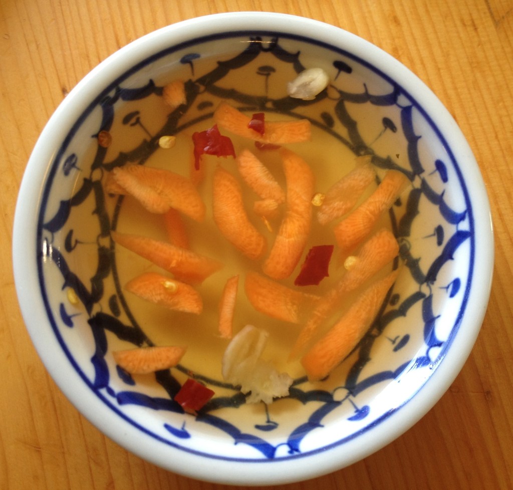 Mix water, sugar and lime until sugar dissolves. Slowly add desired amount of fish sauce (more is better!) . If you’d like a bigger punch to the sauce, add in garlic cloves and chilies, though these can be served on the table and added to each person’s dipping dish depending on their preference.