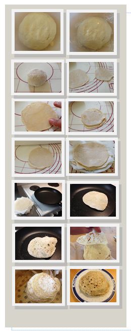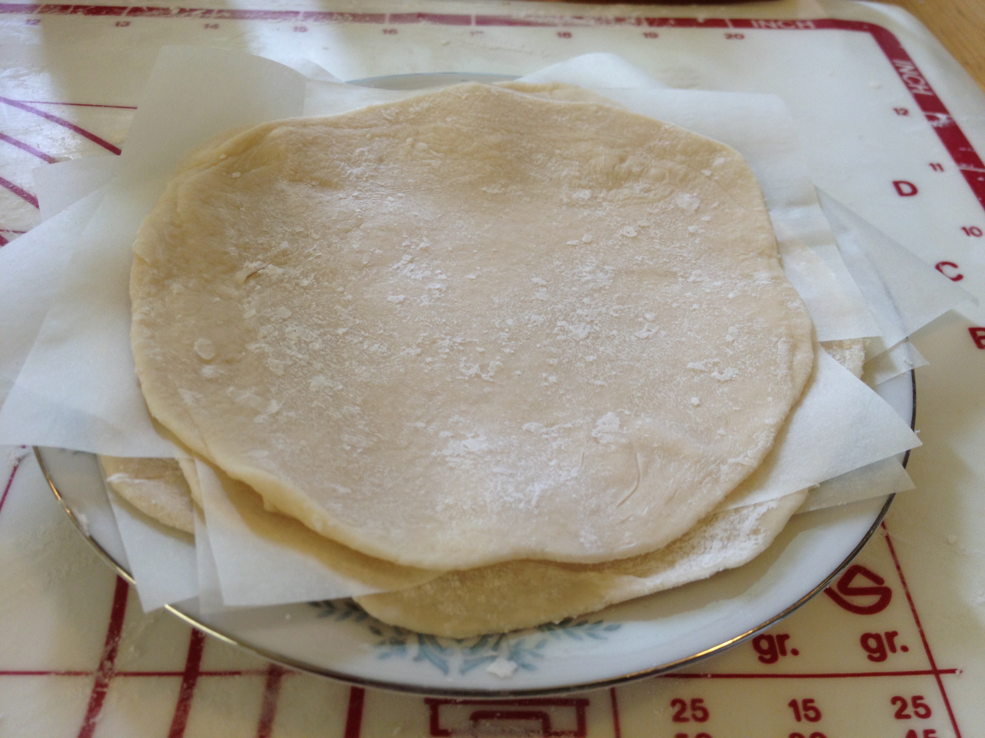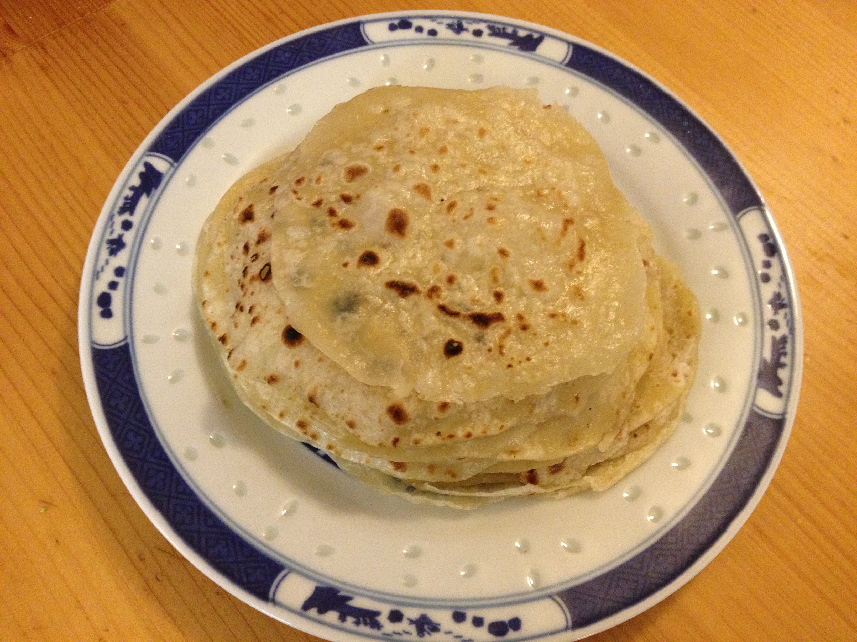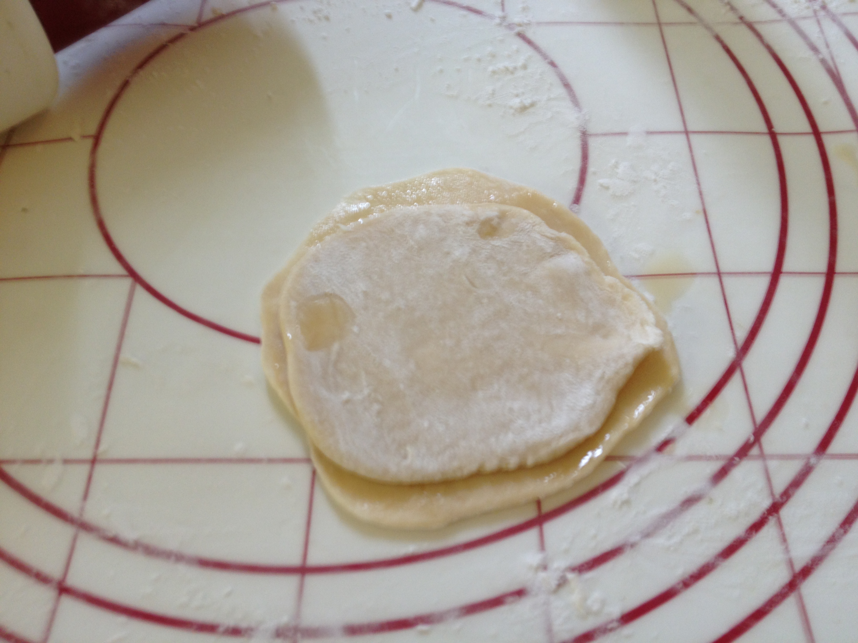 On a lightly floured surface, roll out dough to a snake. Cut in pieces and form balls a little smaller than tennis balls. This dough should make about 32 pancakes. (16 double after rolling). Use a rolling pin to make the balls into small pancakes. Roll two pancakes at a time into flat round pancakes. With your fingertip brush the upper side of one pancake with sesame oil. Make sure it is all covered. Place the second pancake on top of the one with sesame oil and use the rolling pin to roll both together to make it a bigger and thinner pancake, about six inch circle (ca 15 cm). Do not press on the edges of the pancake. Cover with a damp towel and repeat process with remaining dough rounds.