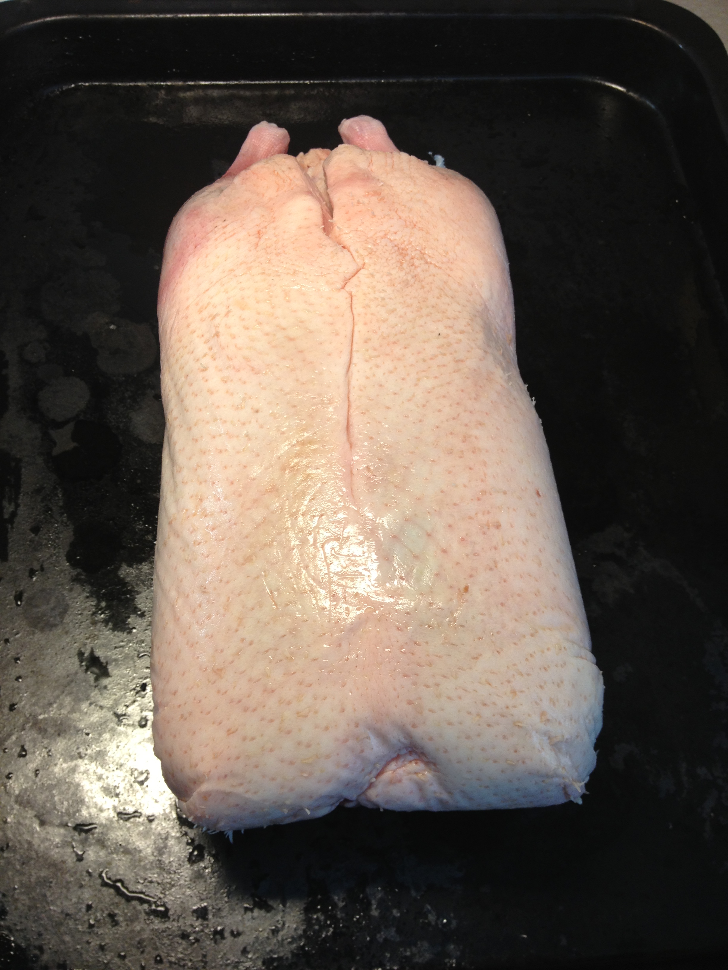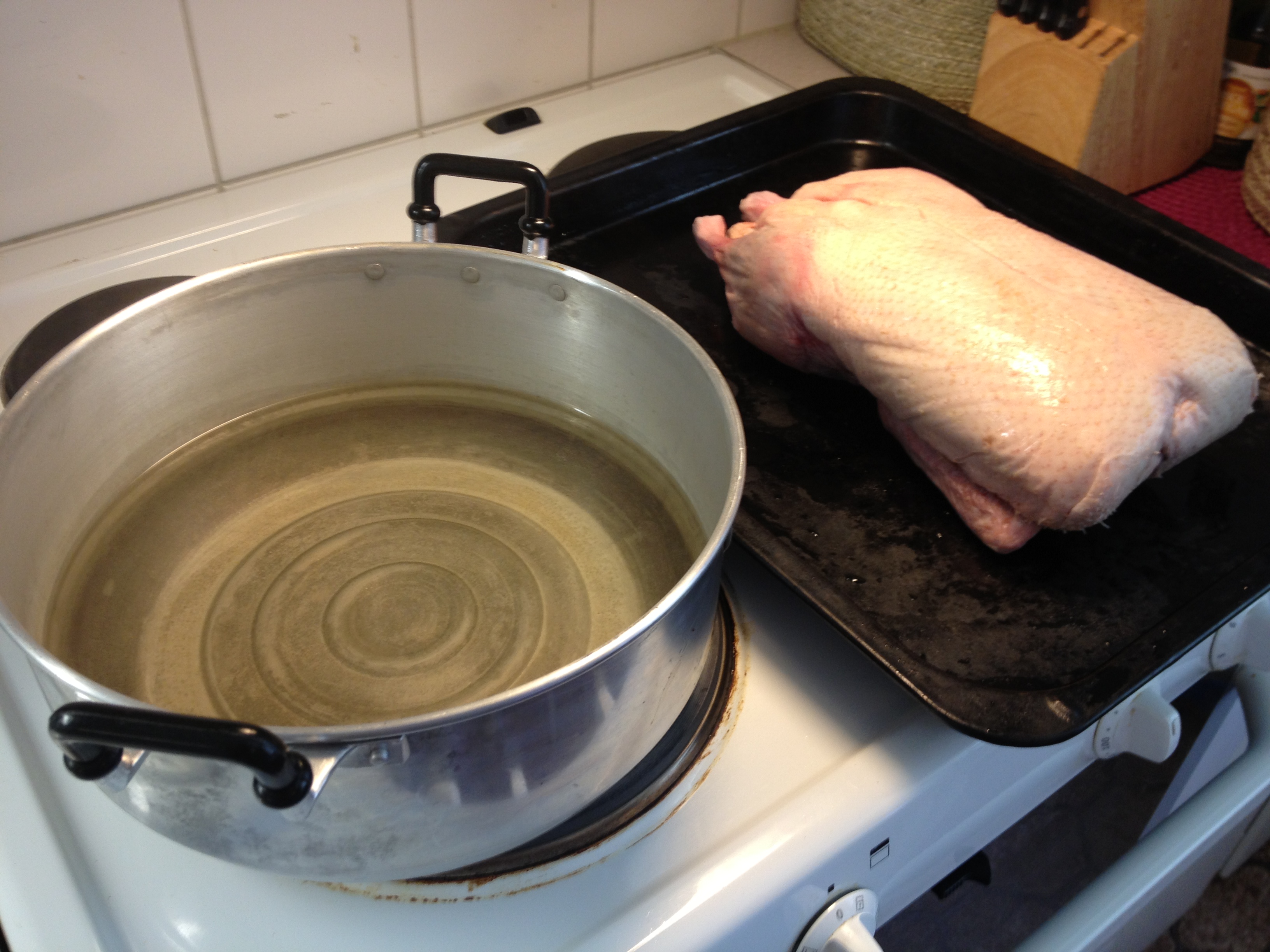 Boil 2 l water and pour over the duck to make the skin shrink. Pour with a sleeve around and all over. You can keep the duck in a strainer when doing this so the water will drain immediately. You will see the skin shrink and tighten when doing this.