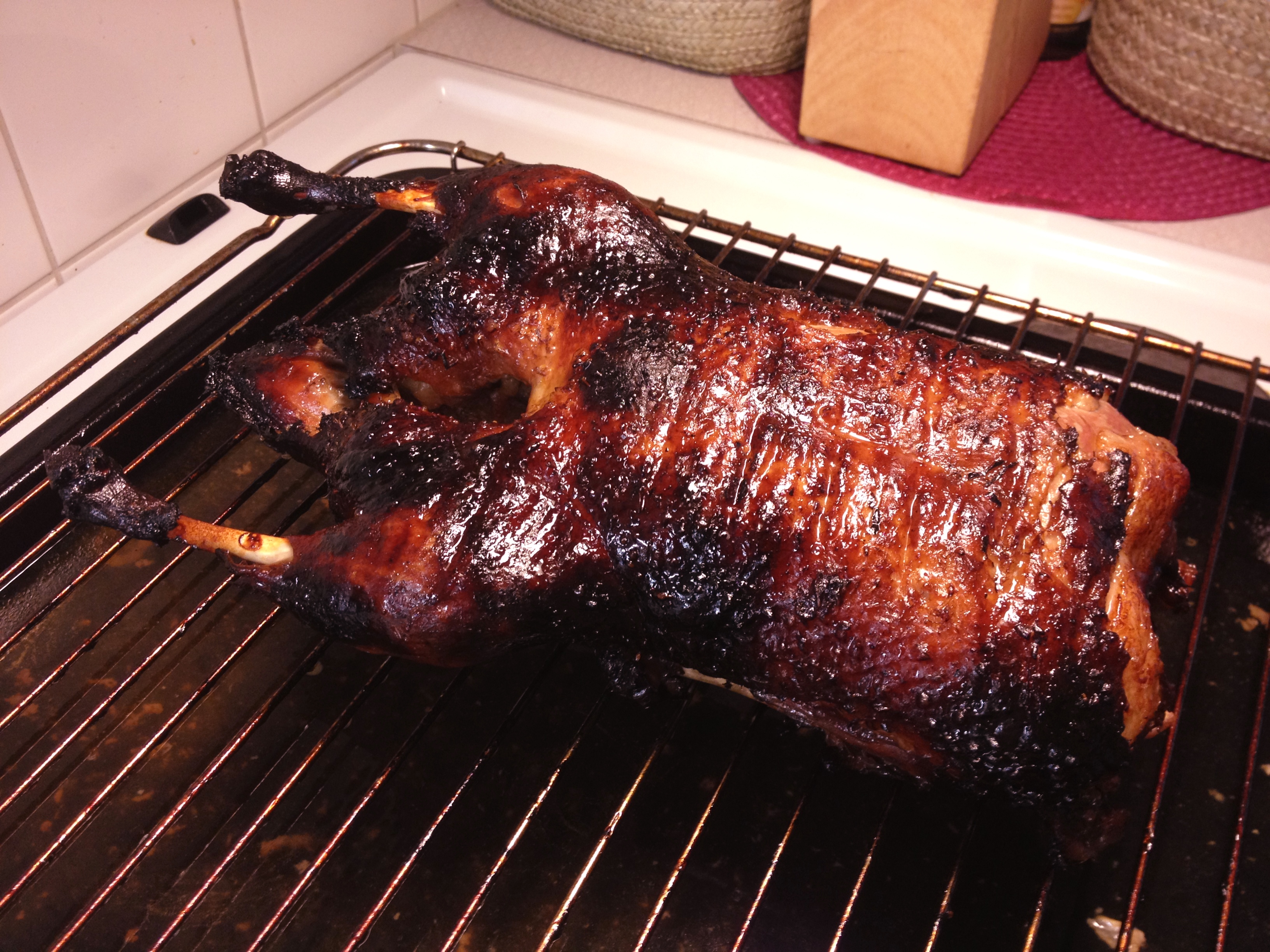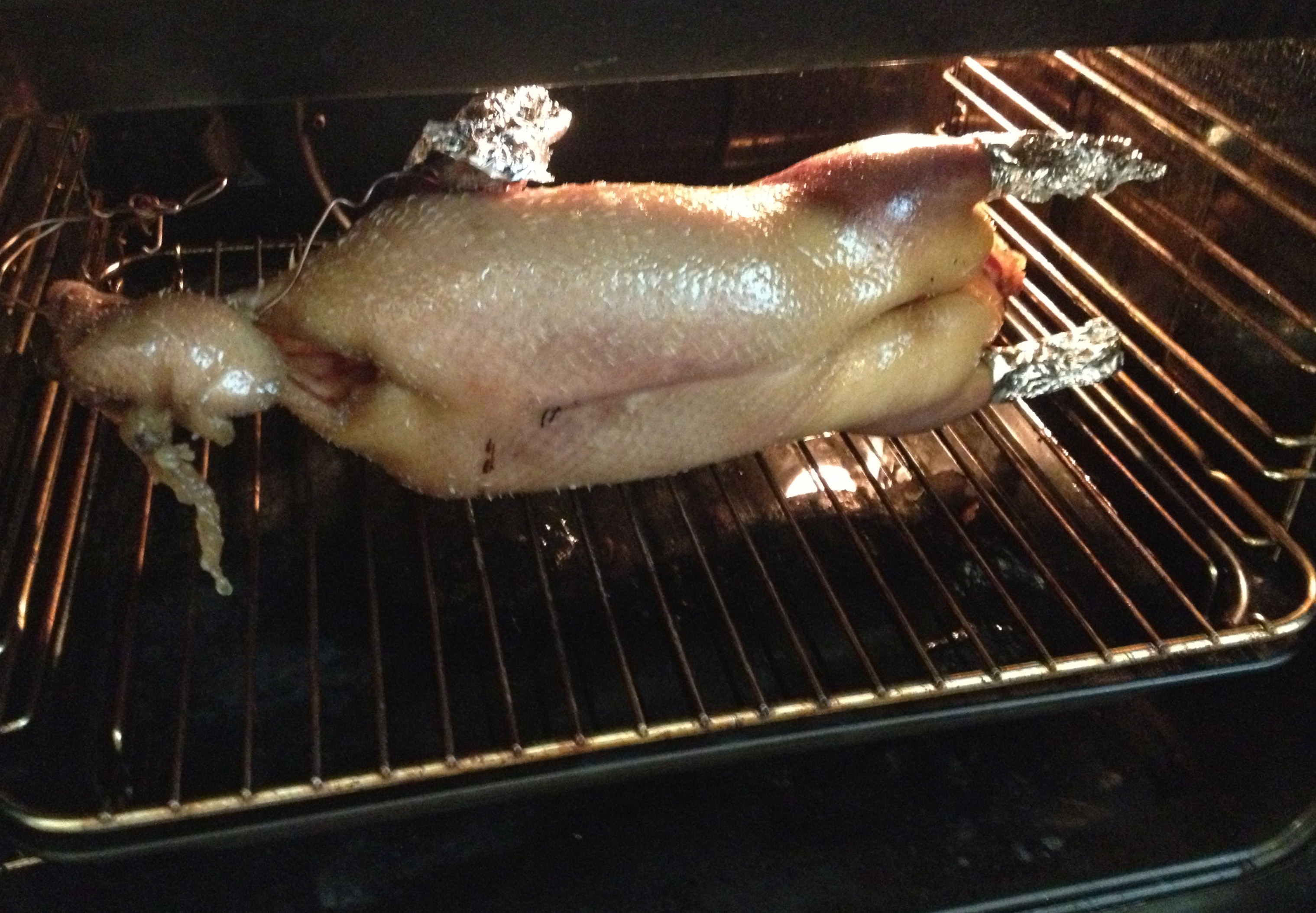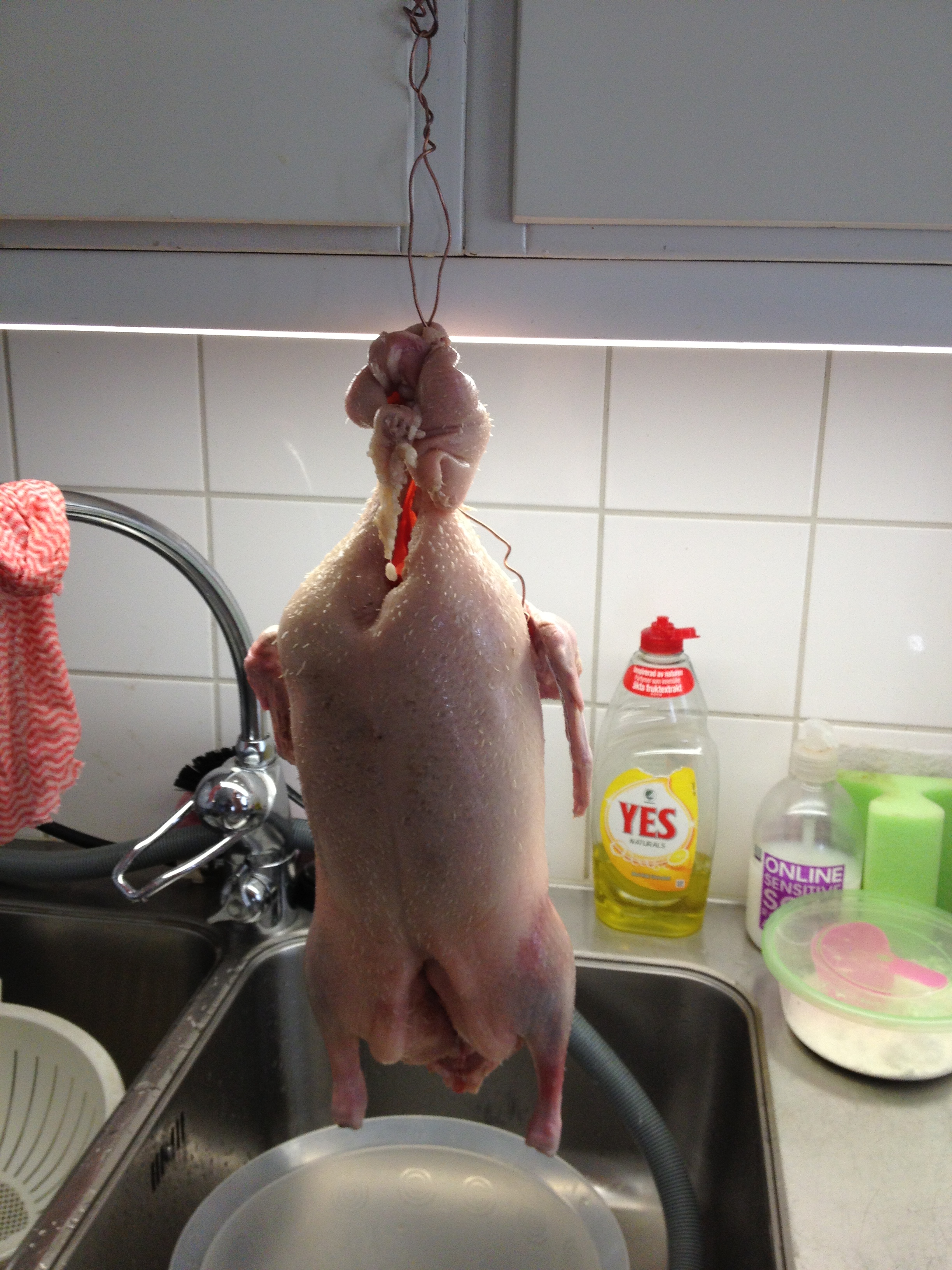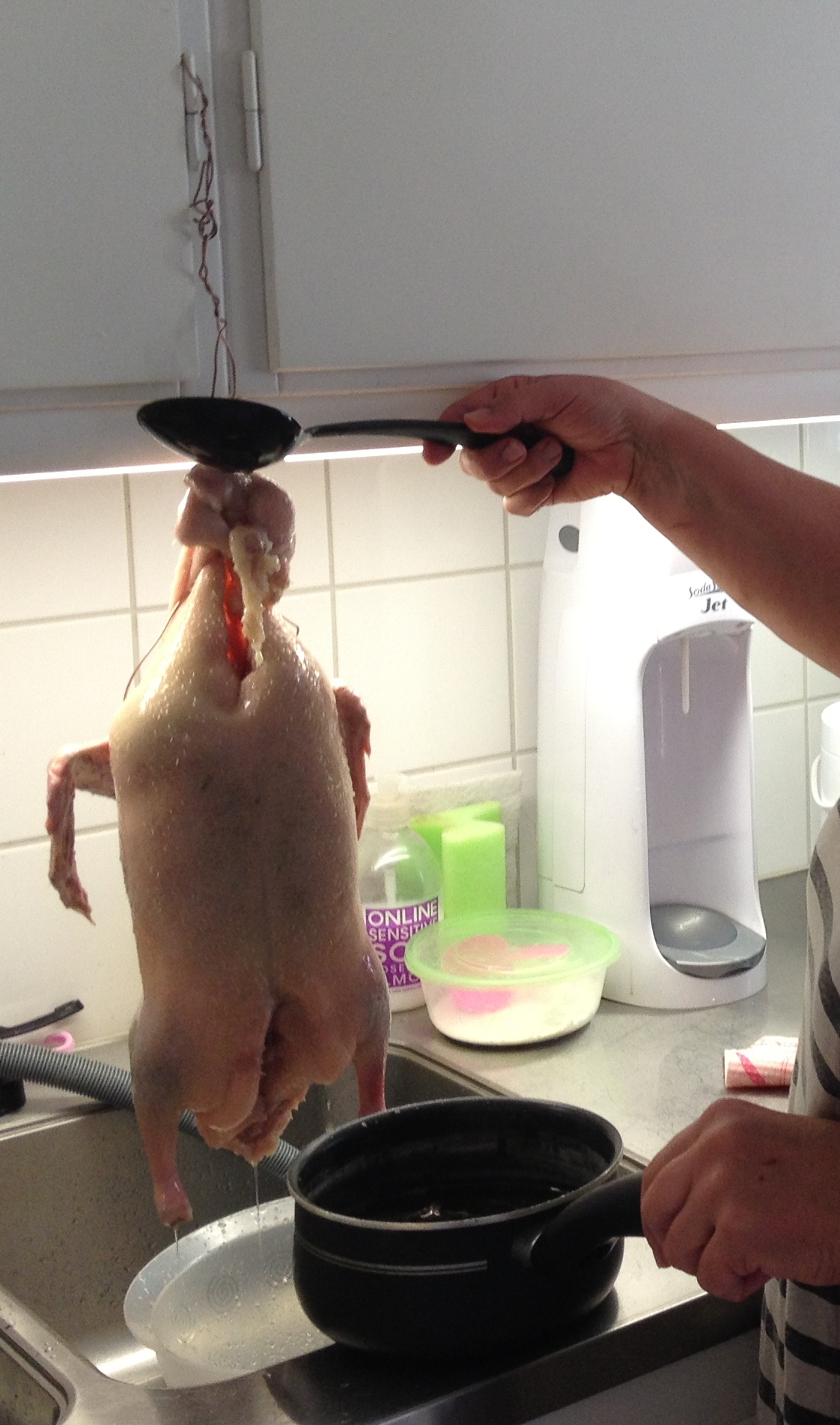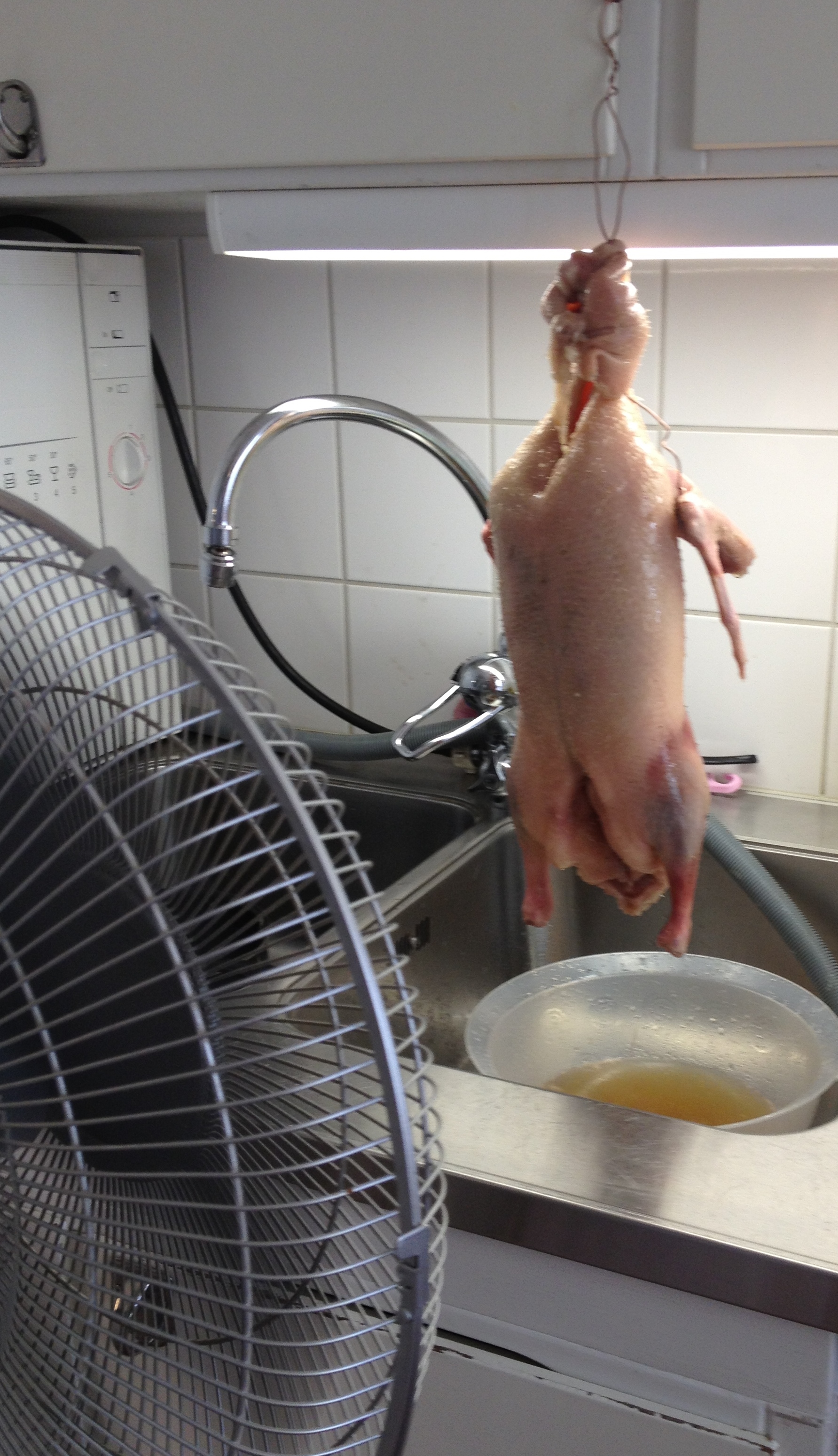Hang the duck with a wire, a hook or a string in a windy and cool place for 24 hours. If you can remove shelves and hang it in your refrigerator do this. Or like me I don´t have room for that so I hang it above the kitchen sink with a bowl underneath to gather juice or glaze that would spill. And I put a fan in front to blow on the duck for 24 hours. This is important to dry the duck and prepare it so it will get crispy skin.