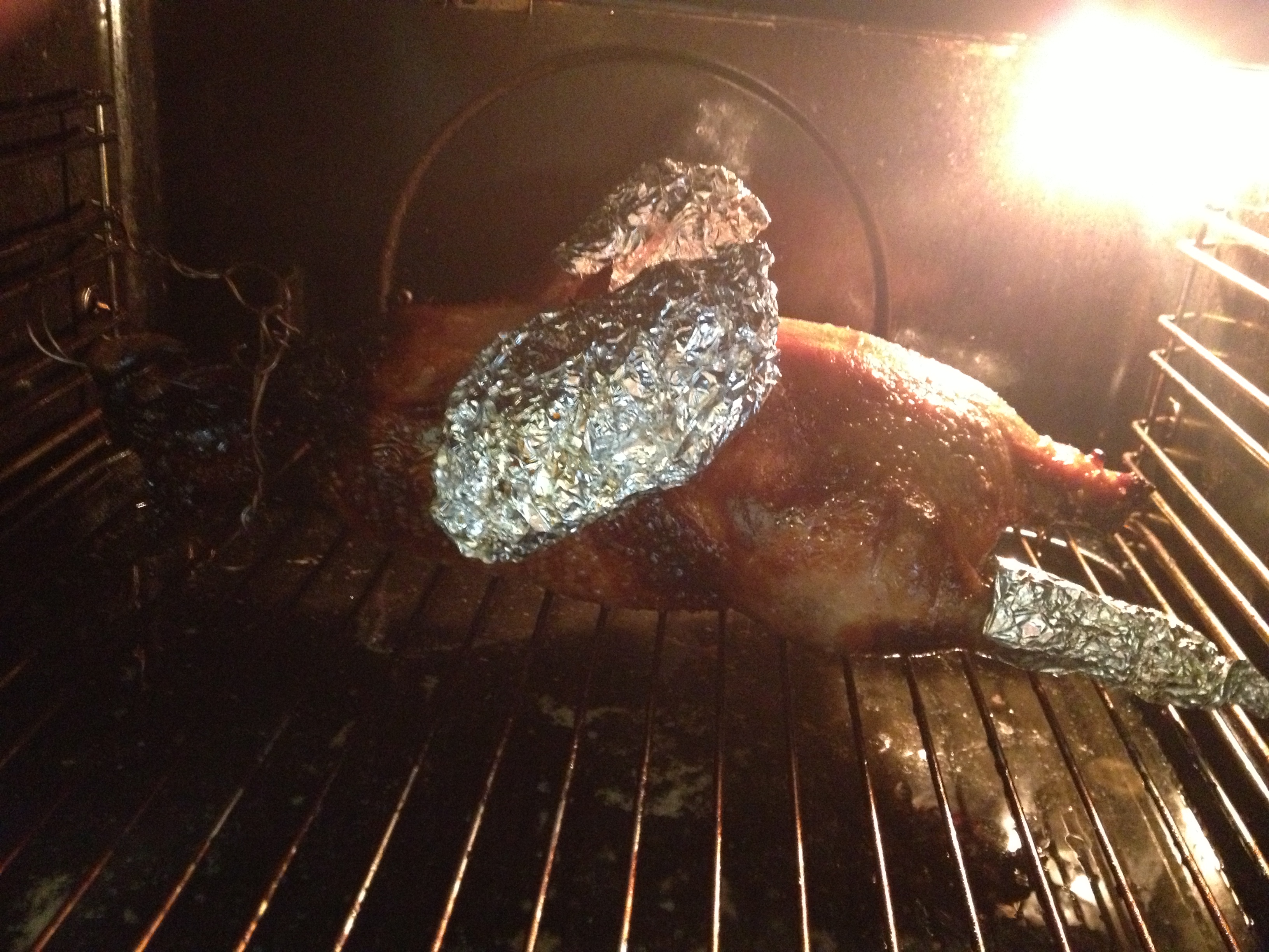 When you see it is all evenly roasted and the skin crisp and you can loosen the leg easily it is finished. Turn the oven off and keep the duck inside for additional 15 minutes.