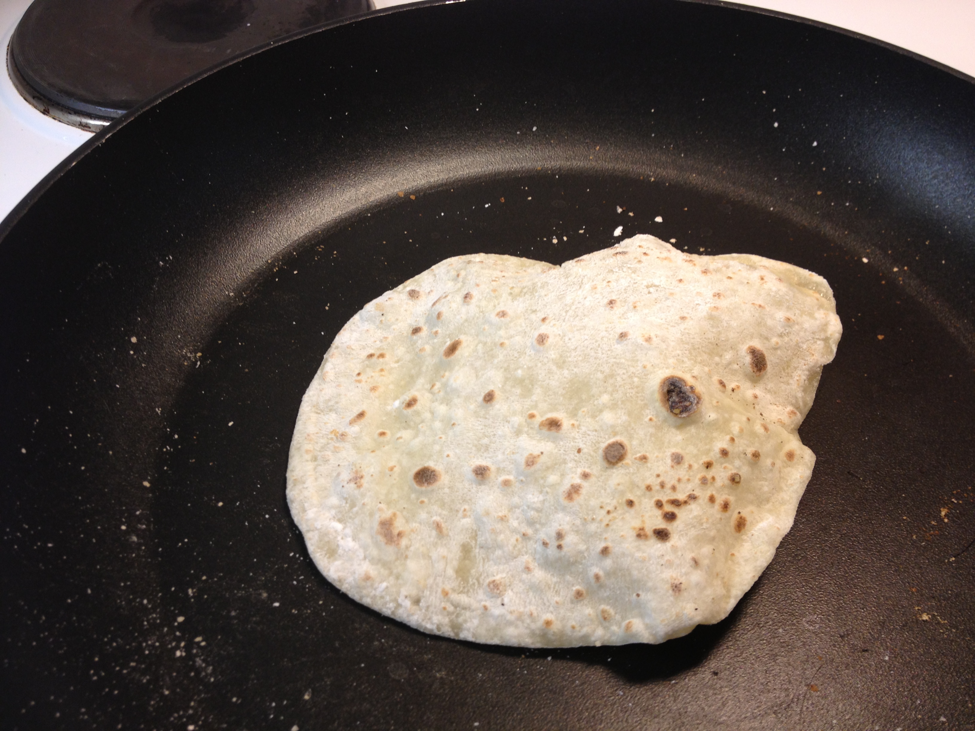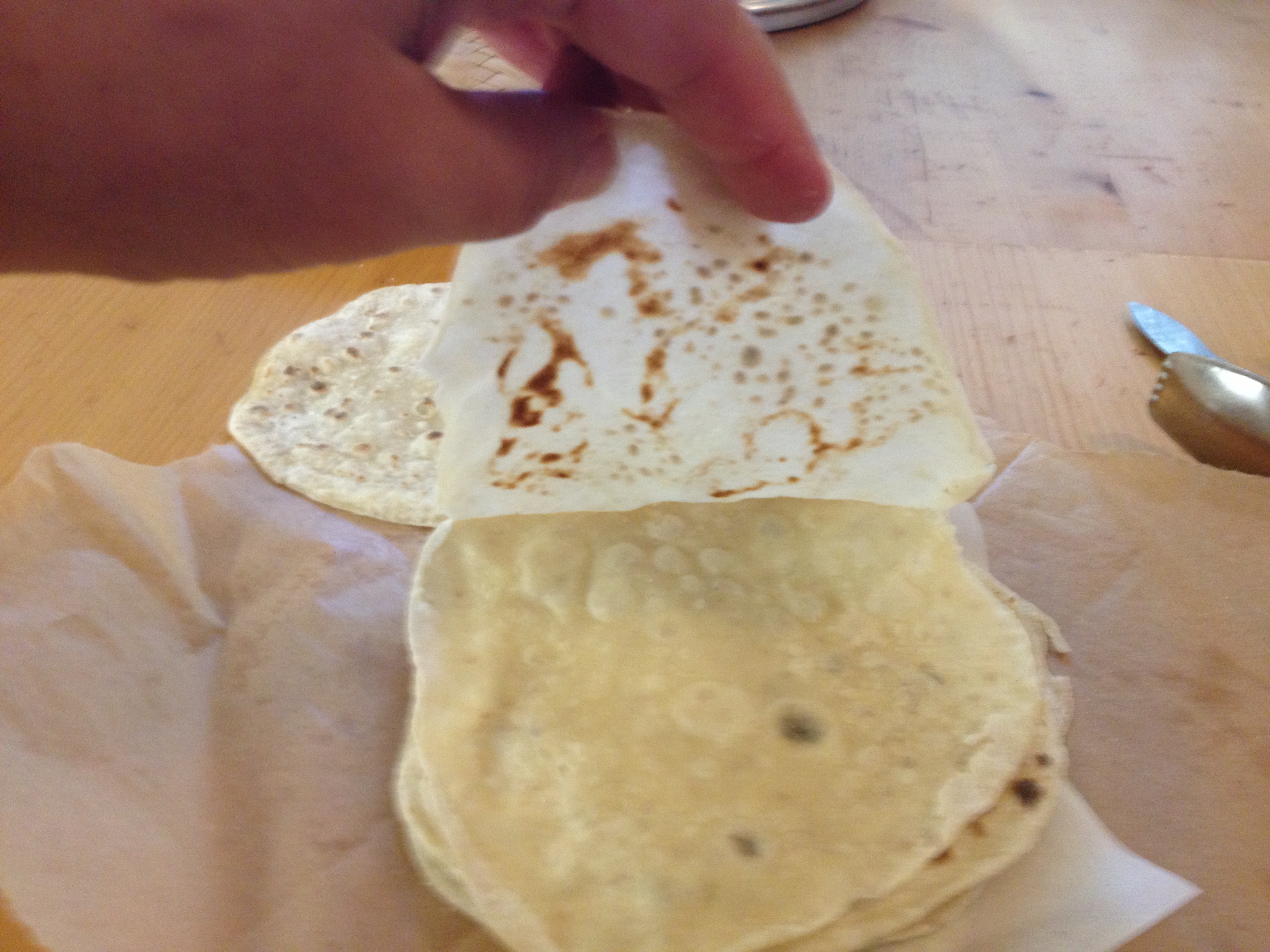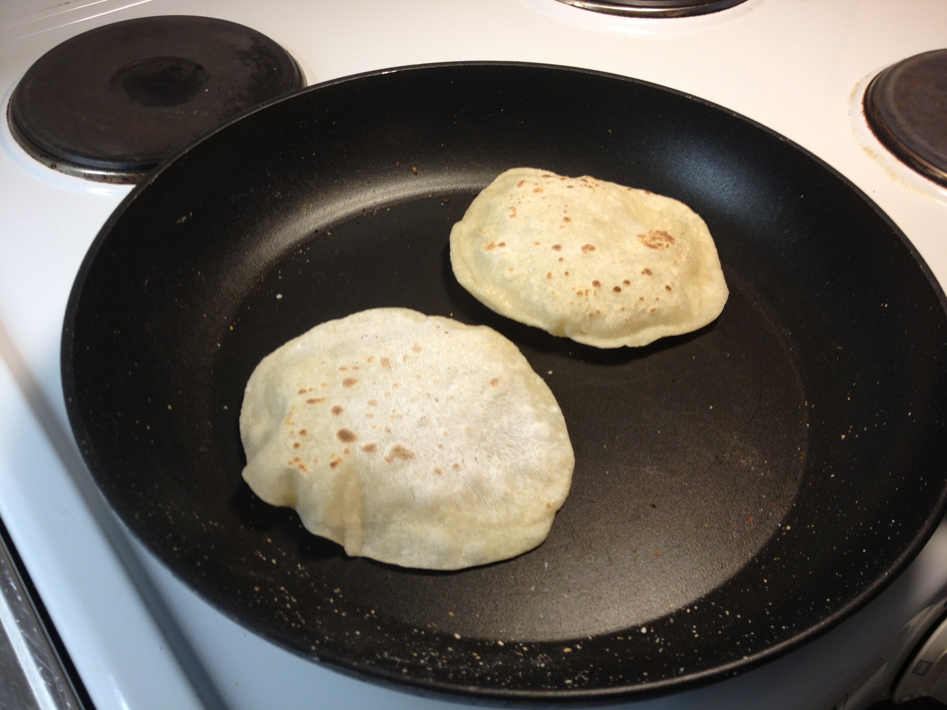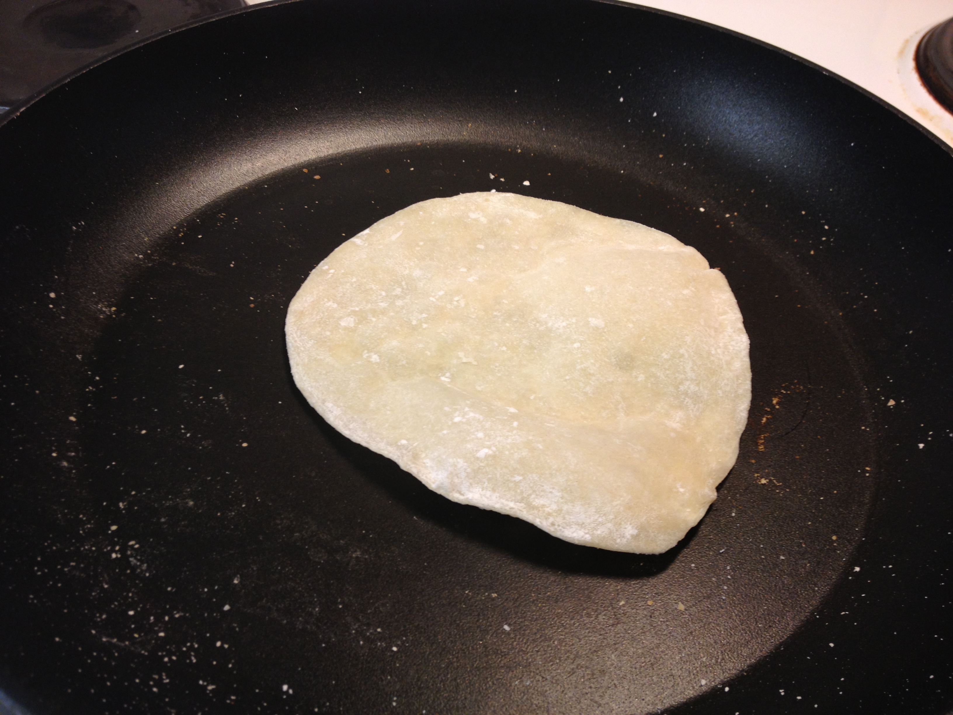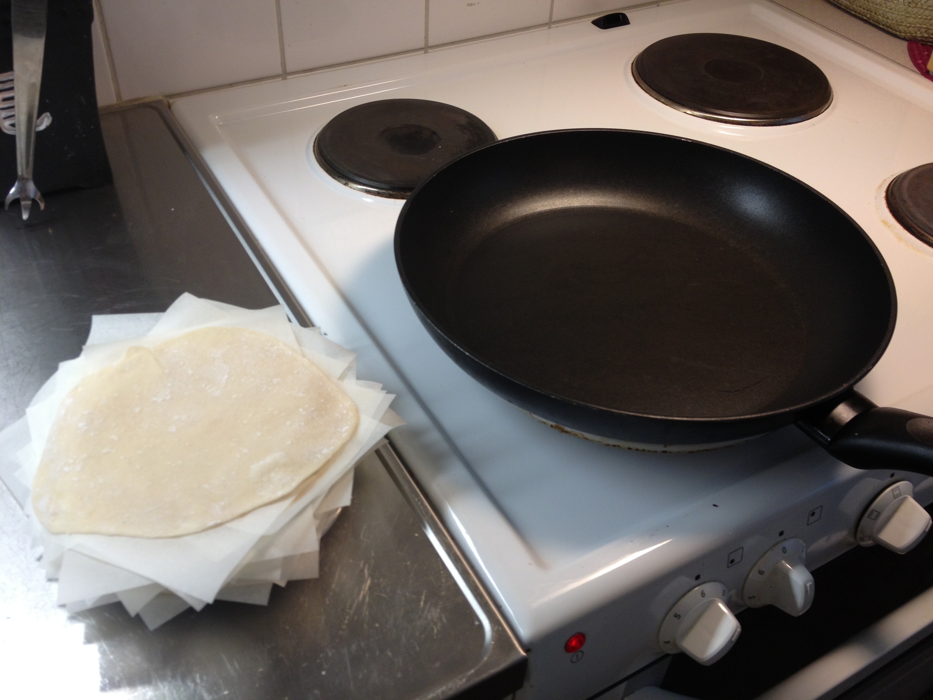 Heat a frying pan to medium heat. Add one pancake and cook, turning once, until lightly golden and dry, about 30 seconds per side. Remove from pan and let cool slightly; than insert a knife or something thin and sharp in the edge of the pancake to separate into 2 pancakes. Repeat process with remaining pancakes.