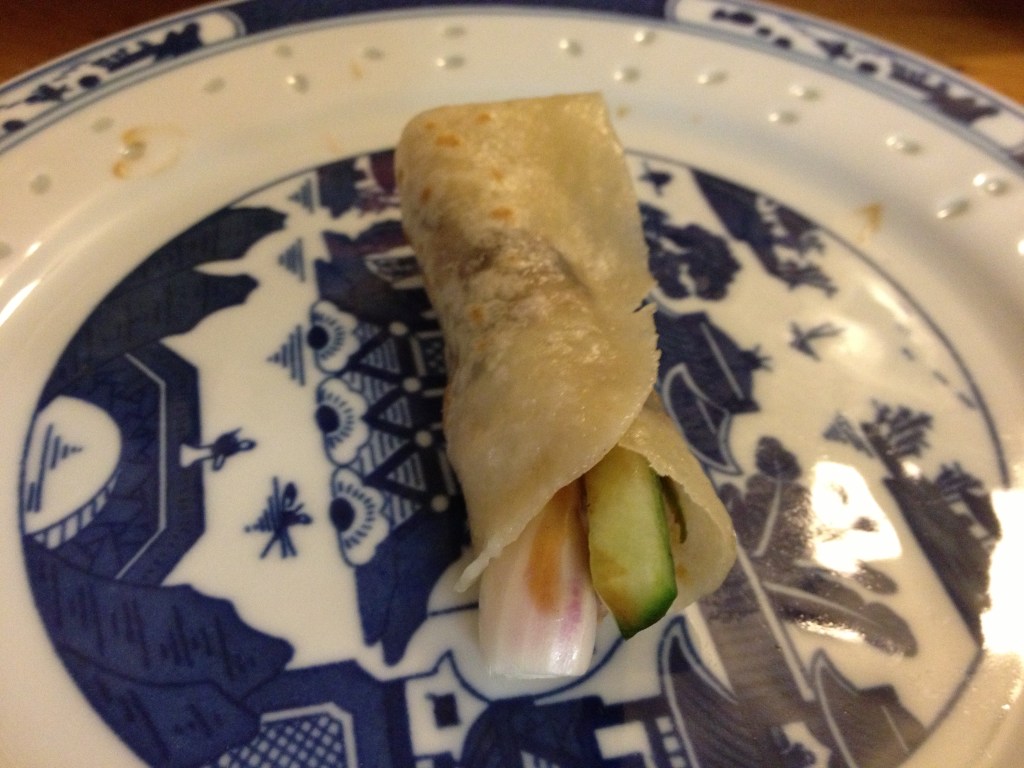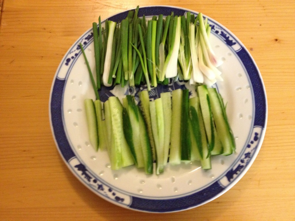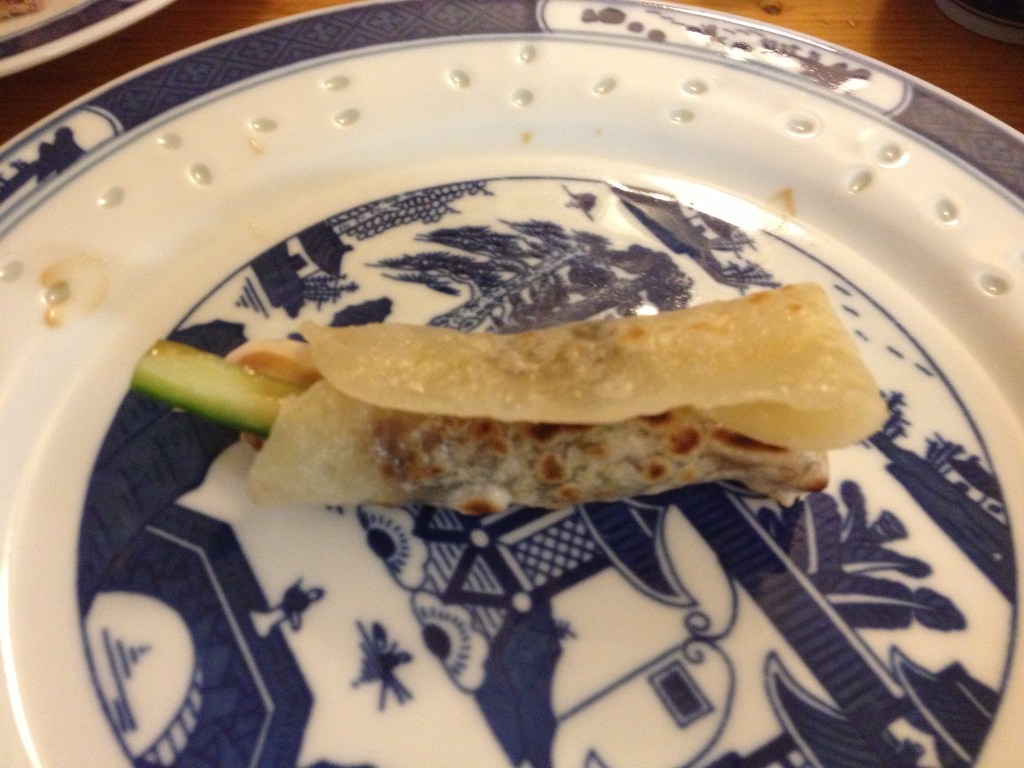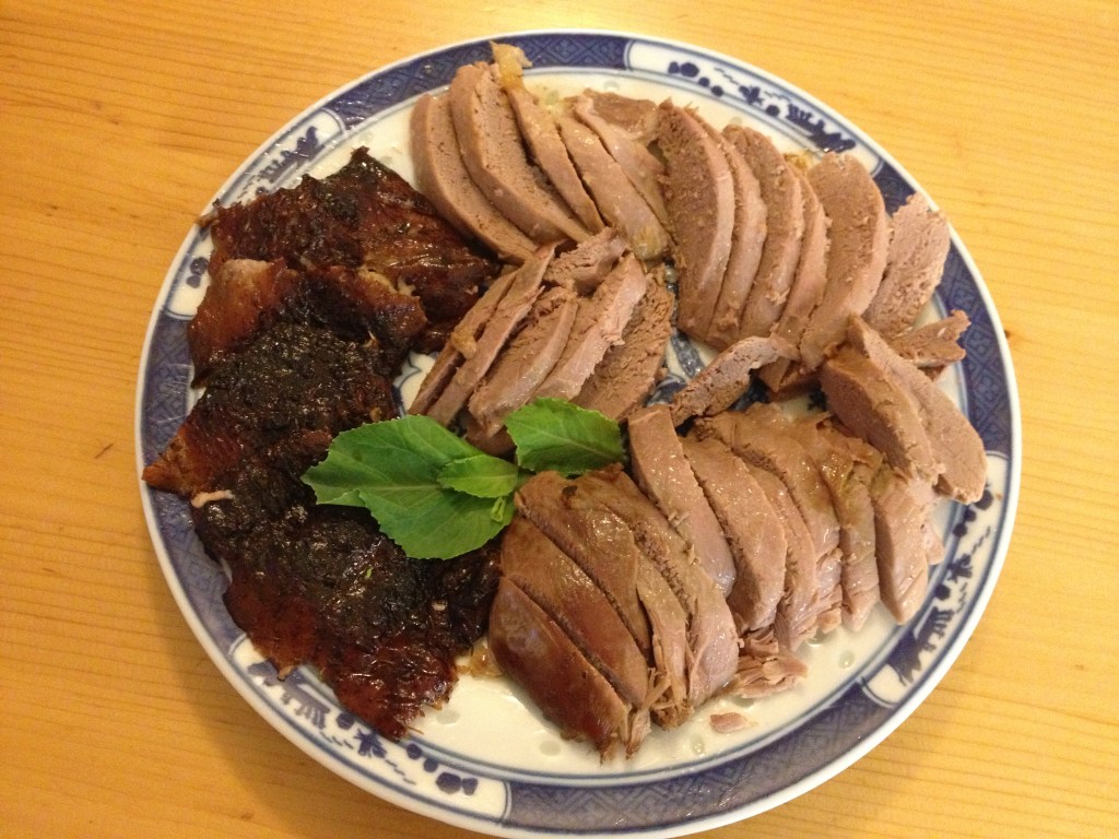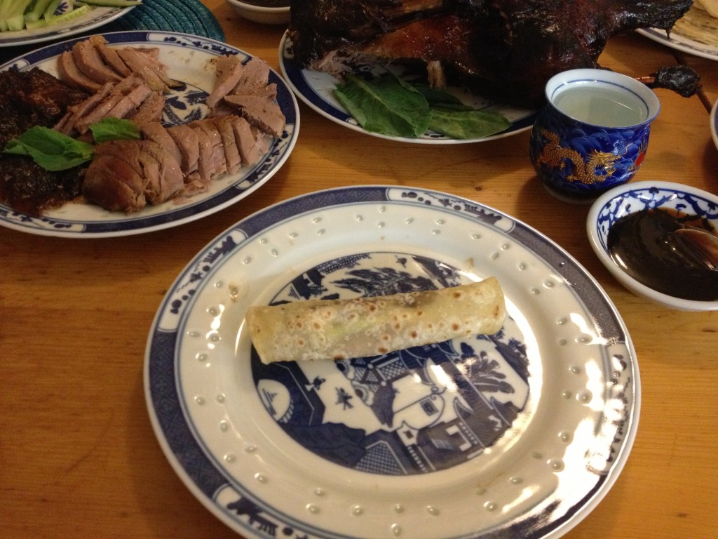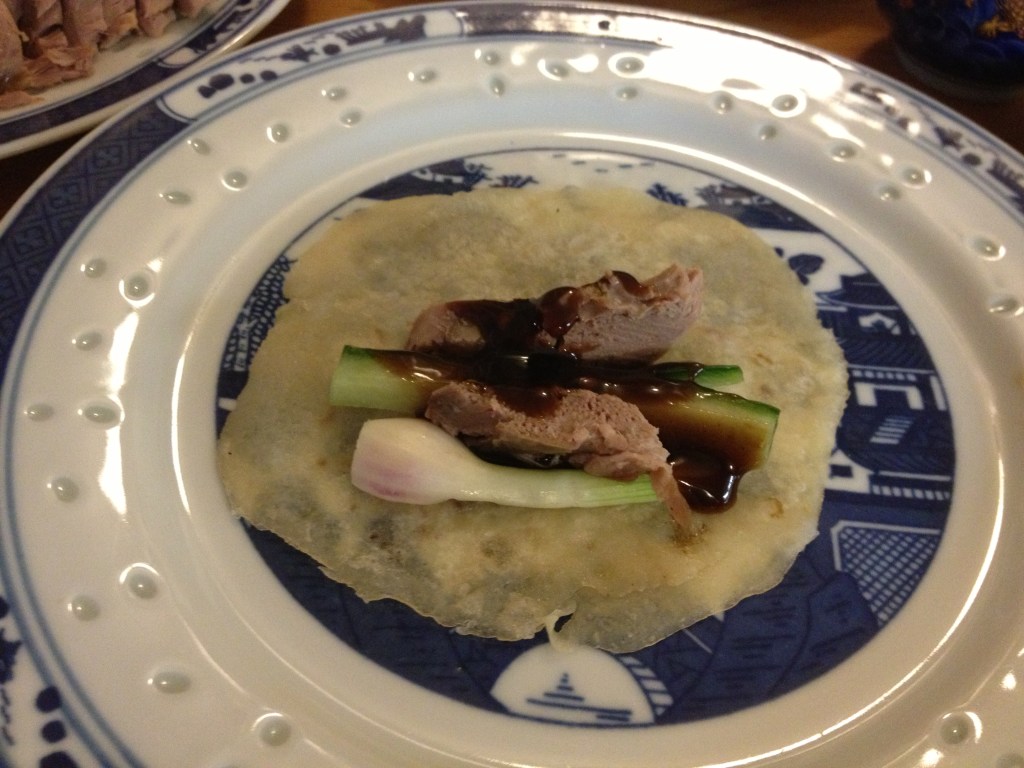 Then when eating the Peking Duck you place a few sticks of cucumber and scallion on one pancake, put a couple pieces of the cut duck meat and add hoisin sauce. Roll the pancake to a roll and eat.