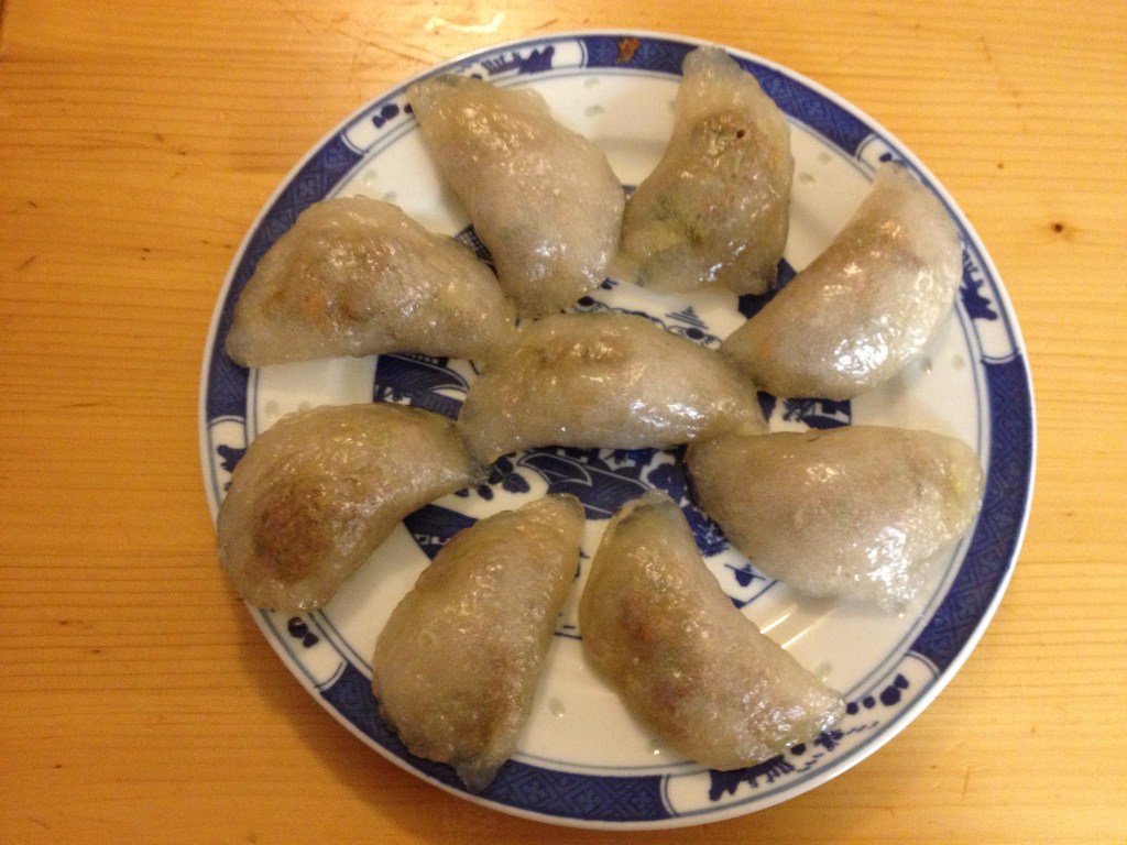Usually in Chinese or Vietnamese Dumplings you add fish sauce and sugar as an ingredient, even shrimps. However since I served this with the Peking Duck I chose to not add it this time, but just used salt and pepper as spices and only the duck innards and no shrimps. This is really just a choice of mine to not mix too many different flavors. The dough could also be made with other types of flour. Using the tapioca flour comes from a recipt for Rose Dumplings that is a dish in Vietnam.