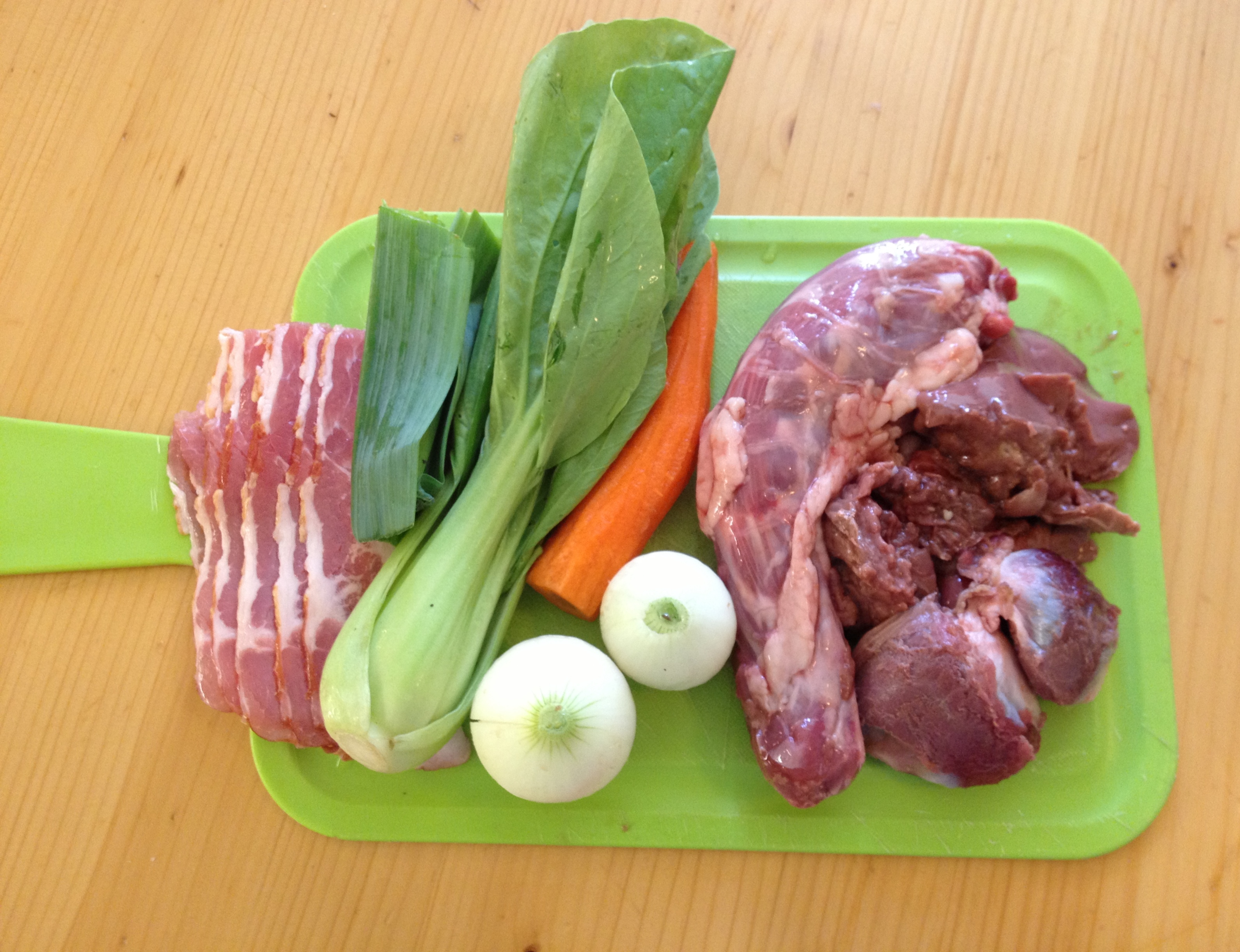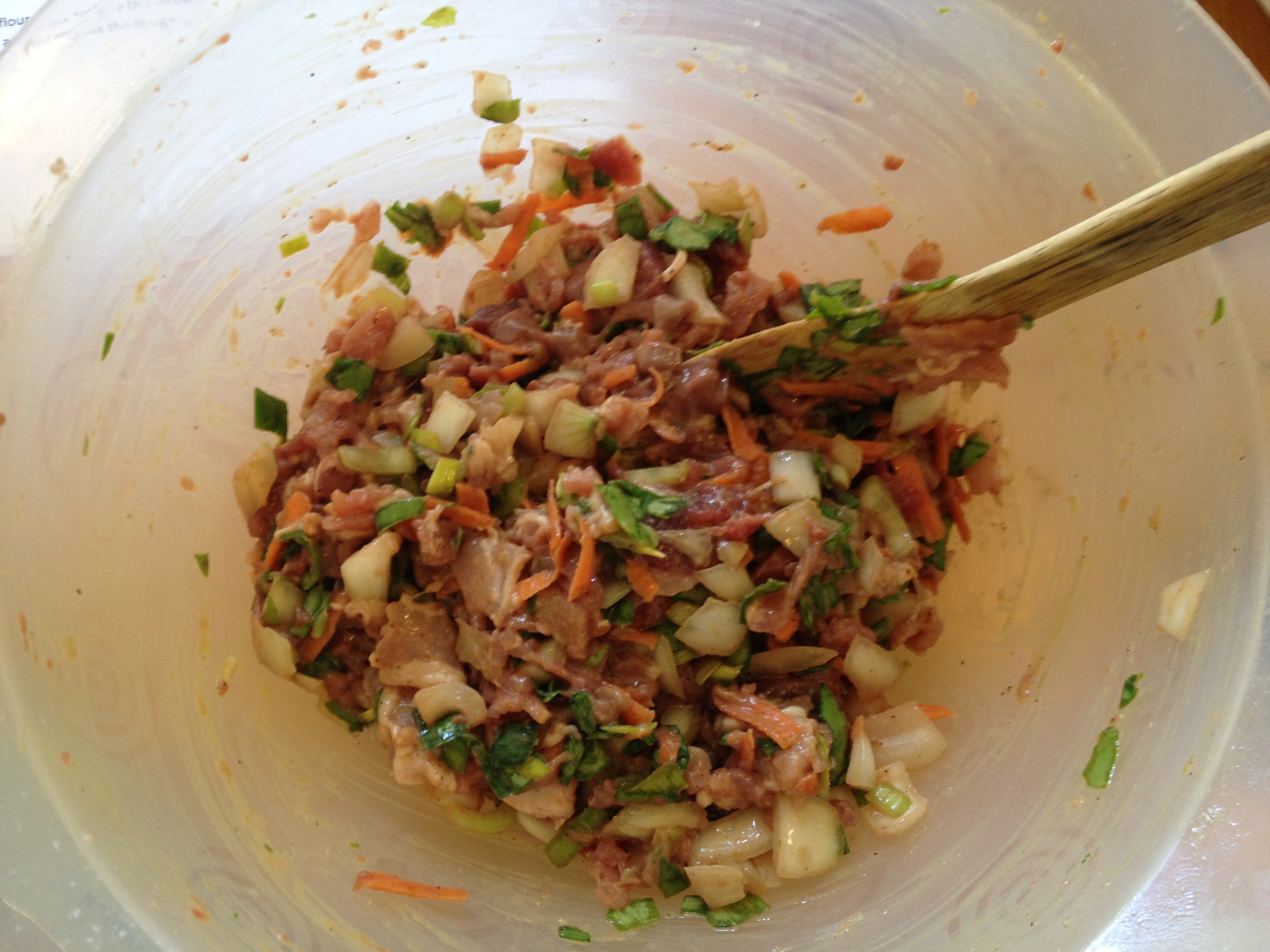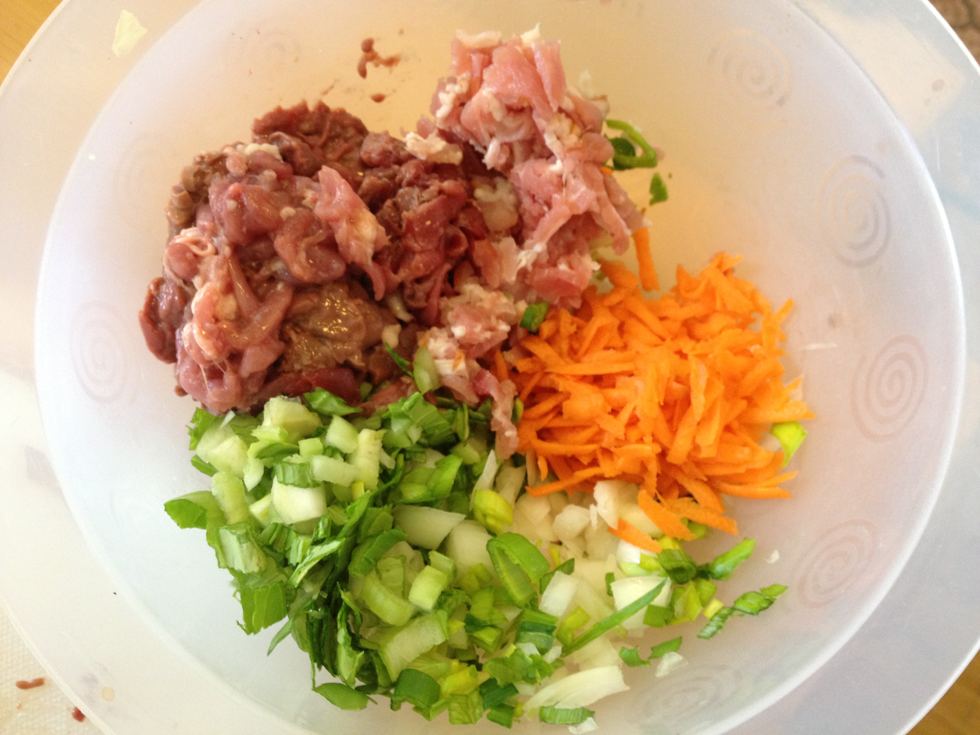 Finely cut or shred the Innards of the duck Scallions finely chopped1 Carrot shreddedGreens of your choice can be added and chopped finely½ tsp Pepper1 tsp Salt1 tbs OilPinch of GarlicMix the ingredients. Fry the filling in a frying pan before filling the dumplings.