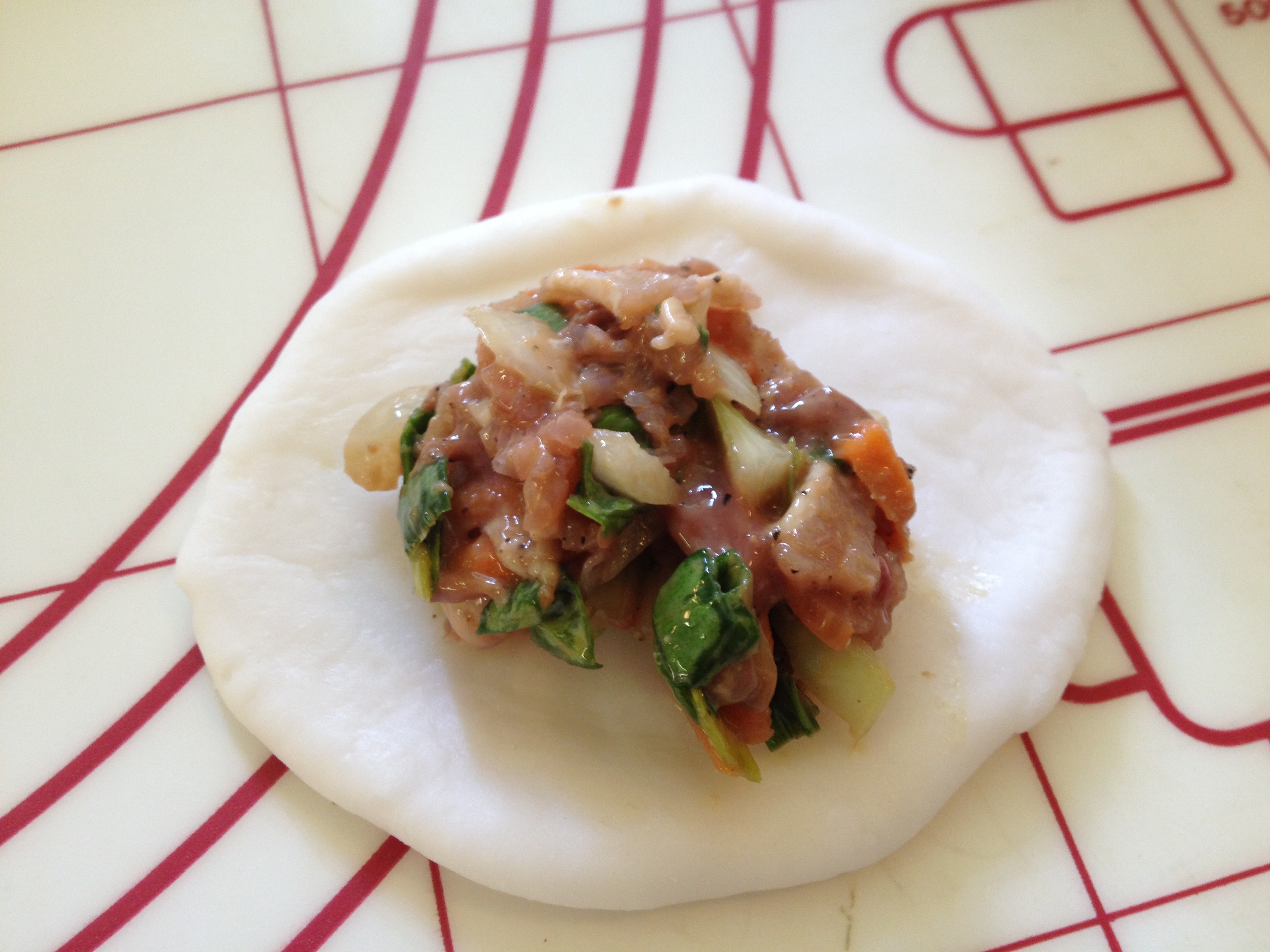 Divide the dough into small pieces like the size of a tennis ball. Use a rolling pin to roll the dough or work it into a flat round shape with your hands. Lay the filling in the middle and close the edges with your fingertips.Place the dumplings in a steamer. Put parchment paper underneath in the steamer basket. Steam for 5 minutes.