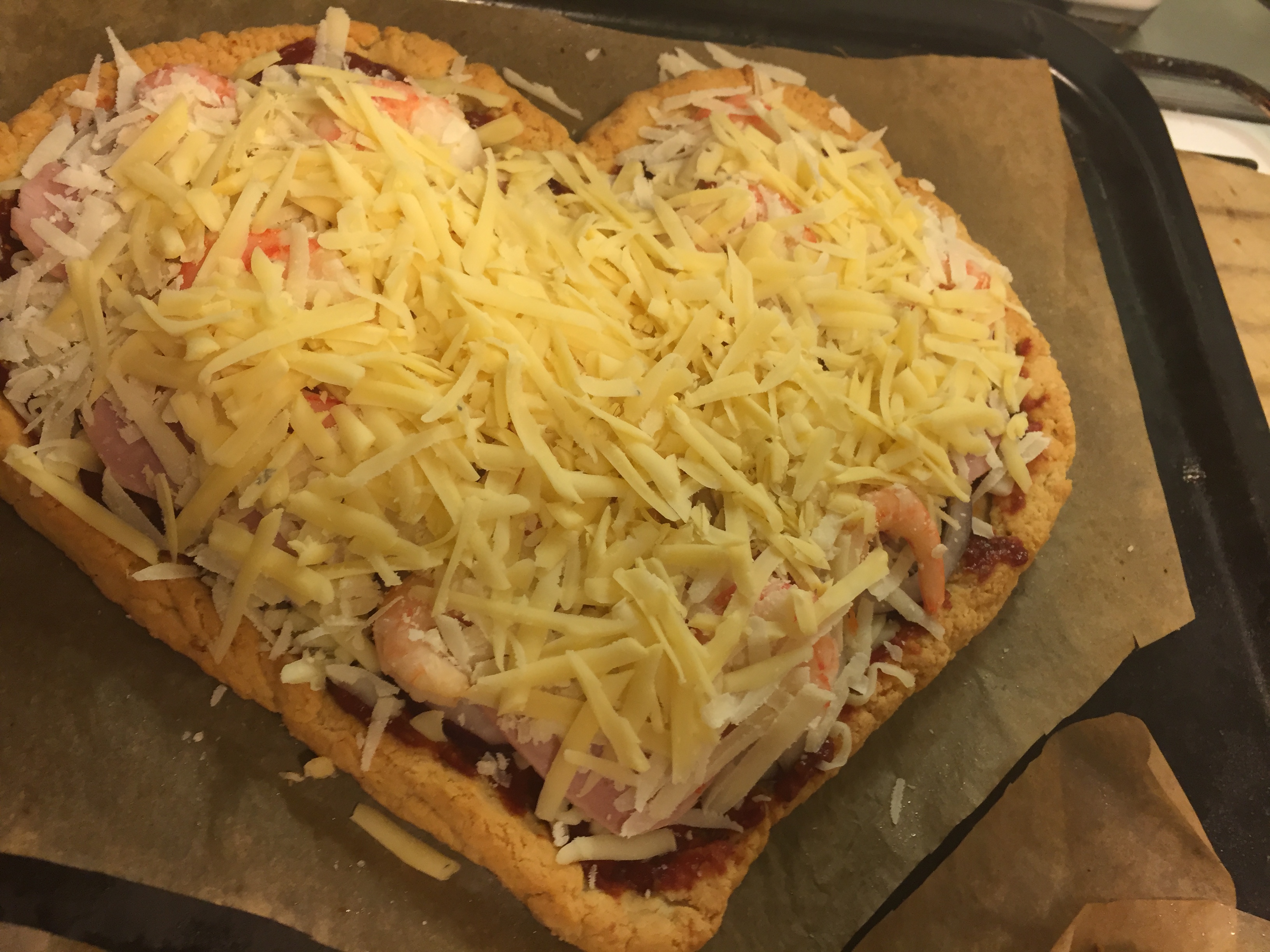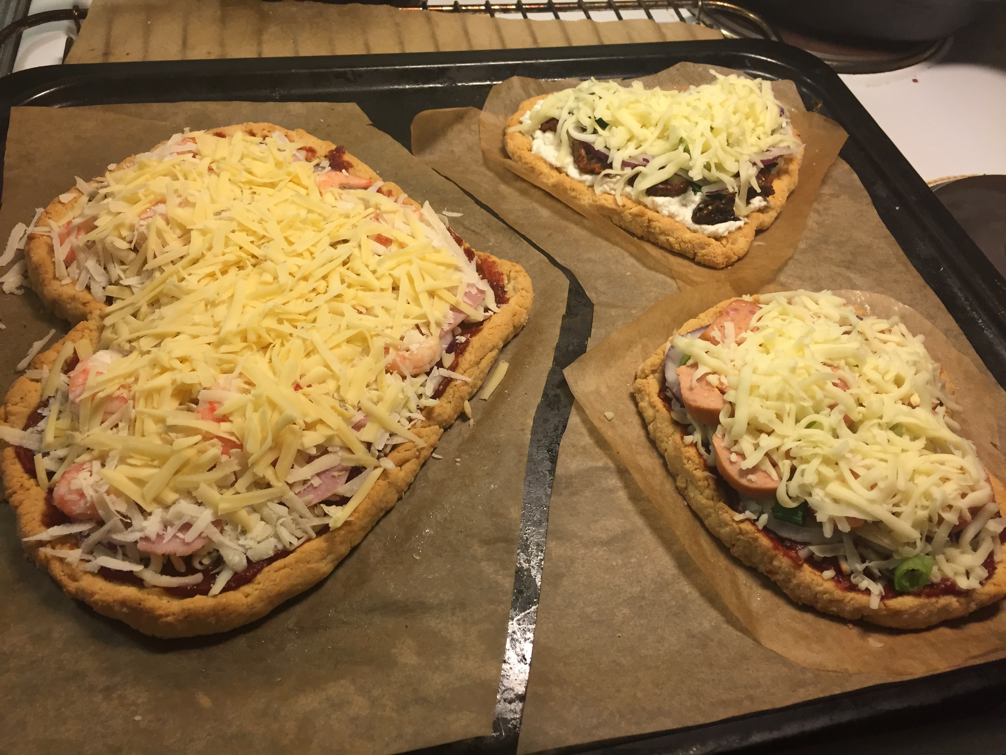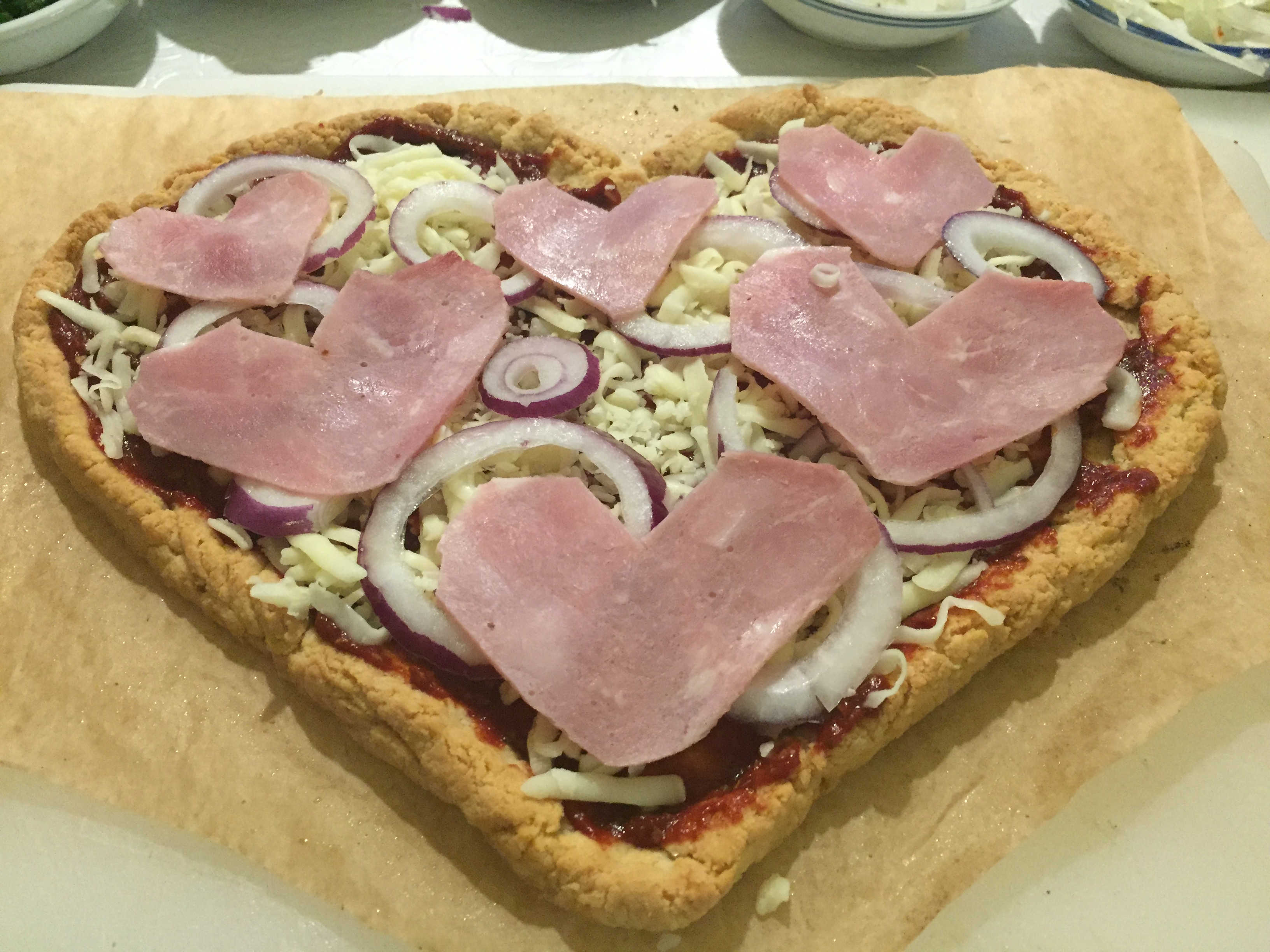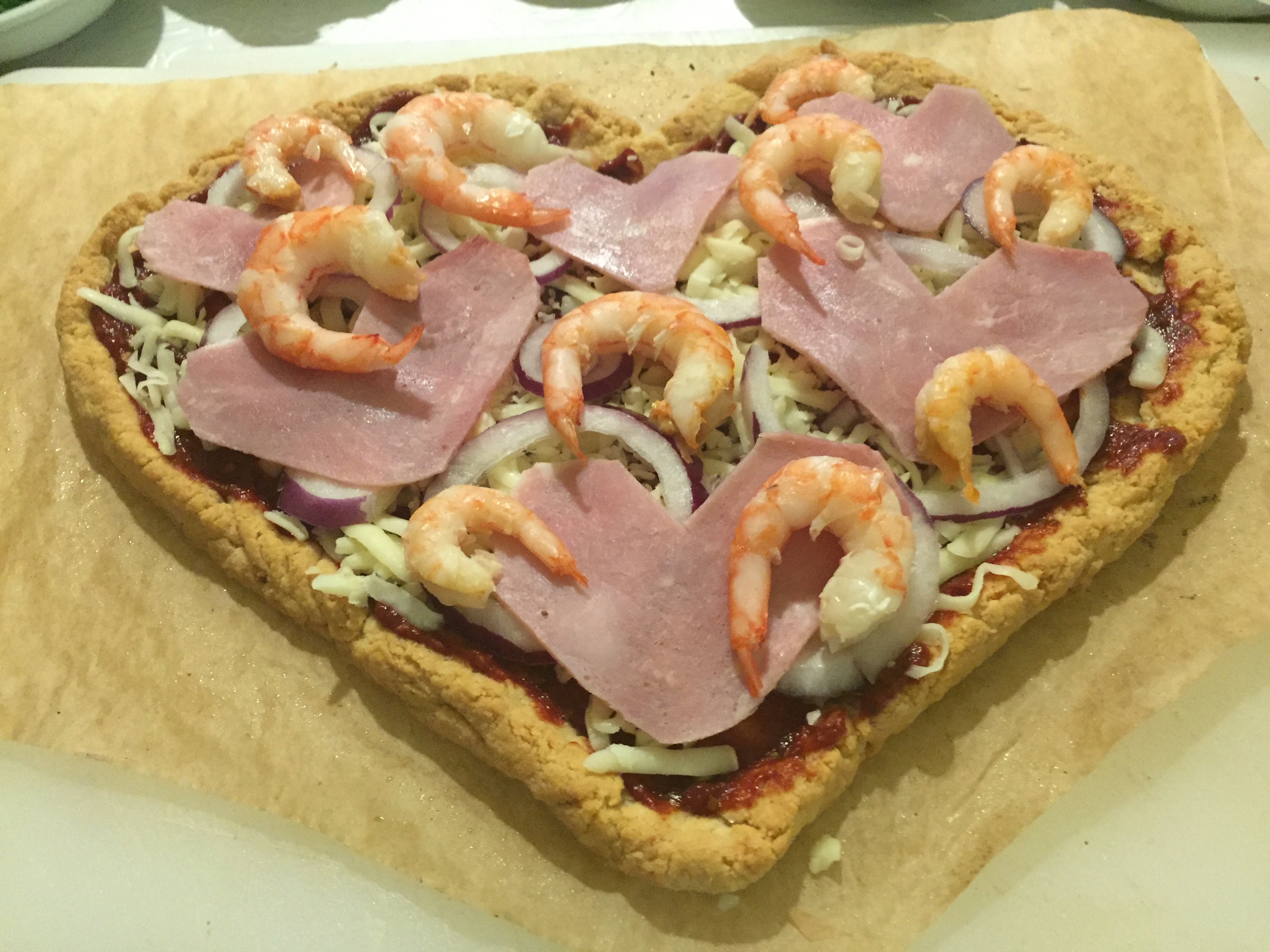 Cookalong on Valentines Day with Frida and Ciana in Frisco, Dallas, Texas USA and me here in Sollentuna Sweden. On Valentines day we made pizza. The crust glutenfree, made with almond flour. Frida and Ciana made their pizza vegetarian with mushrooms and bellpeppers. I made three different toppings. One with white sauce from ricotta cheese and topped with spinnach, onions and brusselsprouts. Another with tomatoesauce, onions and chorizo sausage. The third with tomatoe sauce, ham, shrimps and onions. I mixed mozzarella and parmesan cheese on all three.