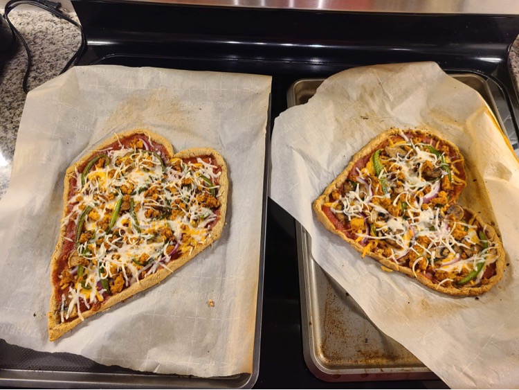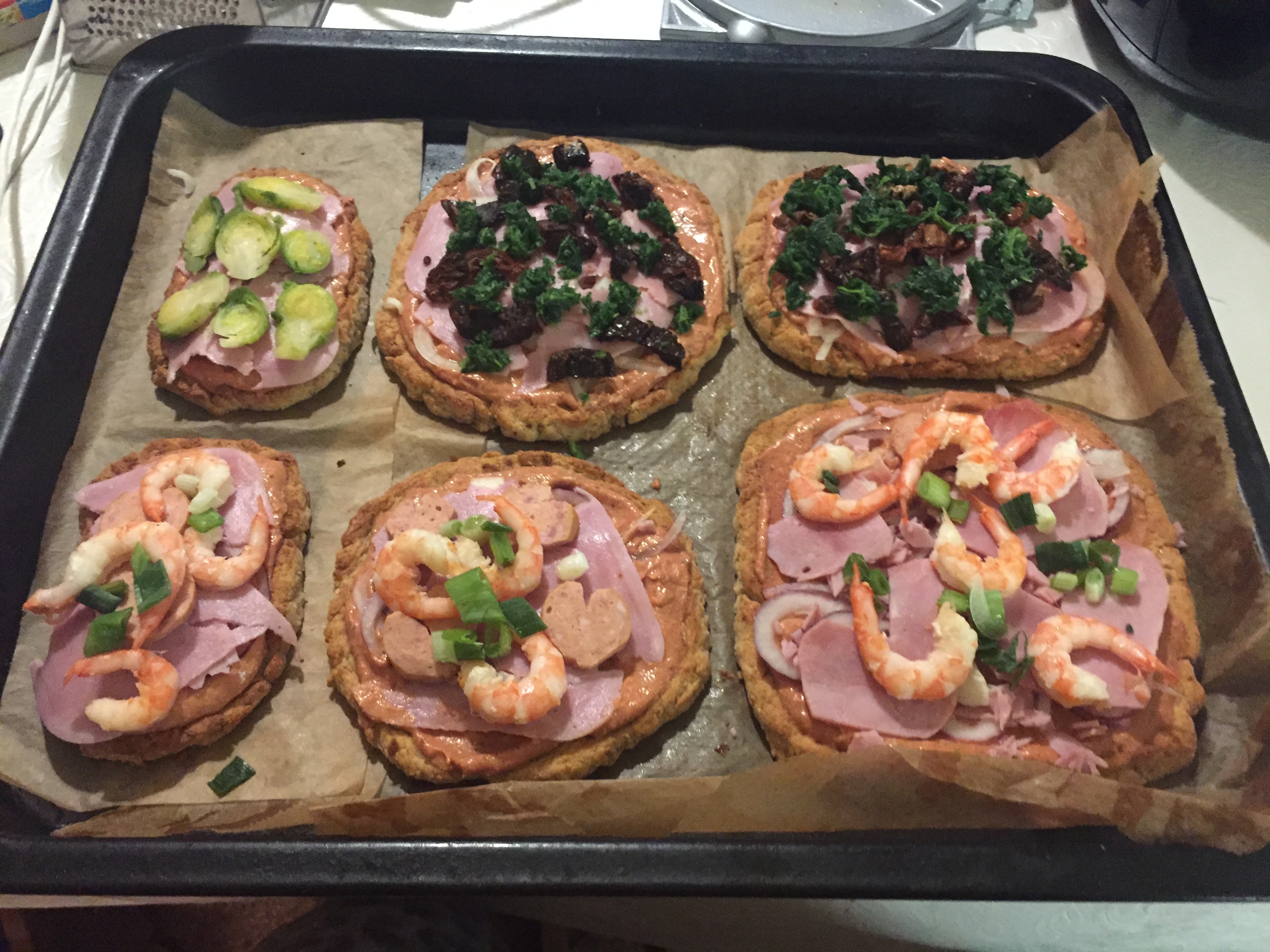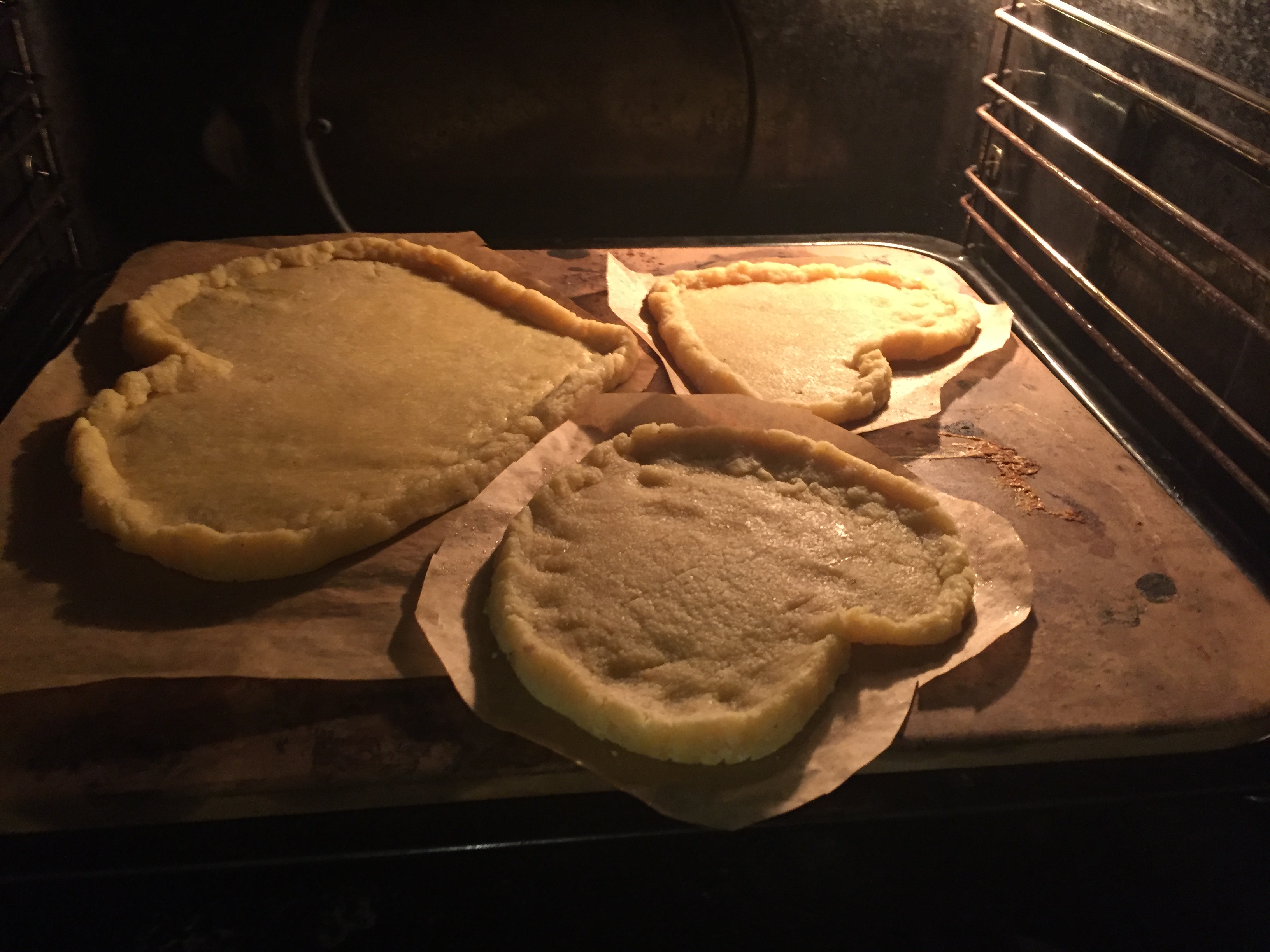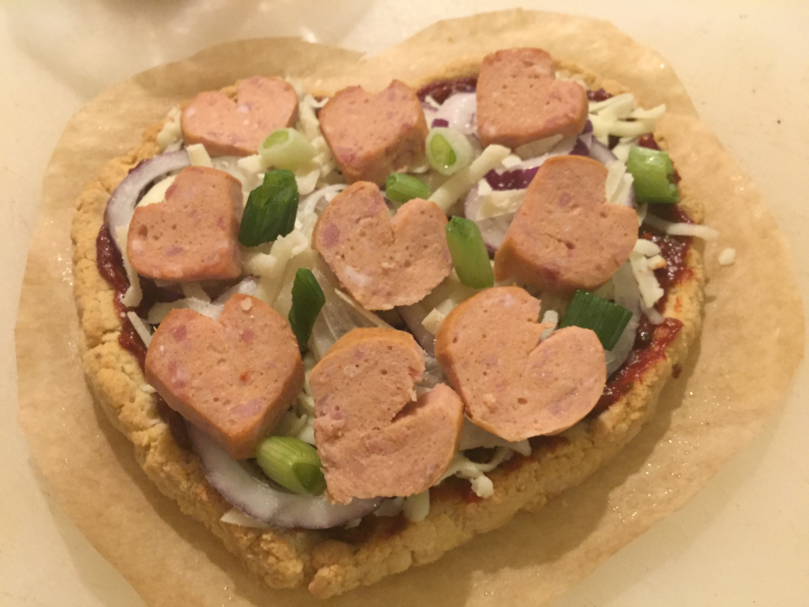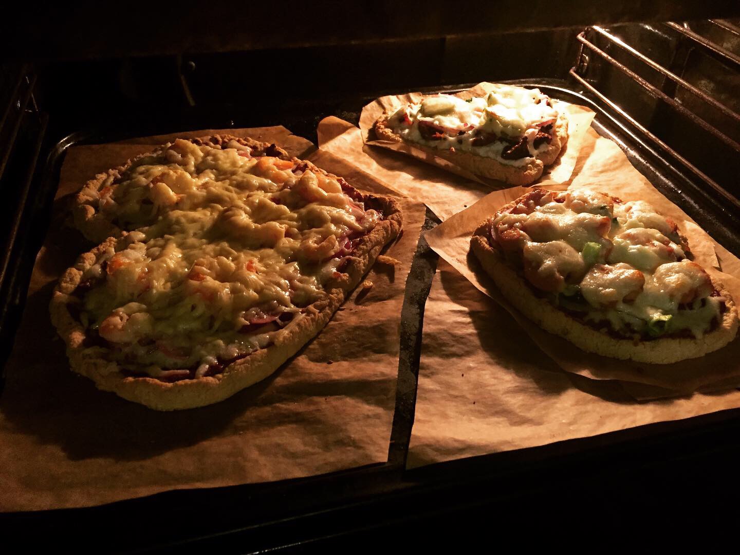 Cookalong on Valentines Day with Frida and Ciana in Frisco, Dallas, Texas USA and me here in Sollentuna Sweden. On Valentines day we made pizza. The crust glutenfree, made with almond flour. Frida and Ciana made their pizza vegetarian with mushrooms and bellpeppers. I made three different toppings. One with white sauce from ricotta cheese and topped with spinnach, onions and brusselsprouts. Another with tomatoesauce, onions and chorizo sausage. The third with tomatoe sauce, ham, shrimps and onions. I mixed mozzarella and parmesan cheese on all three.