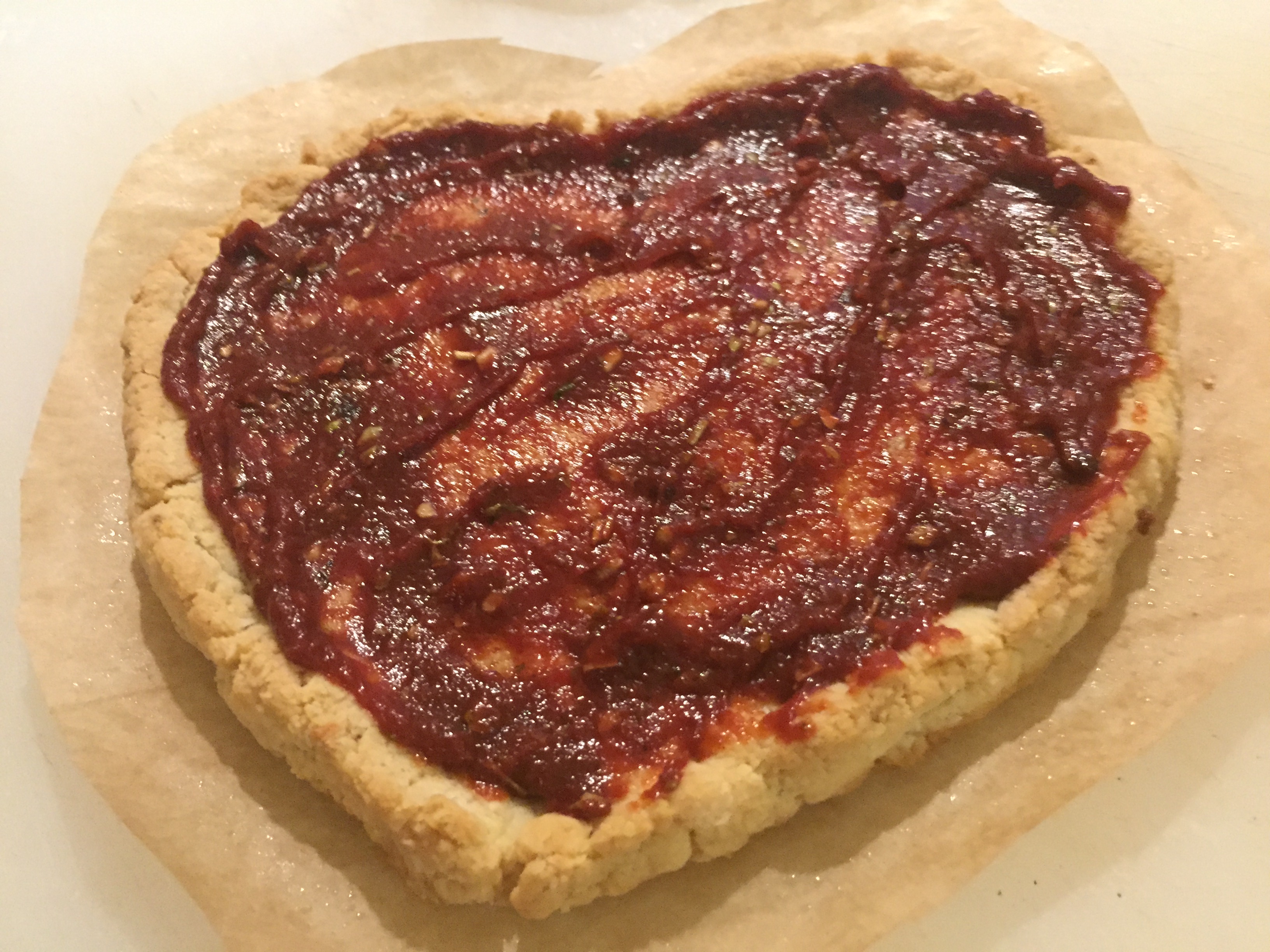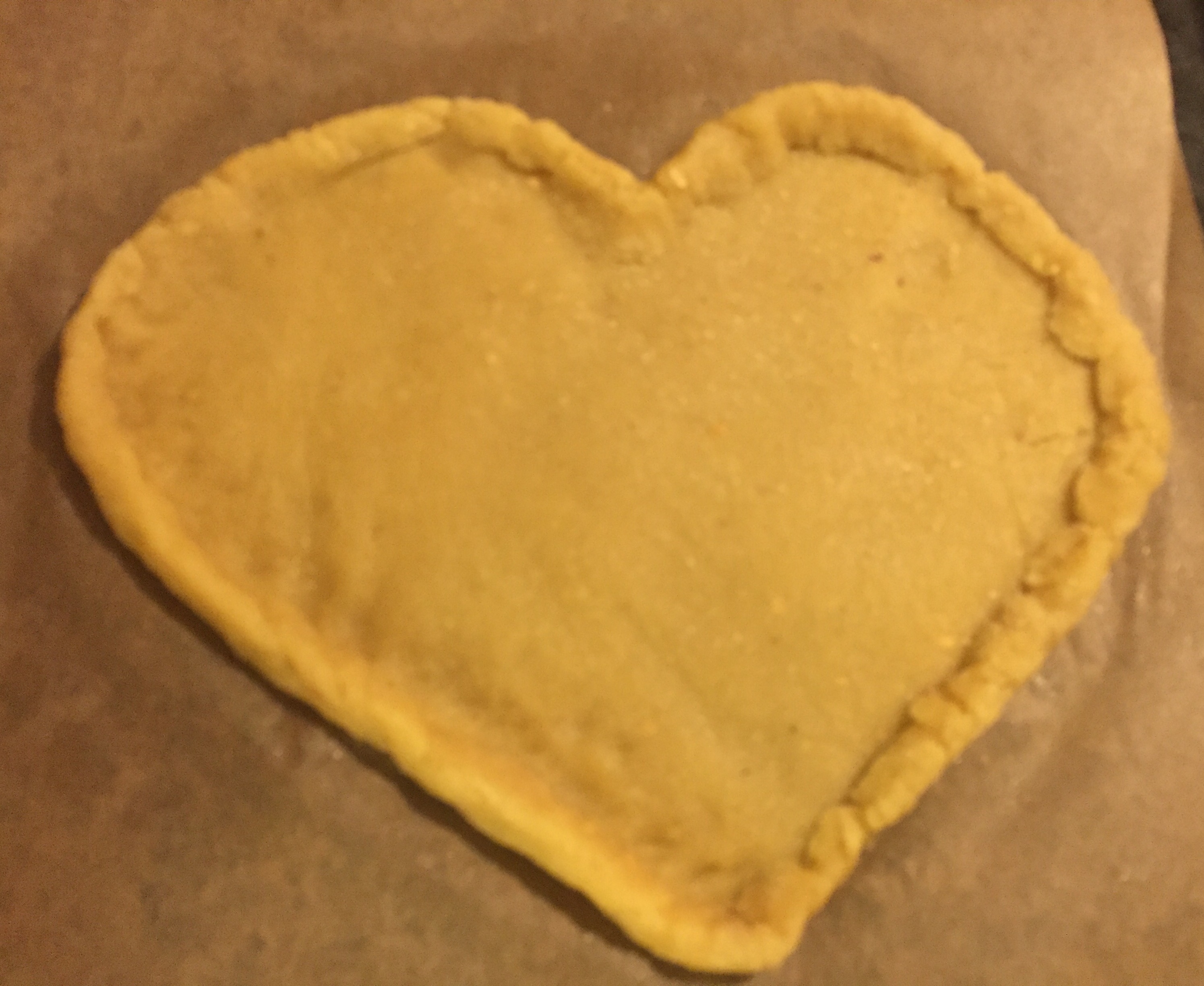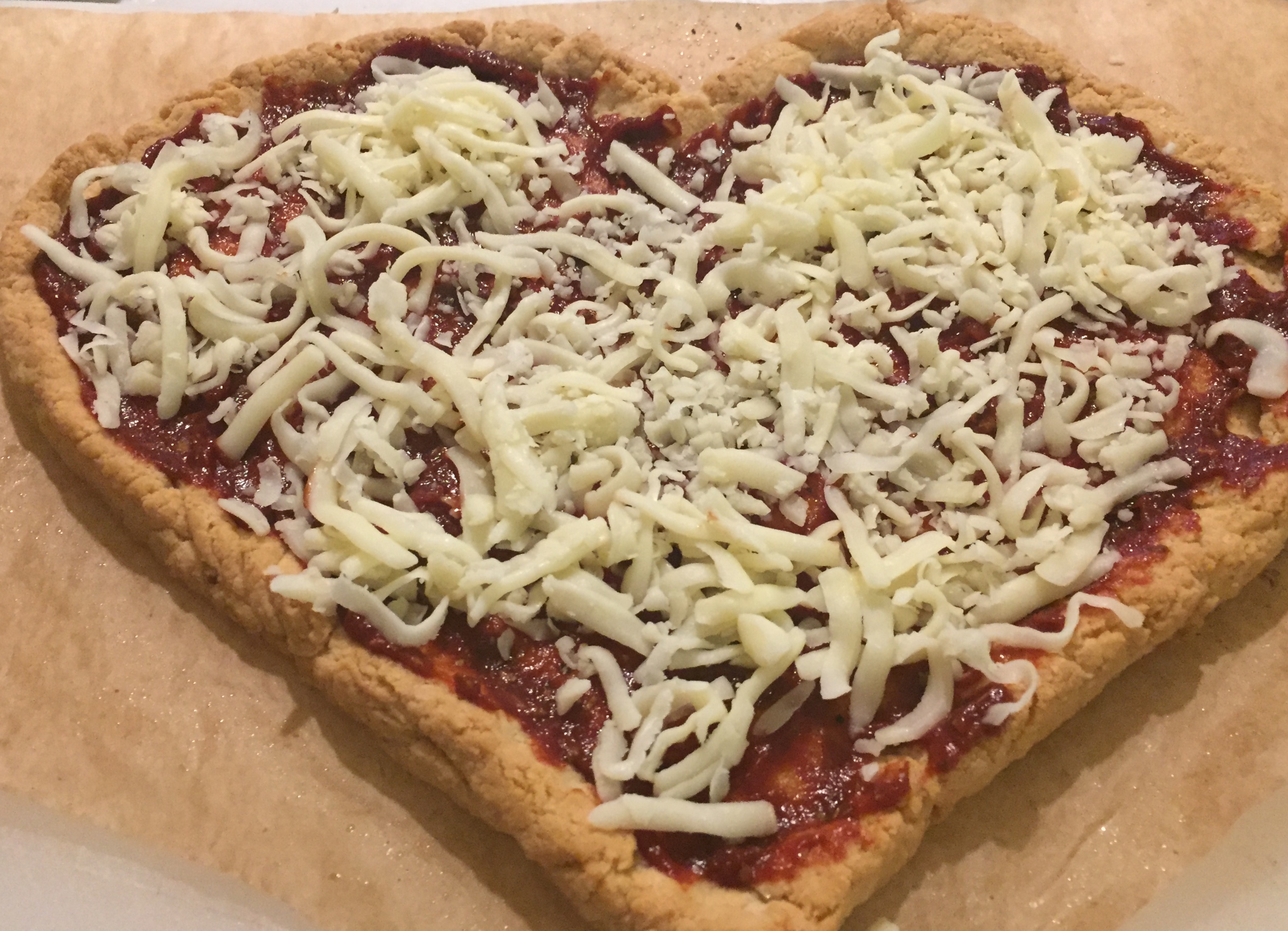 Peel off the top piece of parchment paper, smoothen the sides of the pizza crust to make it pretty, then slide the bottom parchment paper piece (with the rolled pizza dough on it) onto a baking tray. Since it was Valentines Day I actually made mine heart shaped and some different sizes.
