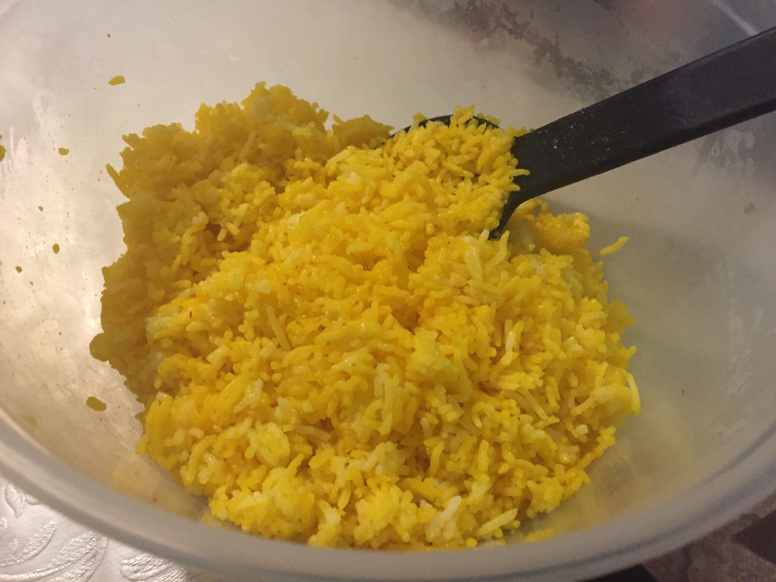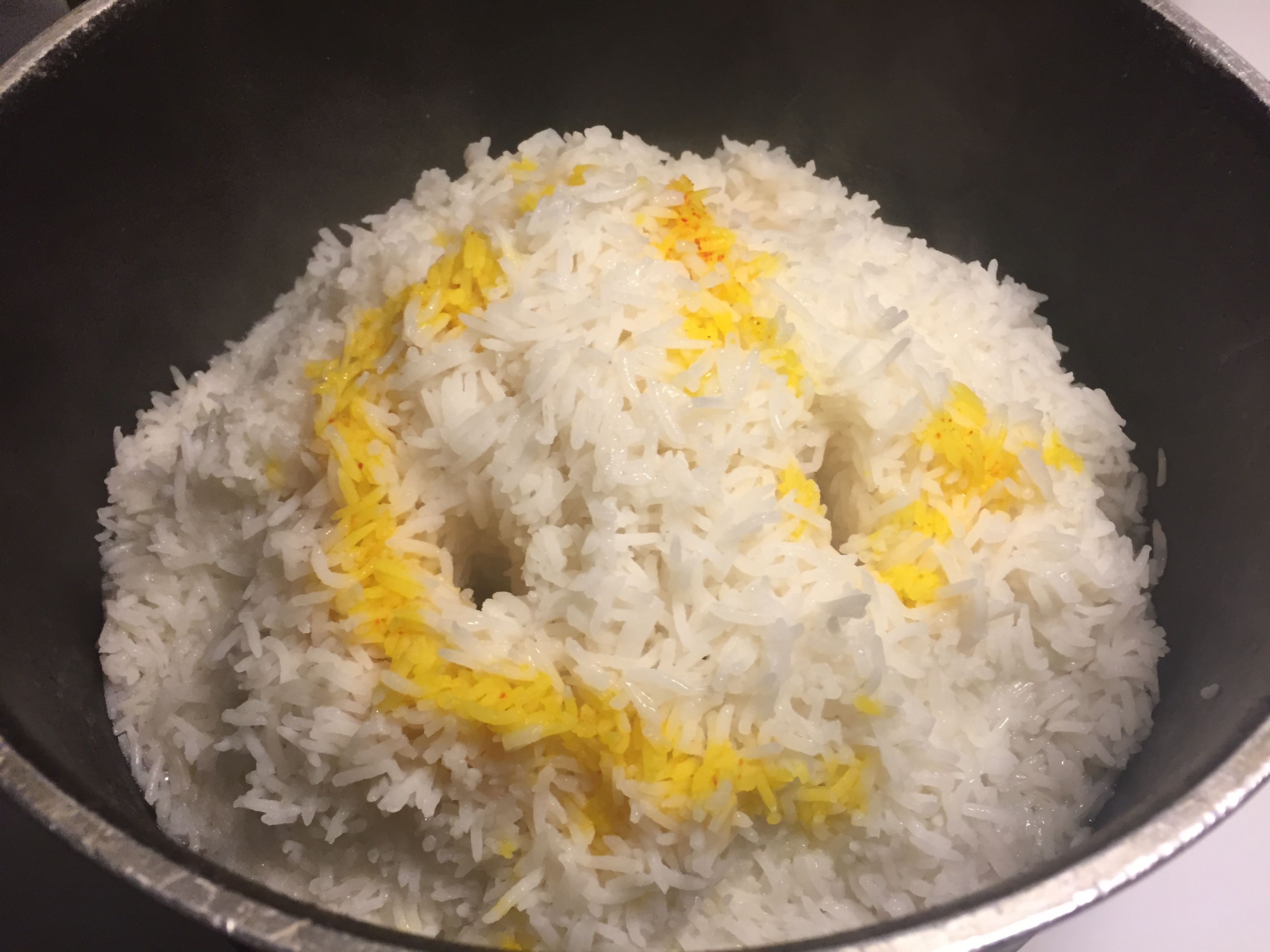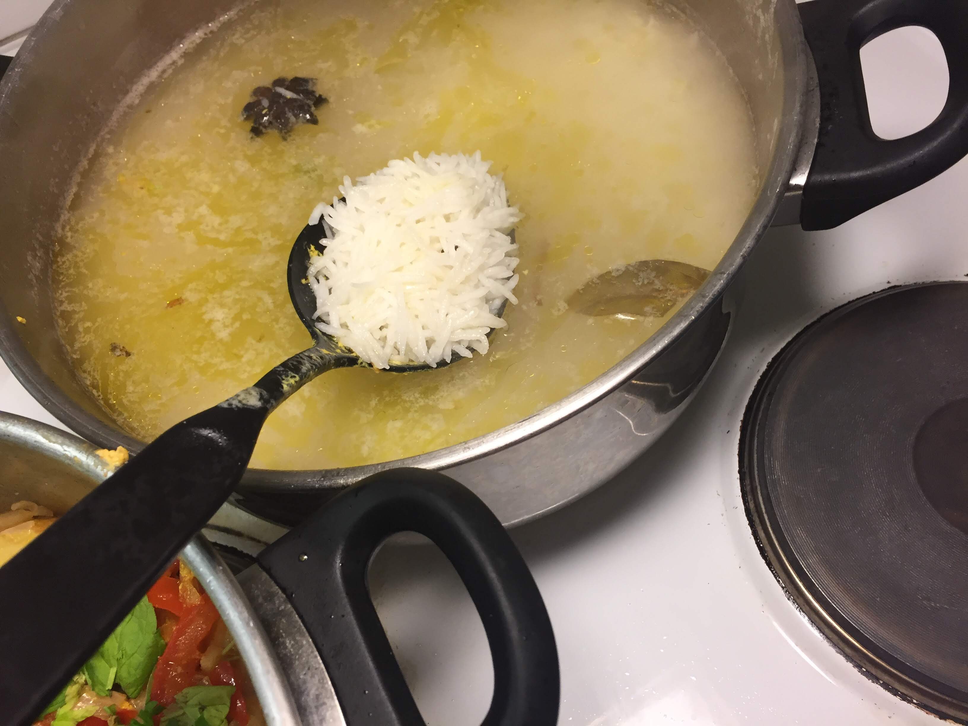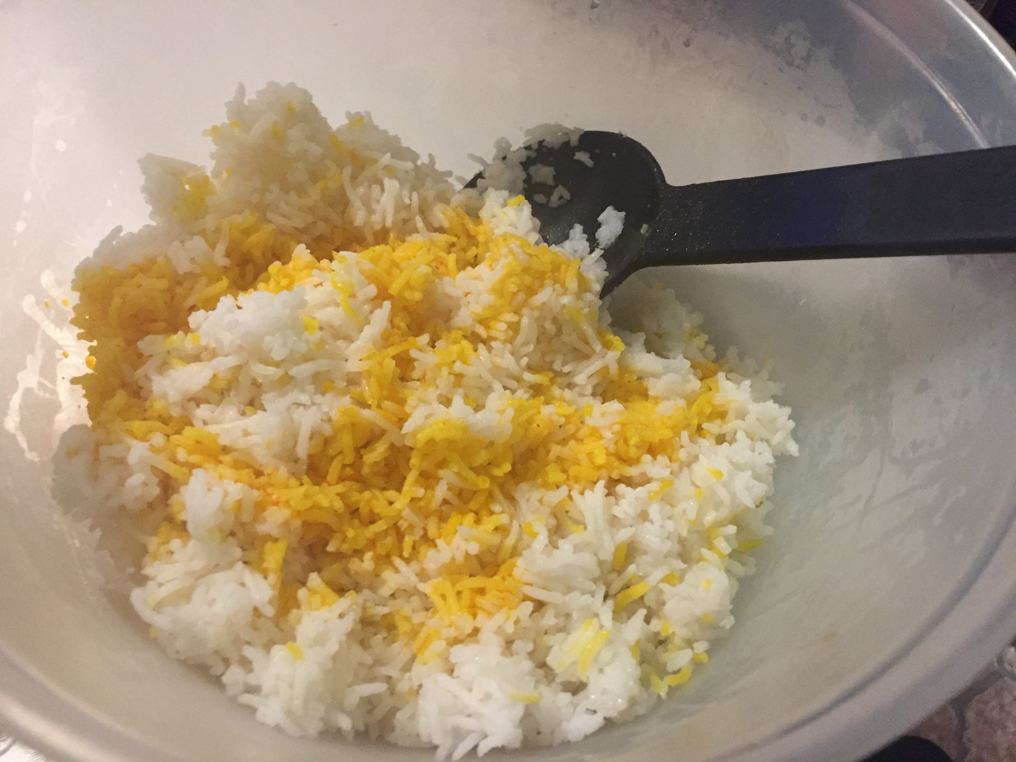 Gently mix the remaining saffron orange blossom water and the reserved carrot/orange syrup to half of the par-boiled rice. Stir so the rice get the saffron color.
