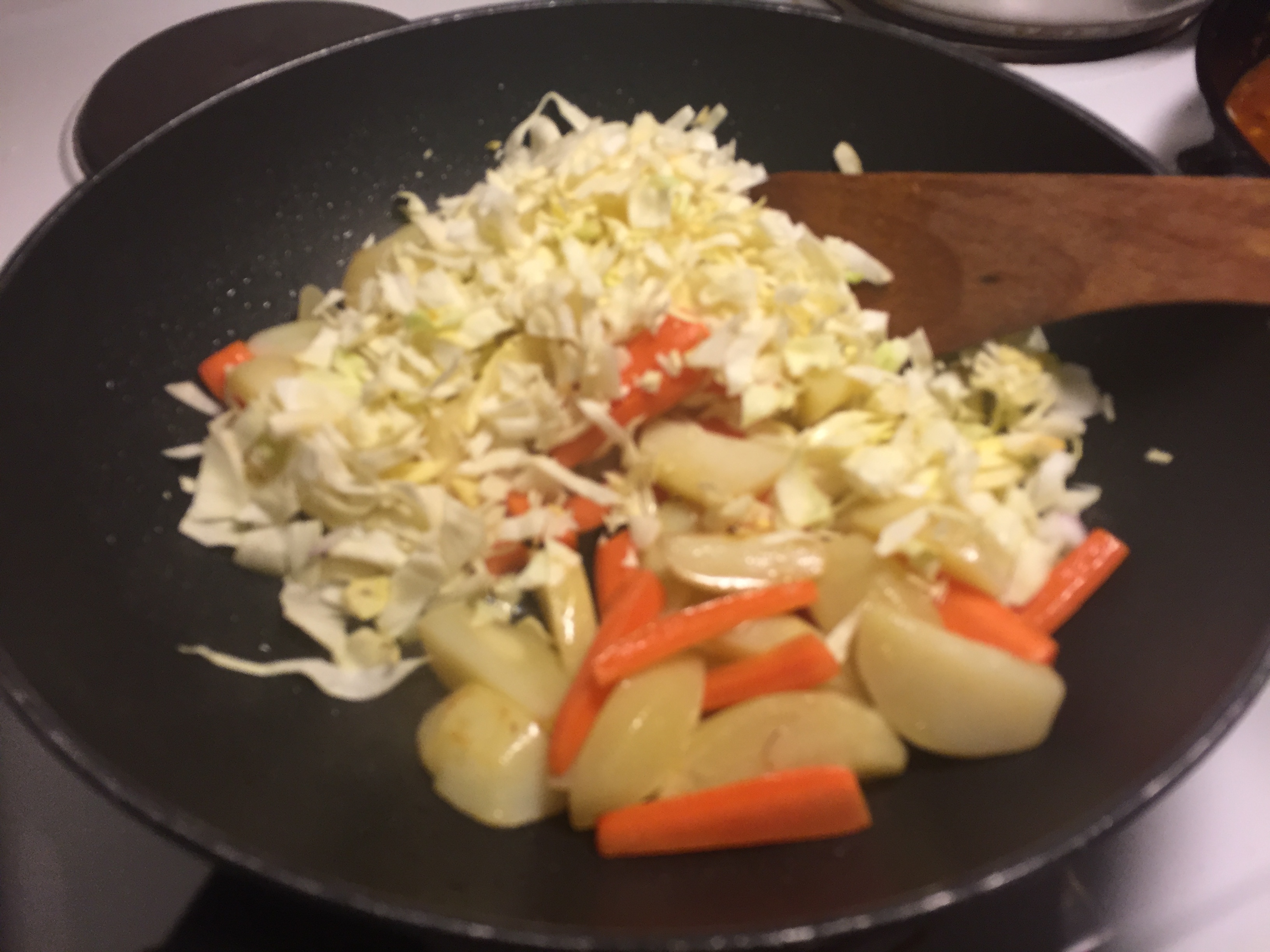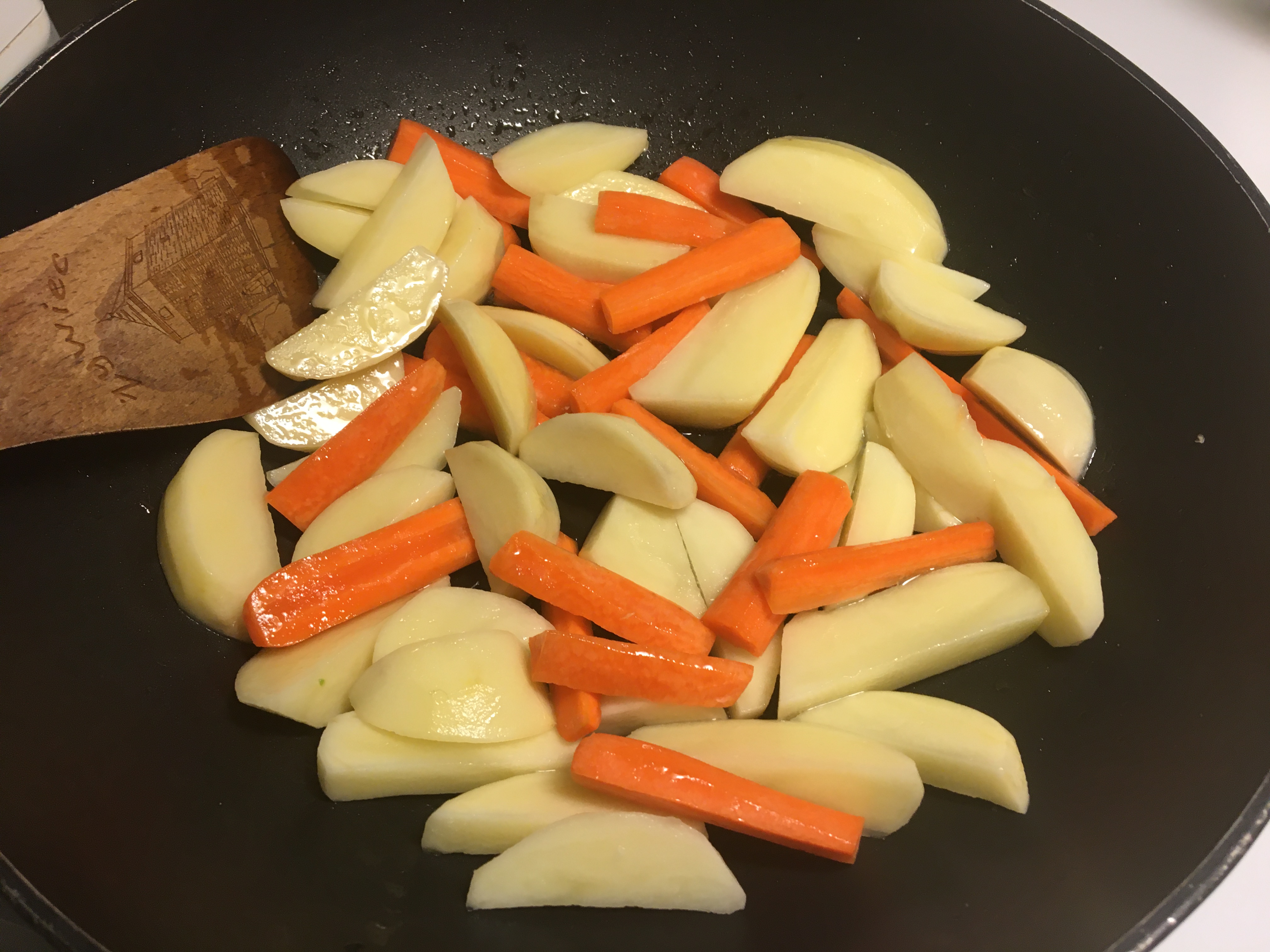 Peel and cut the vegetables in small biteable sices. Chop the onions and garlic. Add 2 tbsp oil to your frying pan. Sweat the onion and garlic for a couple minutes. Add spices and stir for a minute. Add the vegetables and stir around and fry for some minutes. Add liquid/broth to the mix and stir. Add salt and pepper and spices to your liking. Put a lid on your pan and simmer until vegetables are cooked. When it comes to liquid add as much as you like for your curry to cook without becoming to soupy.