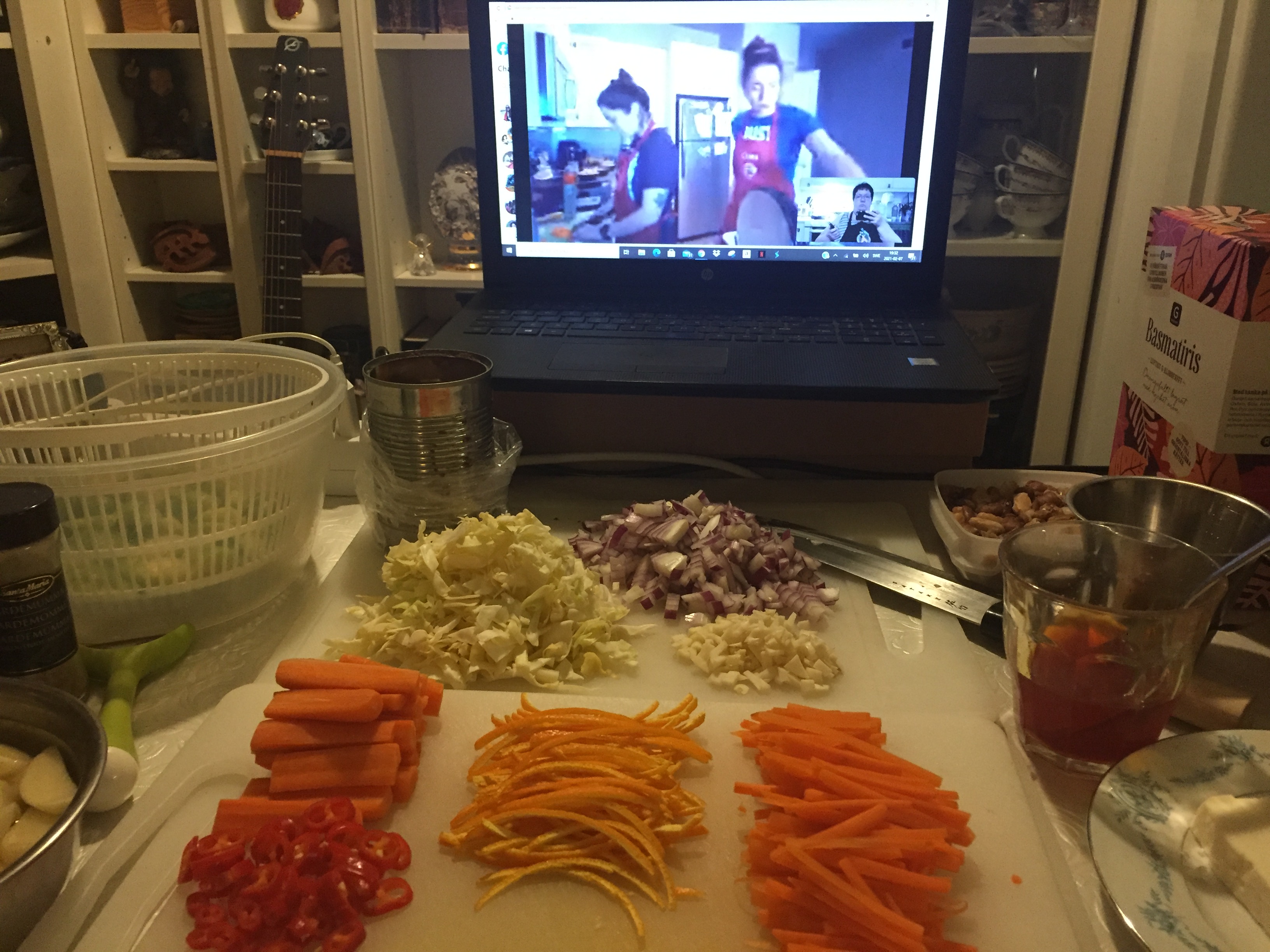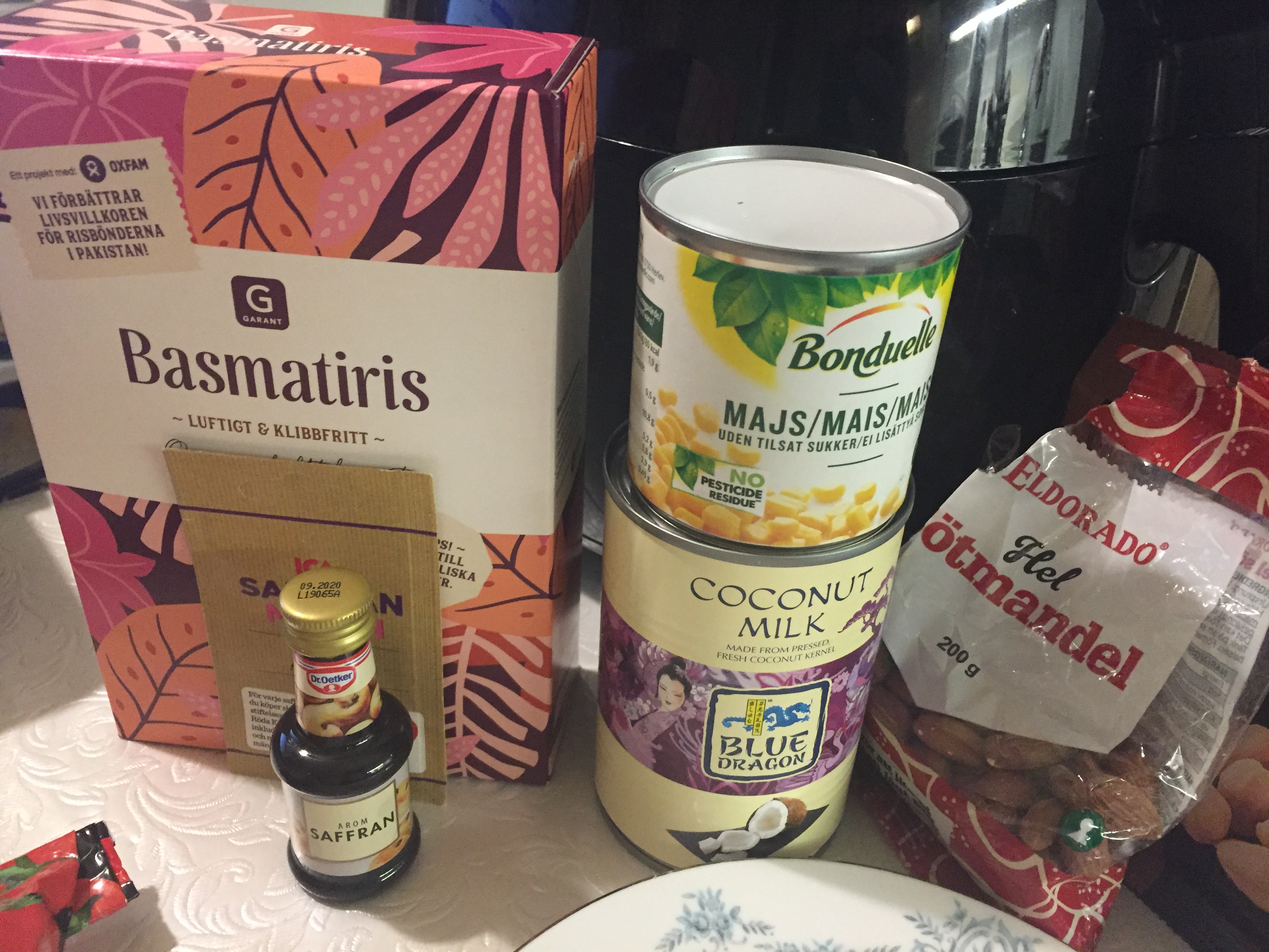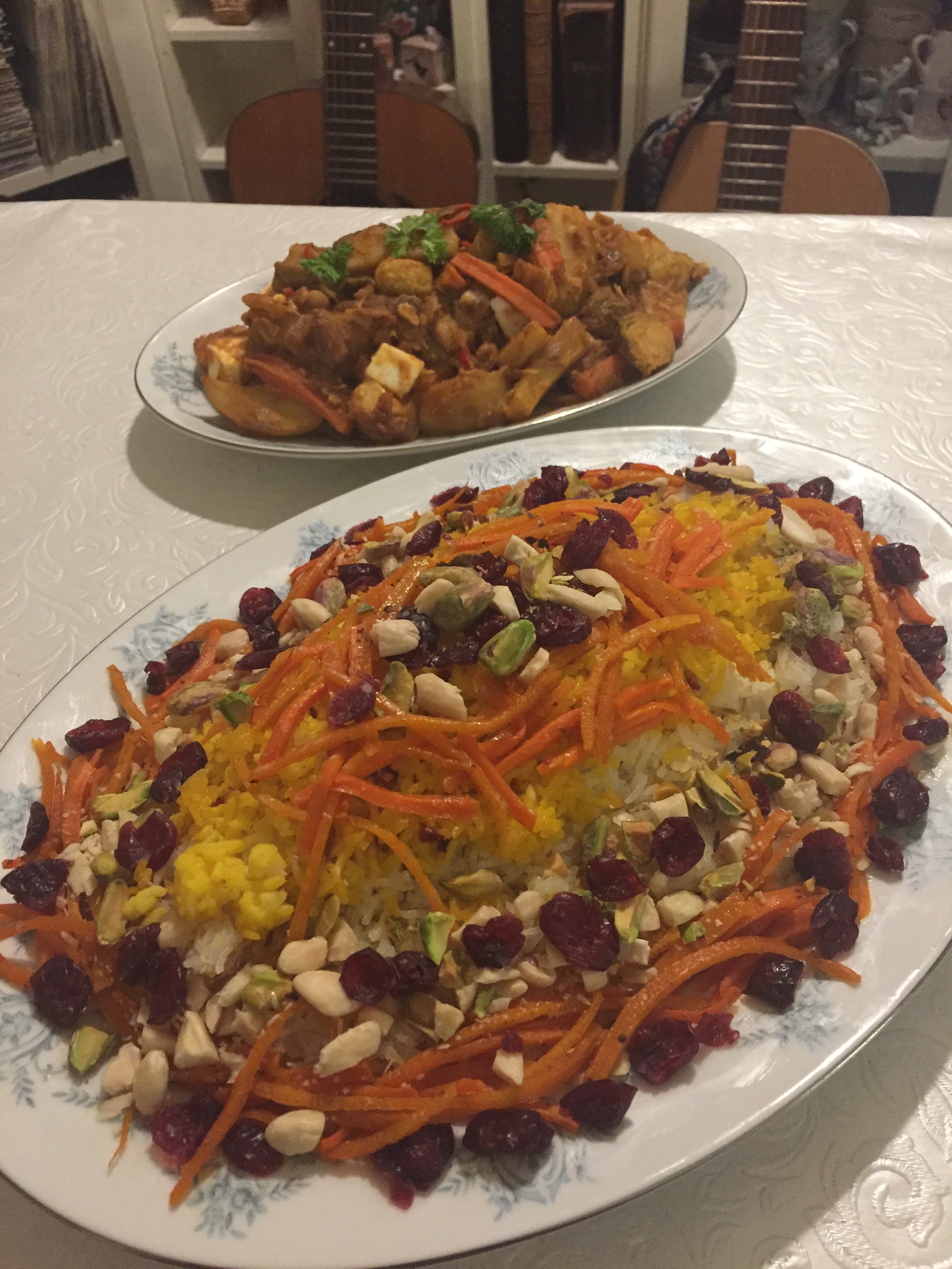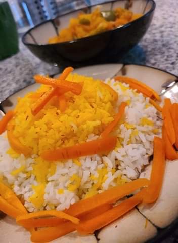 This rice is the most beautiful and tasty rice I have ever eaten. I really discovered a treasure that has been unknown to me until now. Beauty, fragrance and taste! I had decided to try this persian rice at my Cookalong with Frida and Ciana. They in Frisco, Dallas Texas, USA and me here in Sollentuna, Sweden. We made it with a Vegetable Curry in tomatoe sauce. The rice is flavored with saffron, which gives it its golden color, along with orange zest and carrots glazed in Saffron and topped with berries and nuts.