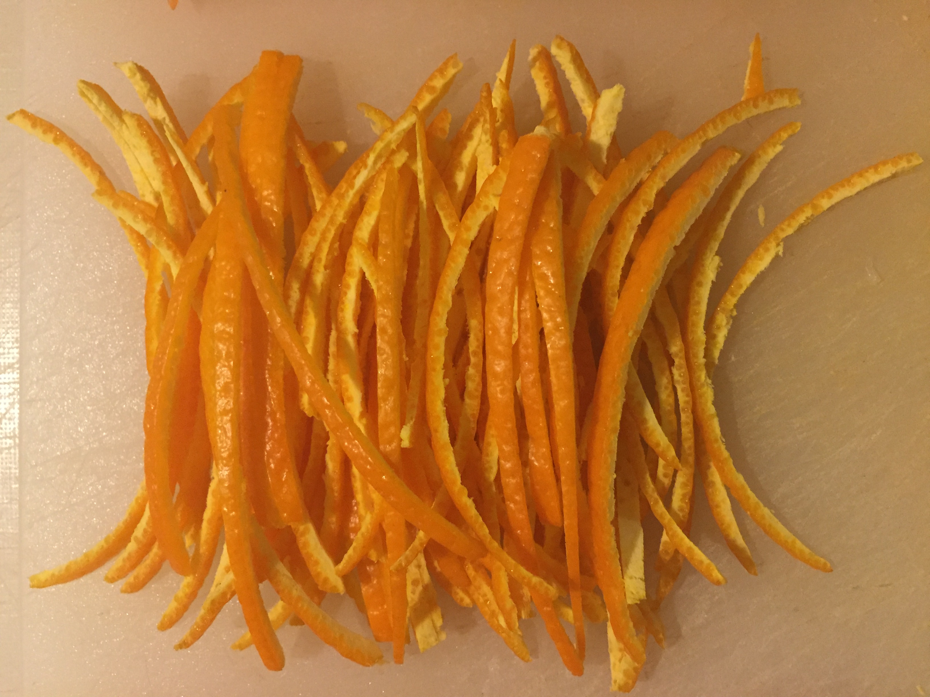 Set a small pot of water to boil. Use a vegetable peeler to take thick strips of rind off the oranges, including a little of the white pith. Slice these strips cross-wise into very small slivers. When the water is boiling, drop the slivers into the water and cook 1 minute. Drain and rinse with cold water. Set aside. (This cuts the bitterness of the orange rind.)