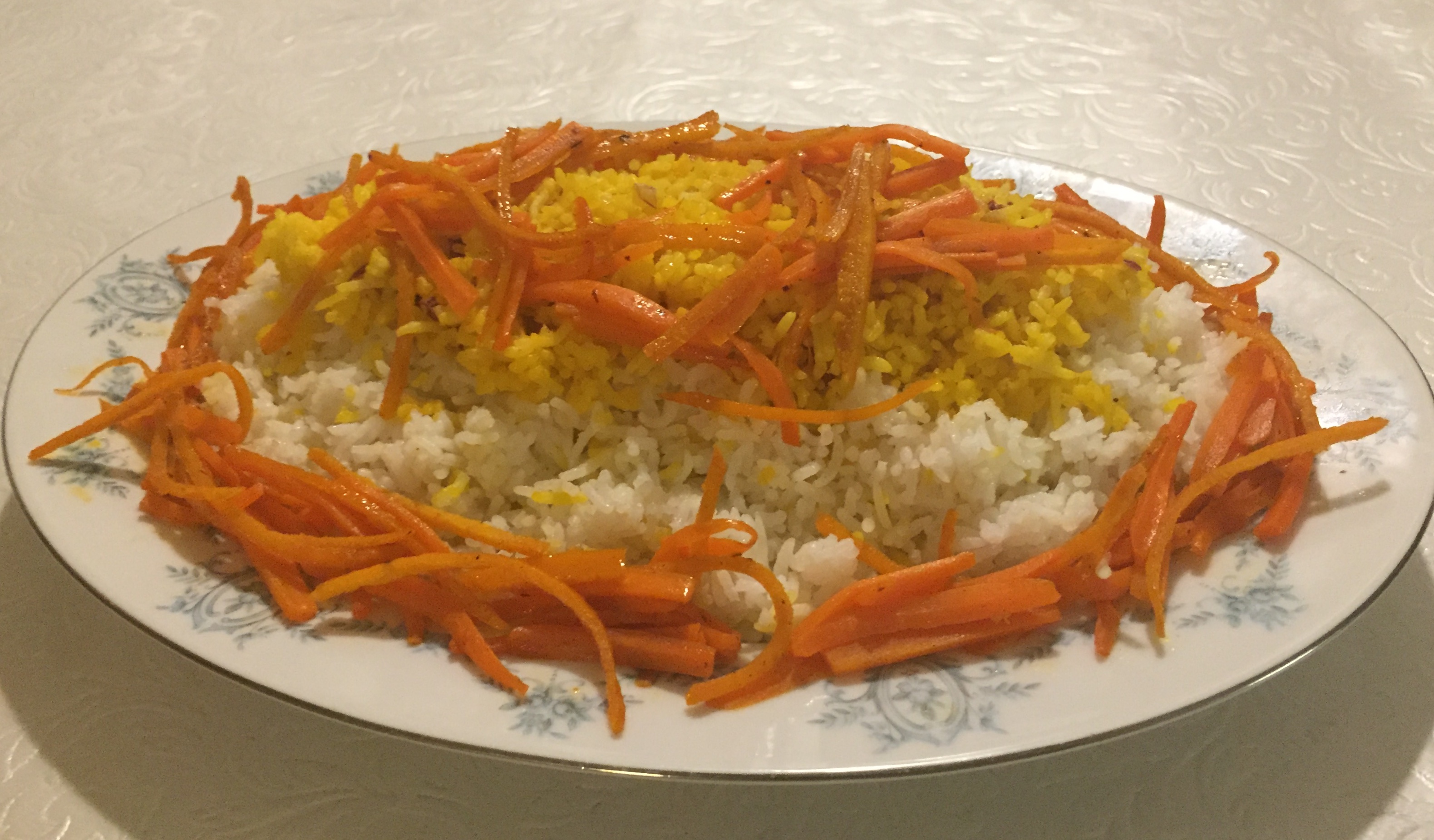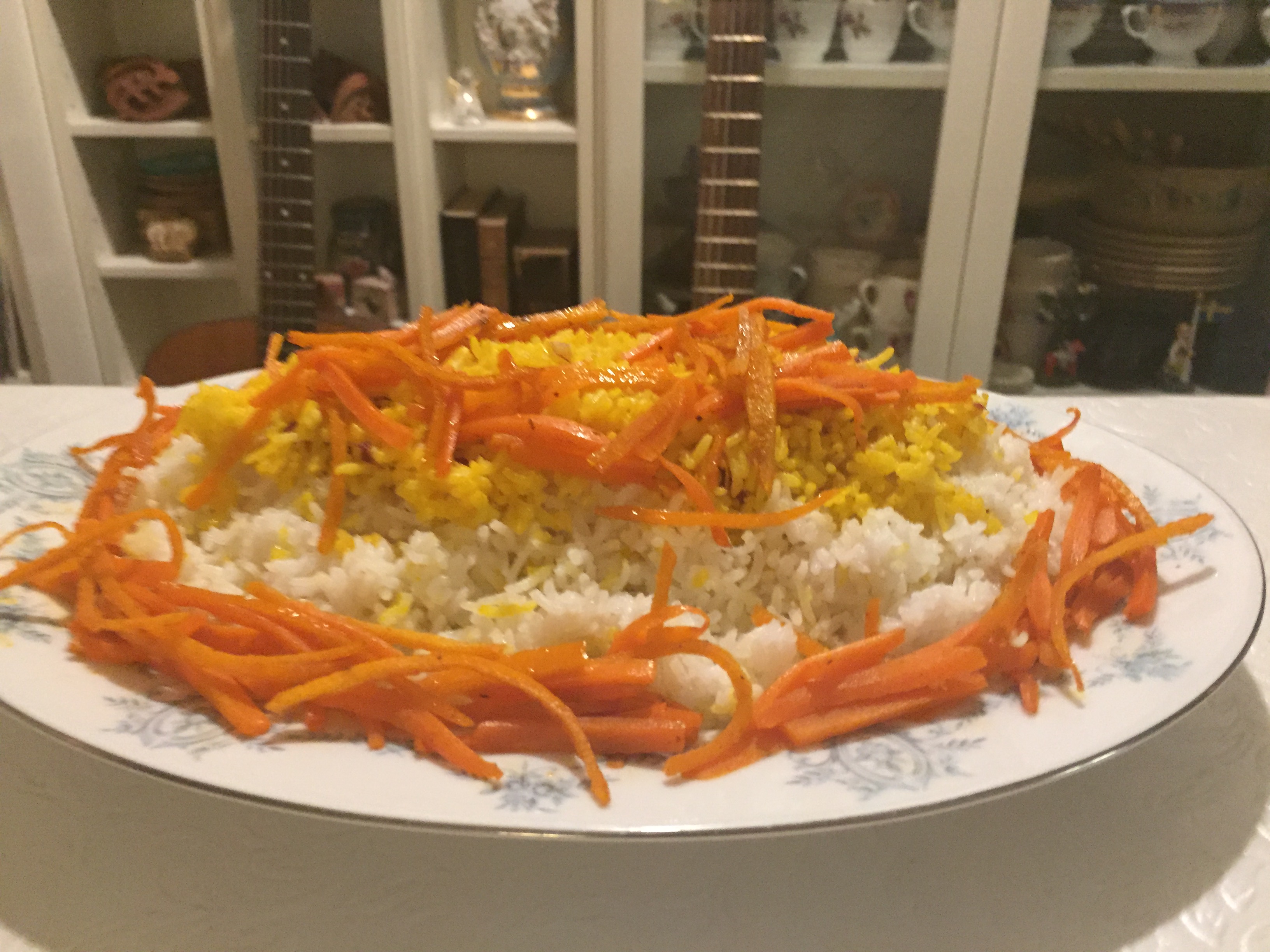 To serve, arrange on a serving platter layers of the white rice, than the saffron rice, then the caramelized carrot mixture (discarding the cinnamon stick), then the barberry/nut mixture. It will look beautiful and taste great!