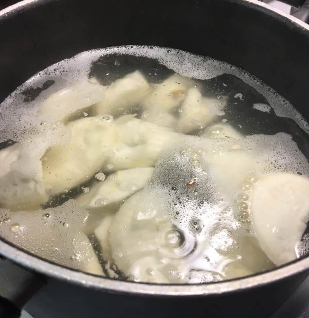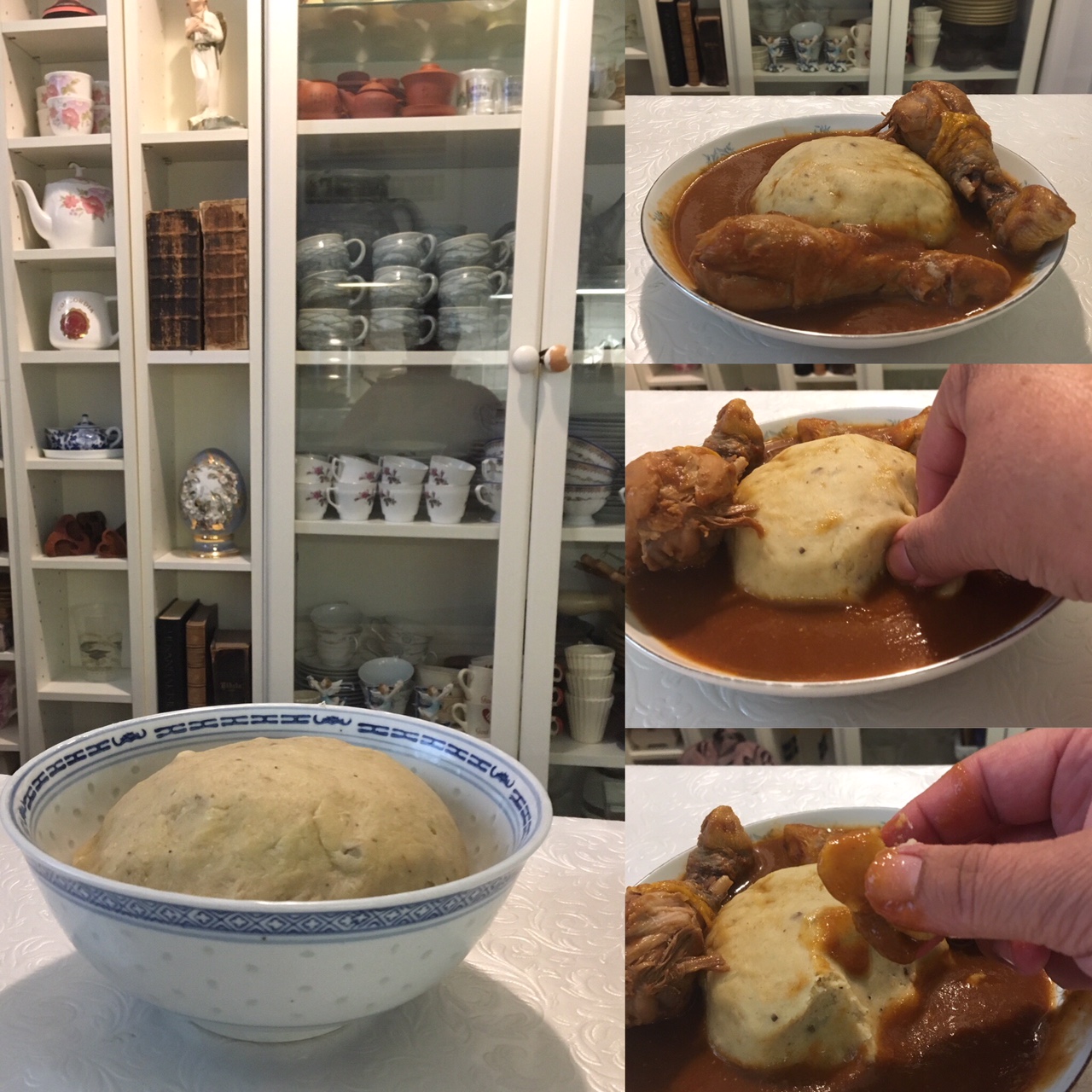 Mix the ingredients cold in a saucepan. Set the pan on the hot plate (number four heat) and stir constantly until it forms a thick smooth batter. Stir the mixture quickly and firmly until it is firm and smooth as a dough. Serve immediately with the soup. Do you think it’s hard to get it smooth enough by touching by hand in the pot, work it some in the mixing bowl of the food processor. It is important that it has been heated long enough, so it has become smooth and the taste of the potato flour has disappeared.