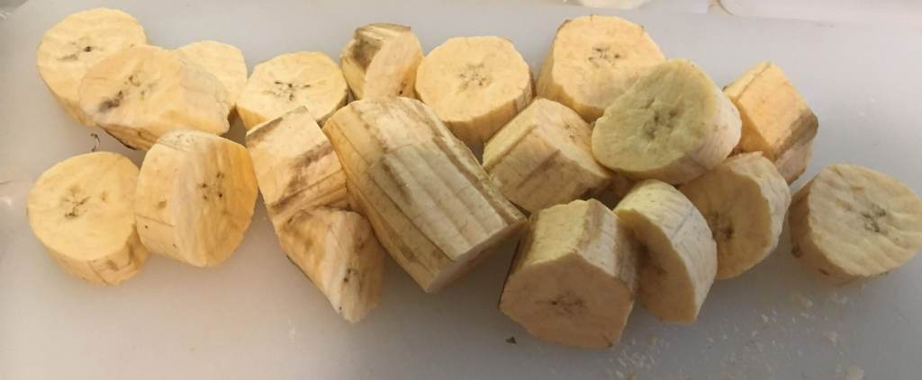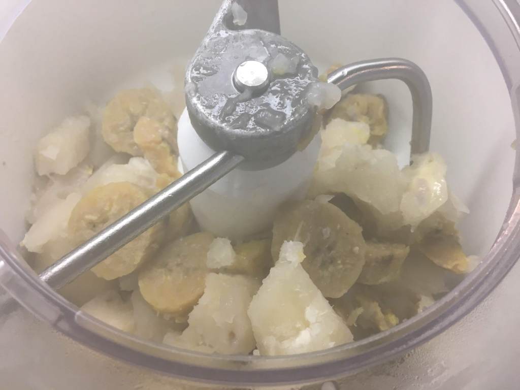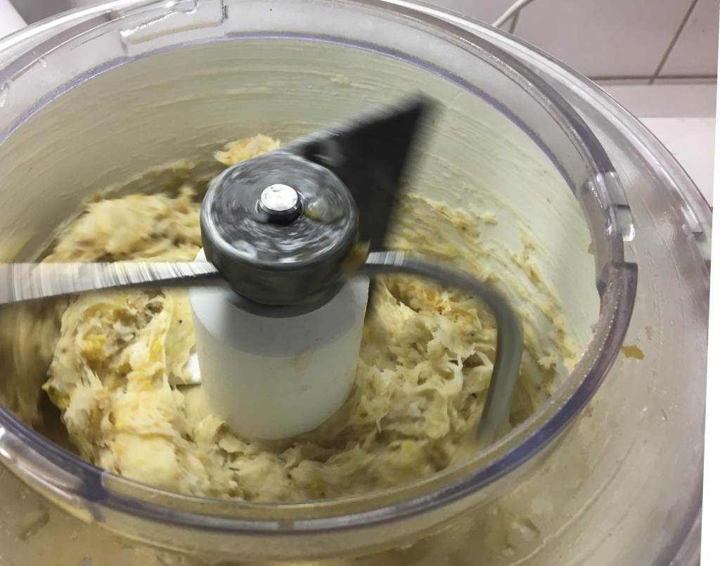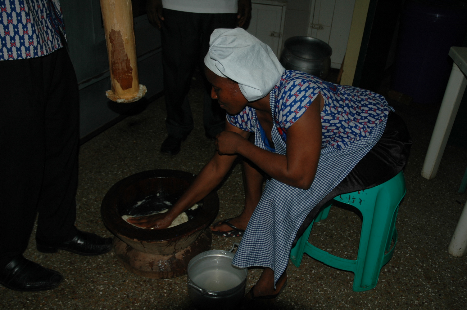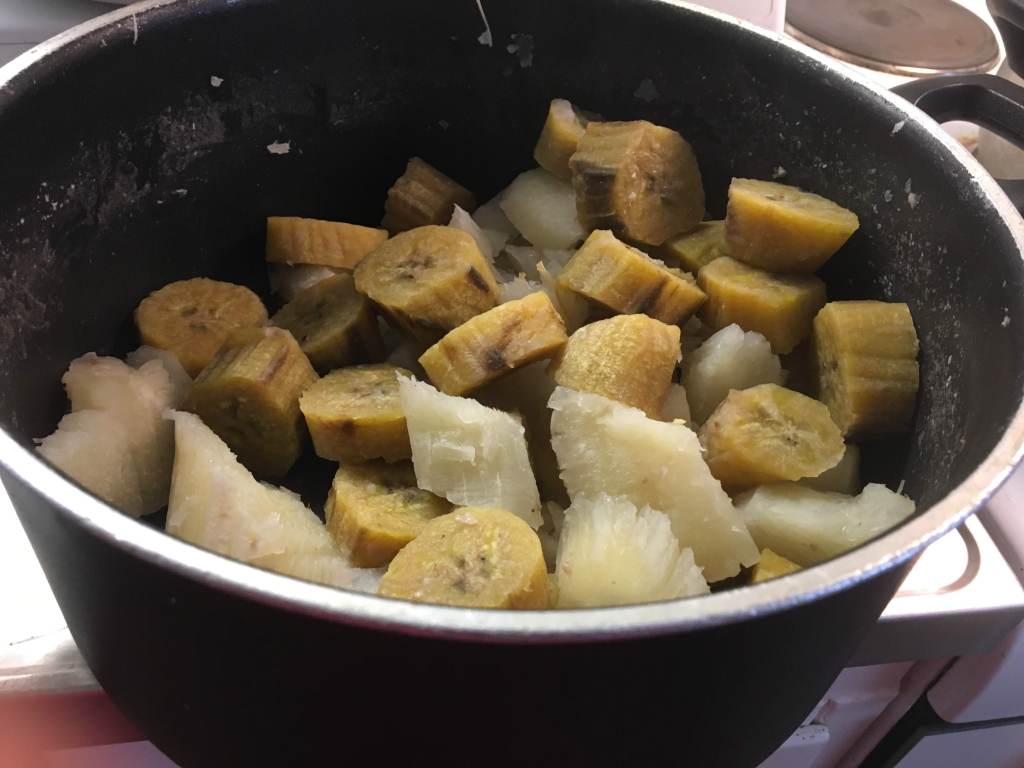 In Ghana the Fufu is pounded in a large wooden mortel and it takes two people to do the job. Here at home I used my Foodprocessor. However I also have a Ghanaian mortel I could use the traditional way. It is a skill though to pound fufu.