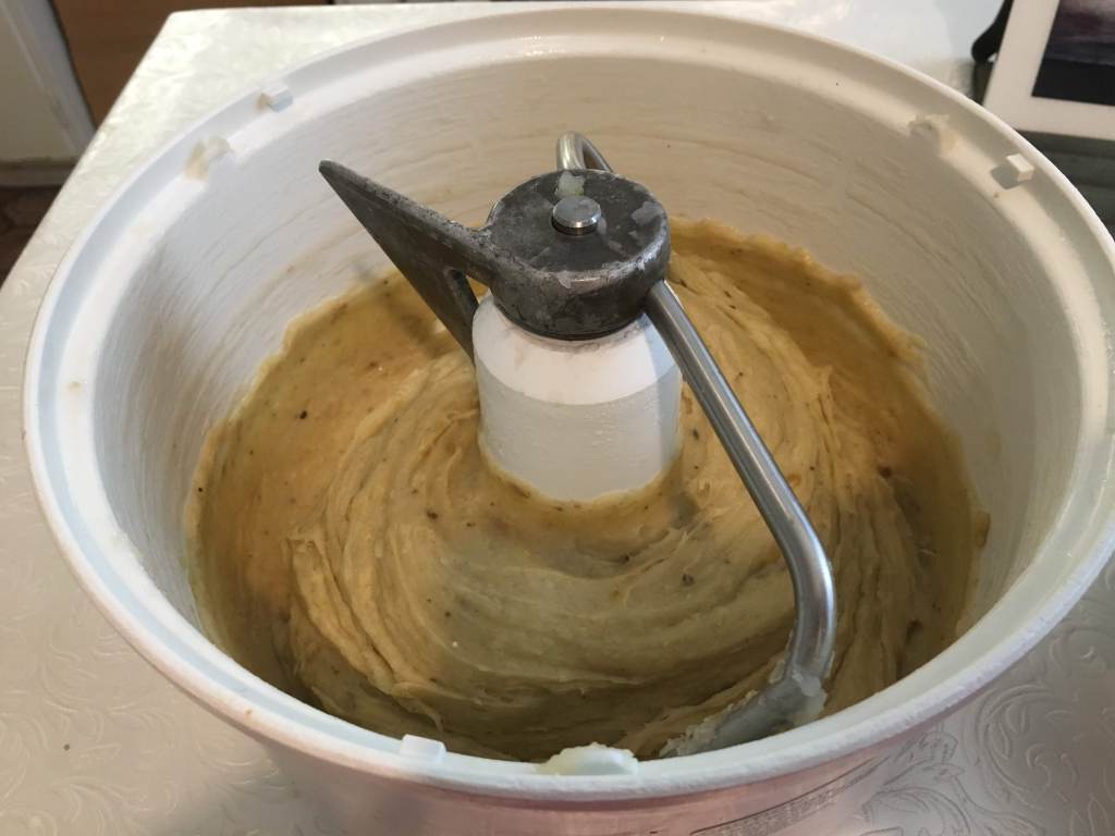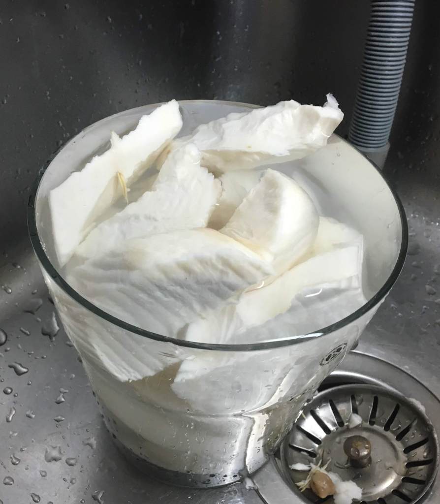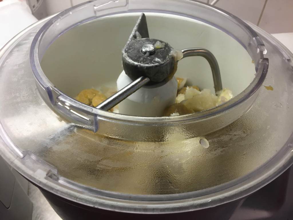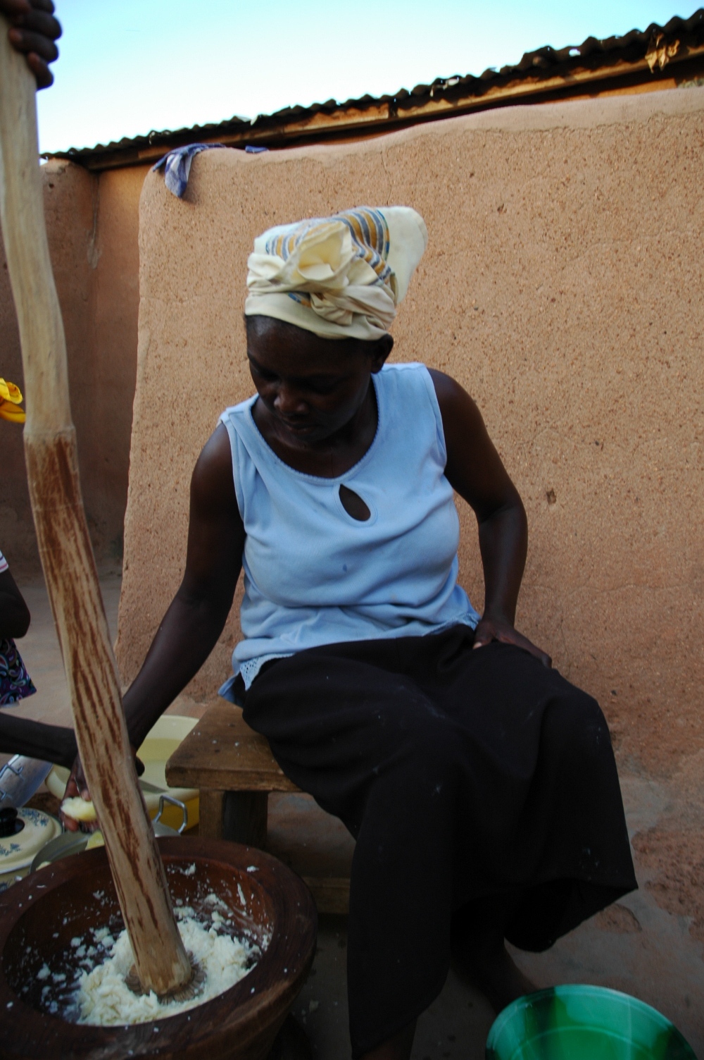 In Ghana the Fufu is pounded in a large wooden mortel and it takes two people to do the job. Here at home I used my Foodprocessor. However I also have a Ghanaian mortel I could use the traditional way. It is a skill though to pound fufu.