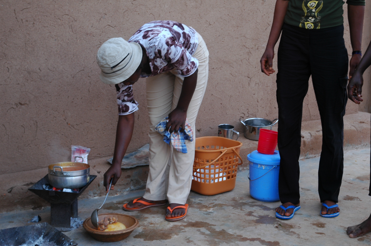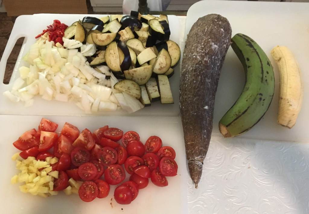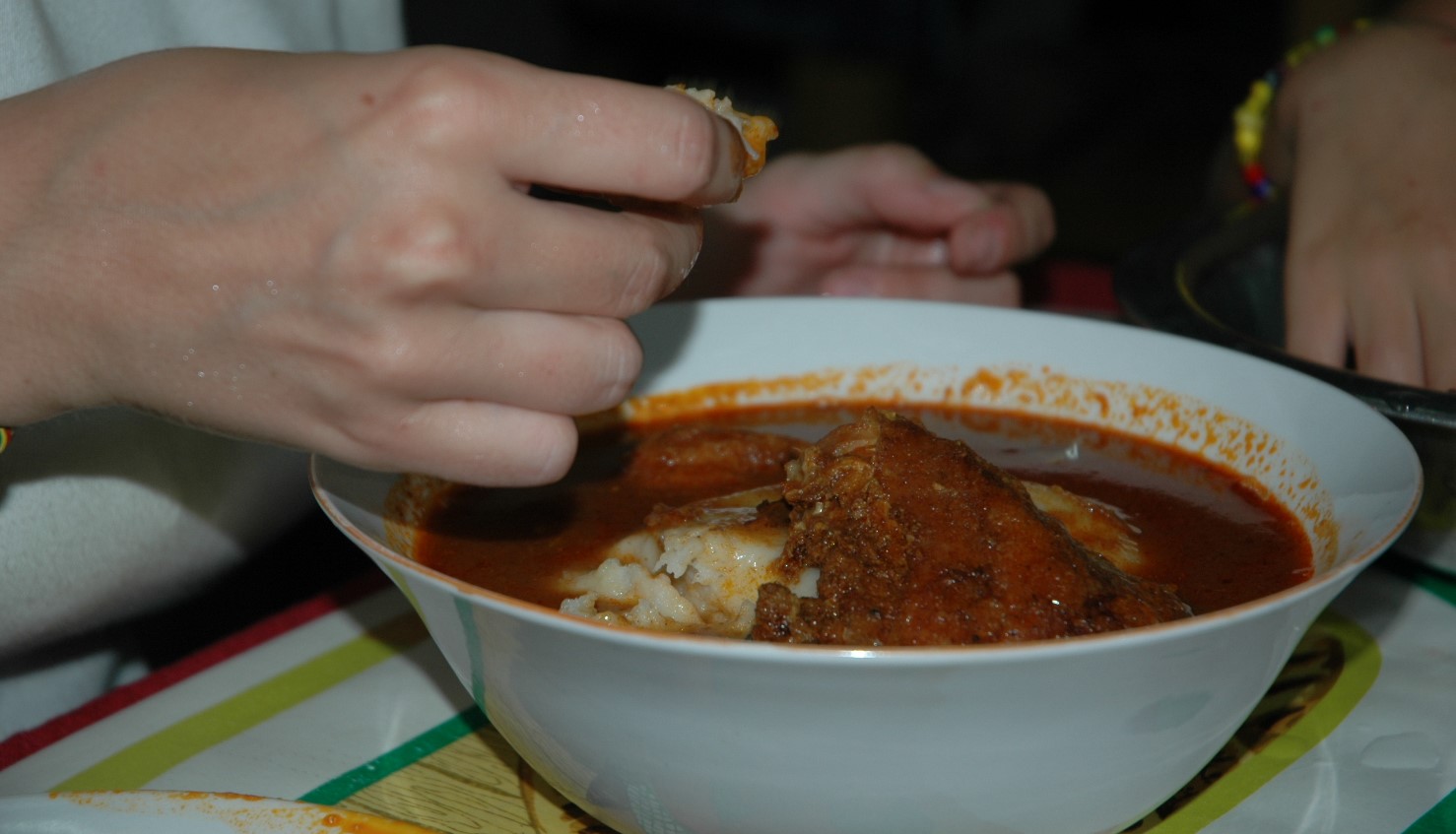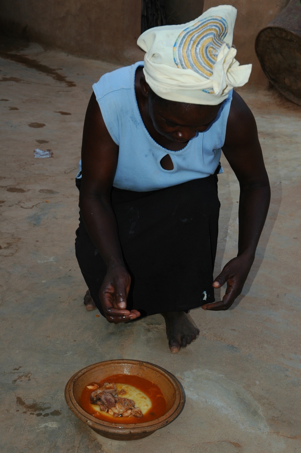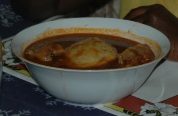 Meat in the soup – the most common in Ghana is goat meat or chicken. But you can take any meat whatsoever, and cut into pieces. The chicken you put in whole parts. The meat should be in some large pieces which you then take with your fingers and eat.