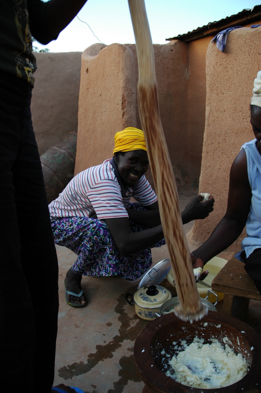 Peel the yam and split it into pieces. Boil it until it is soft and you can easily stick a fork in it (as boiling potatoes). It should not be cooked too soft because then the Fufu gets too loose. When it is boiled put it in the food processor (use the knife you chop vegetables with) Do not take too much at a time, a few pieces such as three pieces about the size of three potatoes. Mix with the knife until the pieces are chopped. Continue mixing until the yam is a smooth lump, like a dough. There is so much starch in the yams that it changes into the consistency of smooth dough when you mix it. It should be a smooth little chewy dough. If you want the fufu little softer, you can add a little water, but be careful so it does not become too soft. When you have the smooth dough put it in a deep dish and serve. Pour sauce over and add the meat and put in the dish. Then you eat with your fingers, take a piece of fufu, dip in the soup, and even eat the meat.