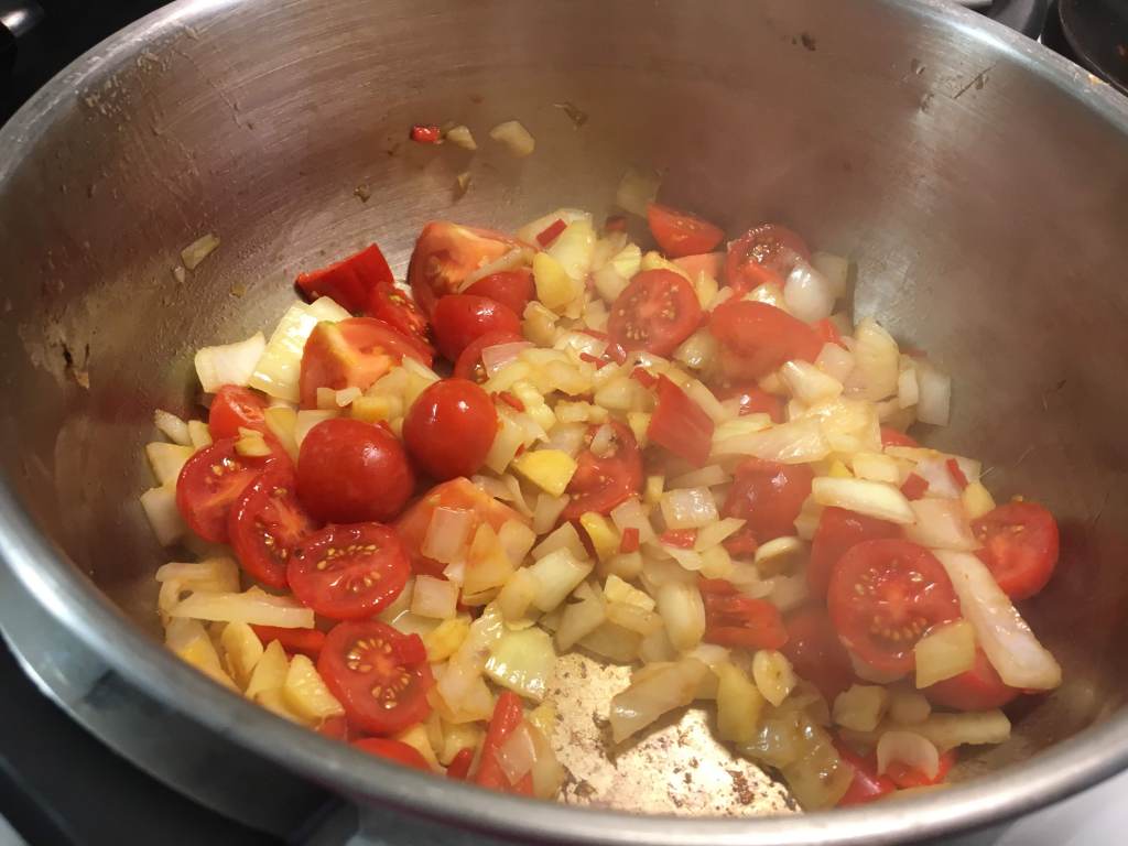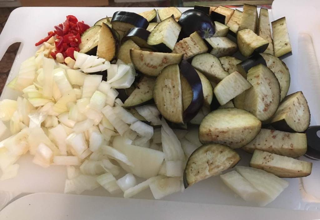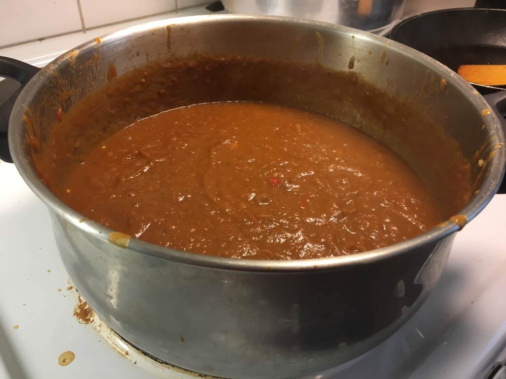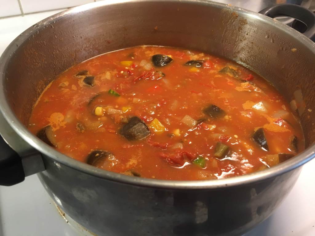 Chop the ingredients by hand or in a blender. It should not be much water in, then the soup is too thin. It becomes liquid of the vegetables when they are cooked. How much to take of each vegetable depends on how many are going to eat. For four servings you can take about five chili peppers, 2 aubergines, four tomatoes, 1garlic, 3 onions and half a can of tomato paste. Aubergines should be yellow, but you can also use blue. The aubergines are full of starch that makes the soup thcken. It is enough with one deciliter of water in it. That said, one can mix a little what you like and what you want in the soup.