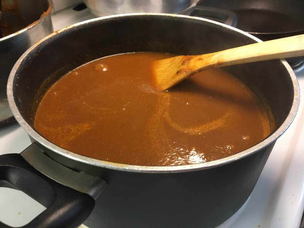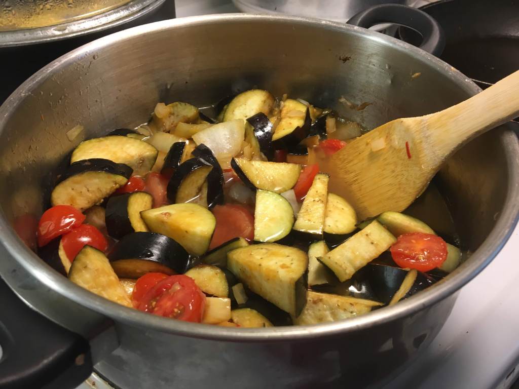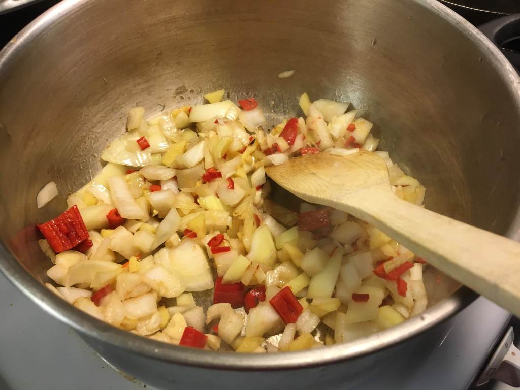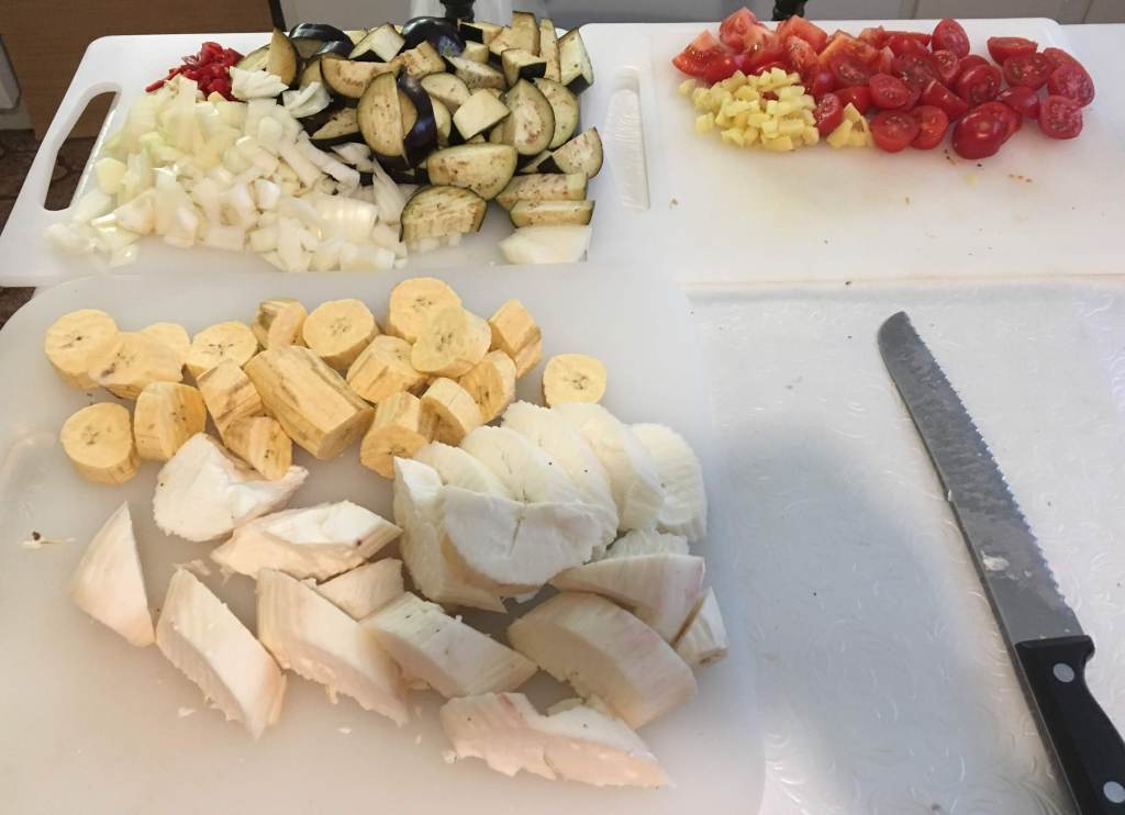 Chop the ingredients by hand or in a blender. It should not be much water in, then the soup is too thin. It becomes liquid of the vegetables when they are cooked. How much to take of each vegetable depends on how many are going to eat. For four servings you can take about five chili peppers, 2 aubergines, four tomatoes, 1garlic, 3 onions and half a can of tomato paste. Aubergines should be yellow, but you can also use blue. The aubergines are full of starch that makes the soup thcken. It is enough with one deciliter of water in it. That said, one can mix a little what you like and what you want in the soup.