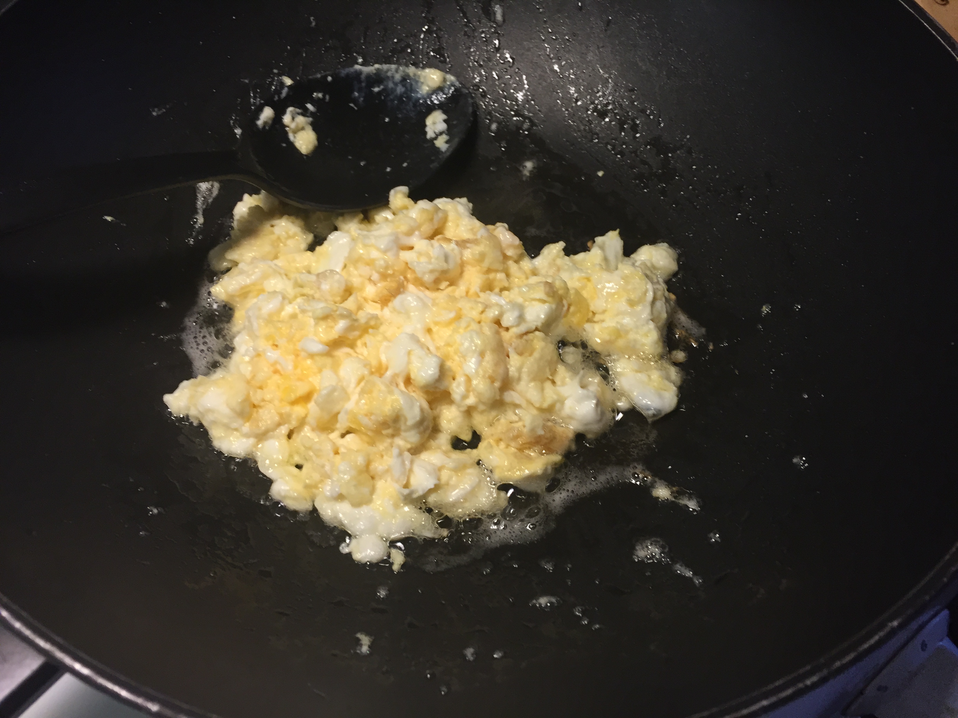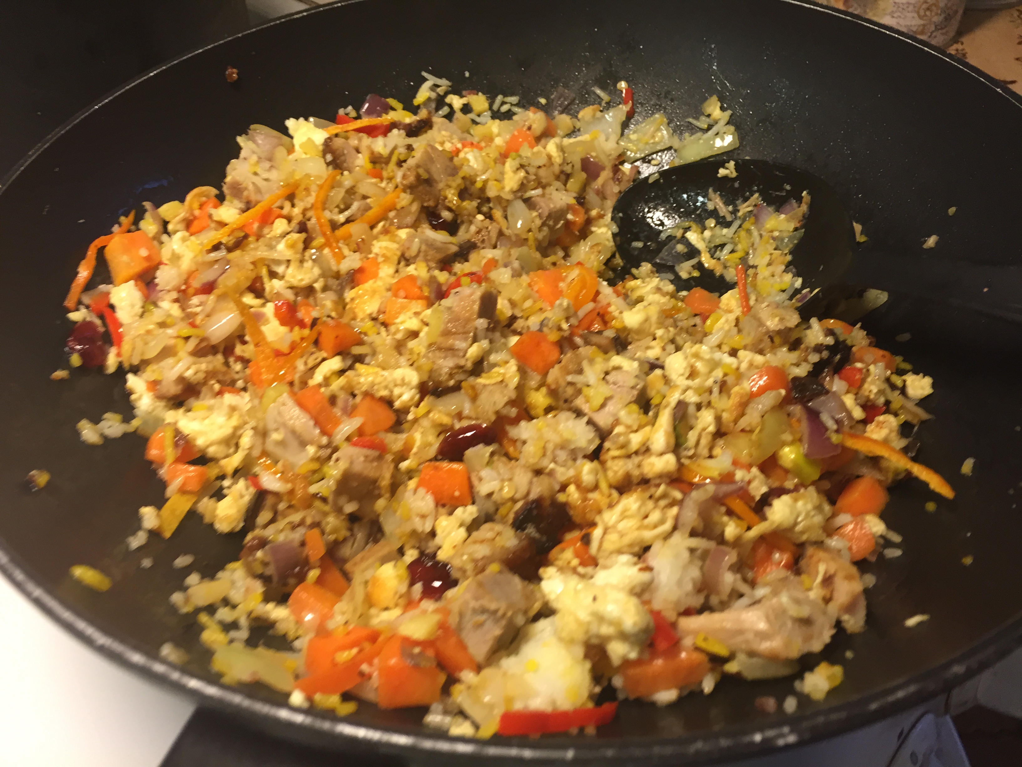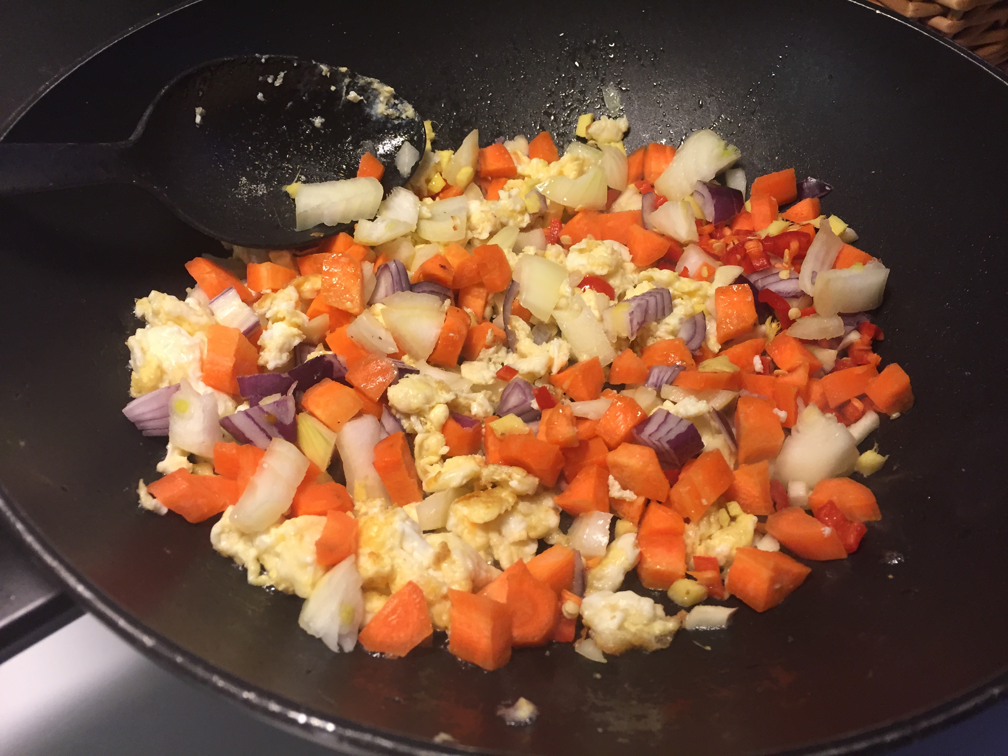 Heat a wok pan and add vegetable oil. Quickly fry up the egg while stirring all the time. Add onion and stir, add chopped carrot and peppar and stir. Add the rice and keep stirring, add the cut meat and stir. Add spices to your liking.