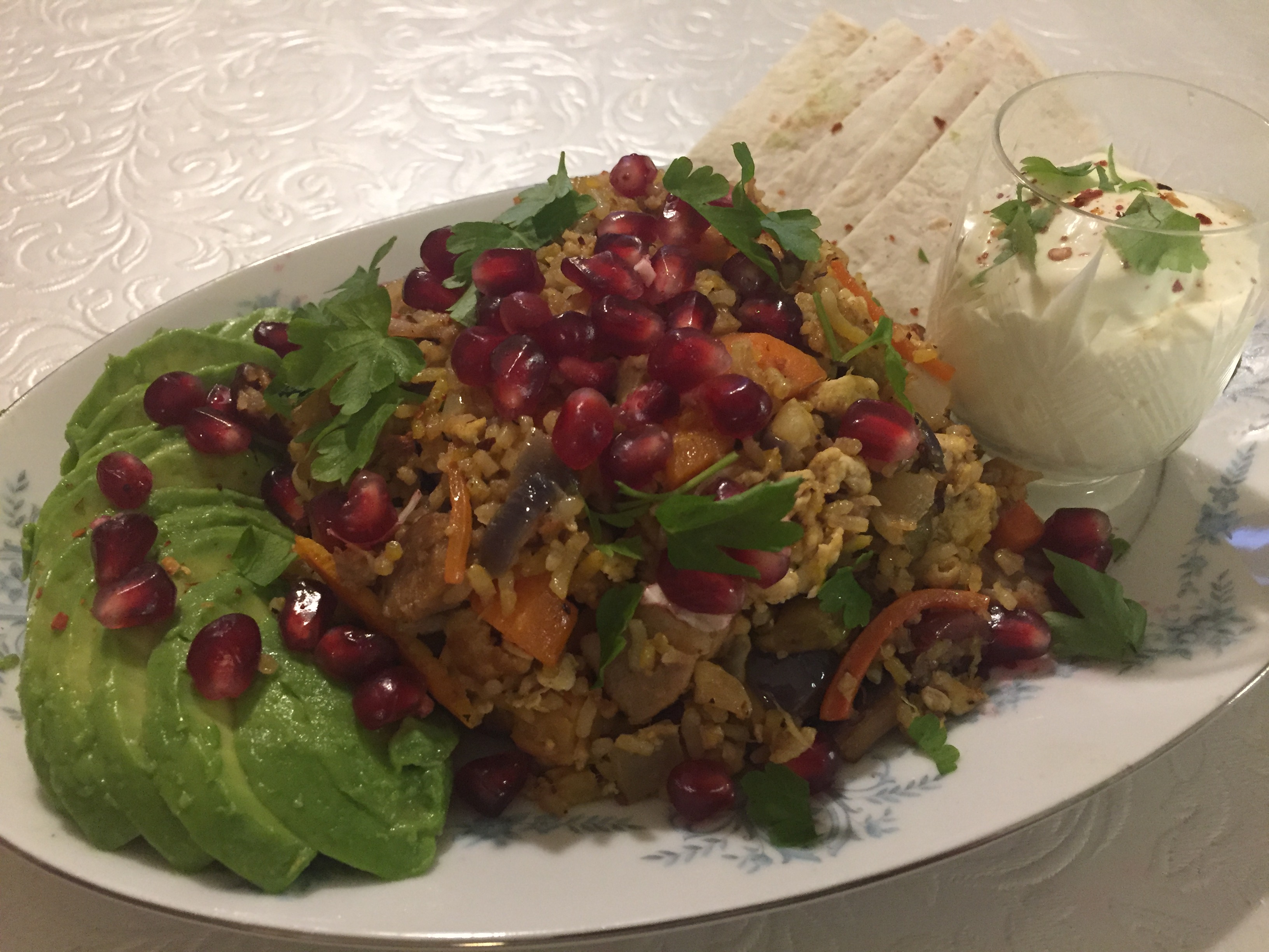 Plate rice and avocado and sprinkle pomegranate seeds over. Decorate with parsley.