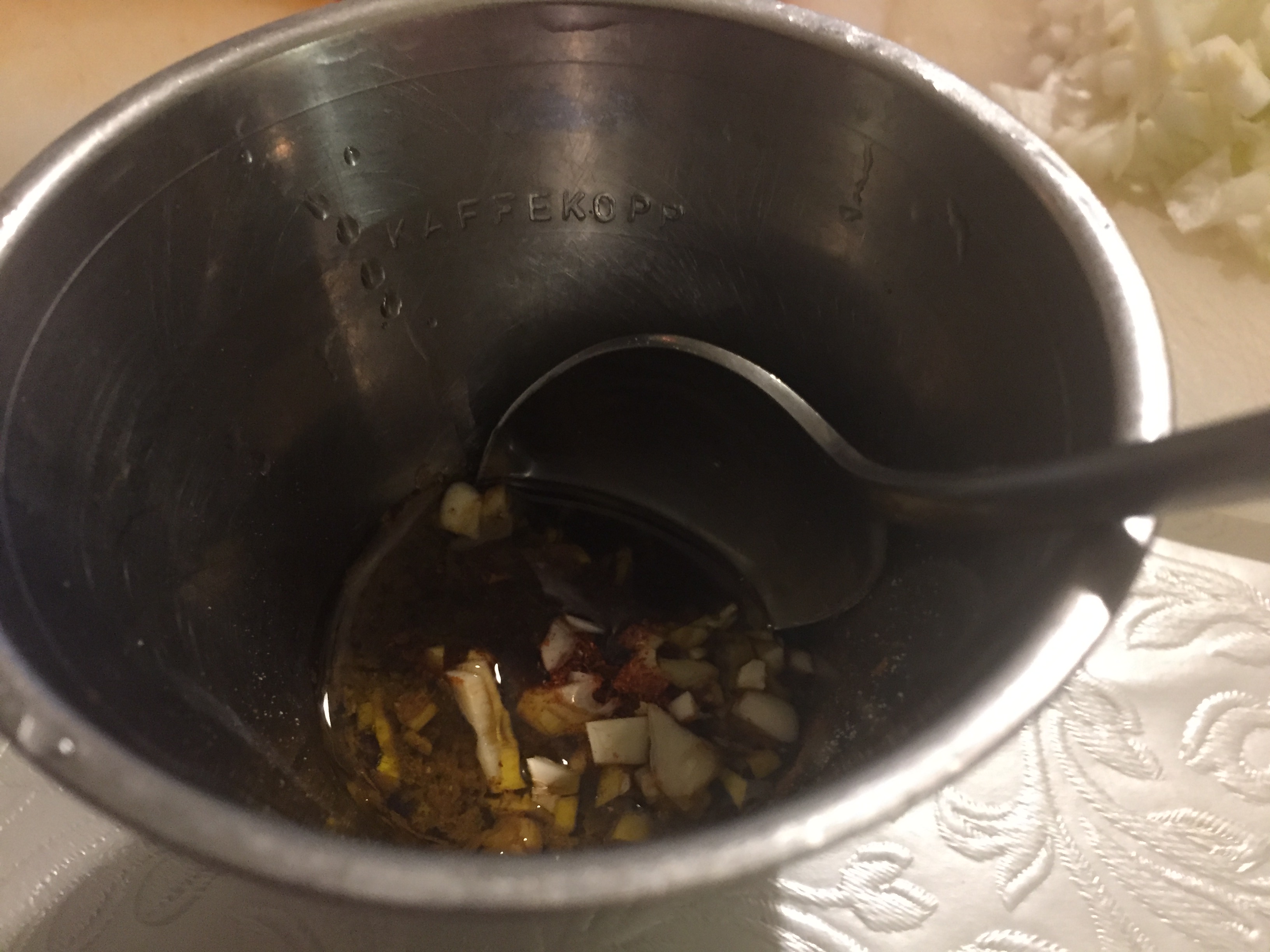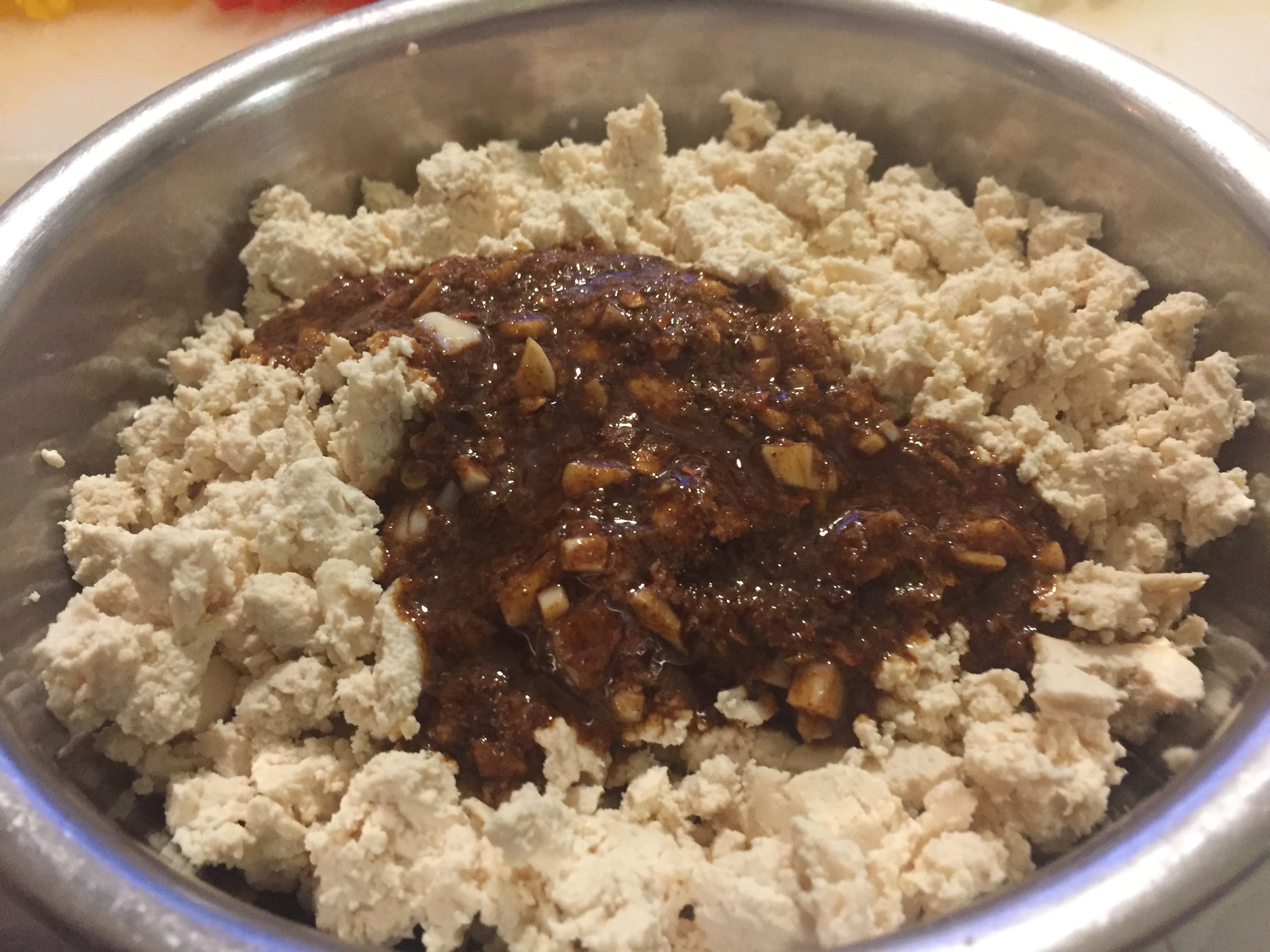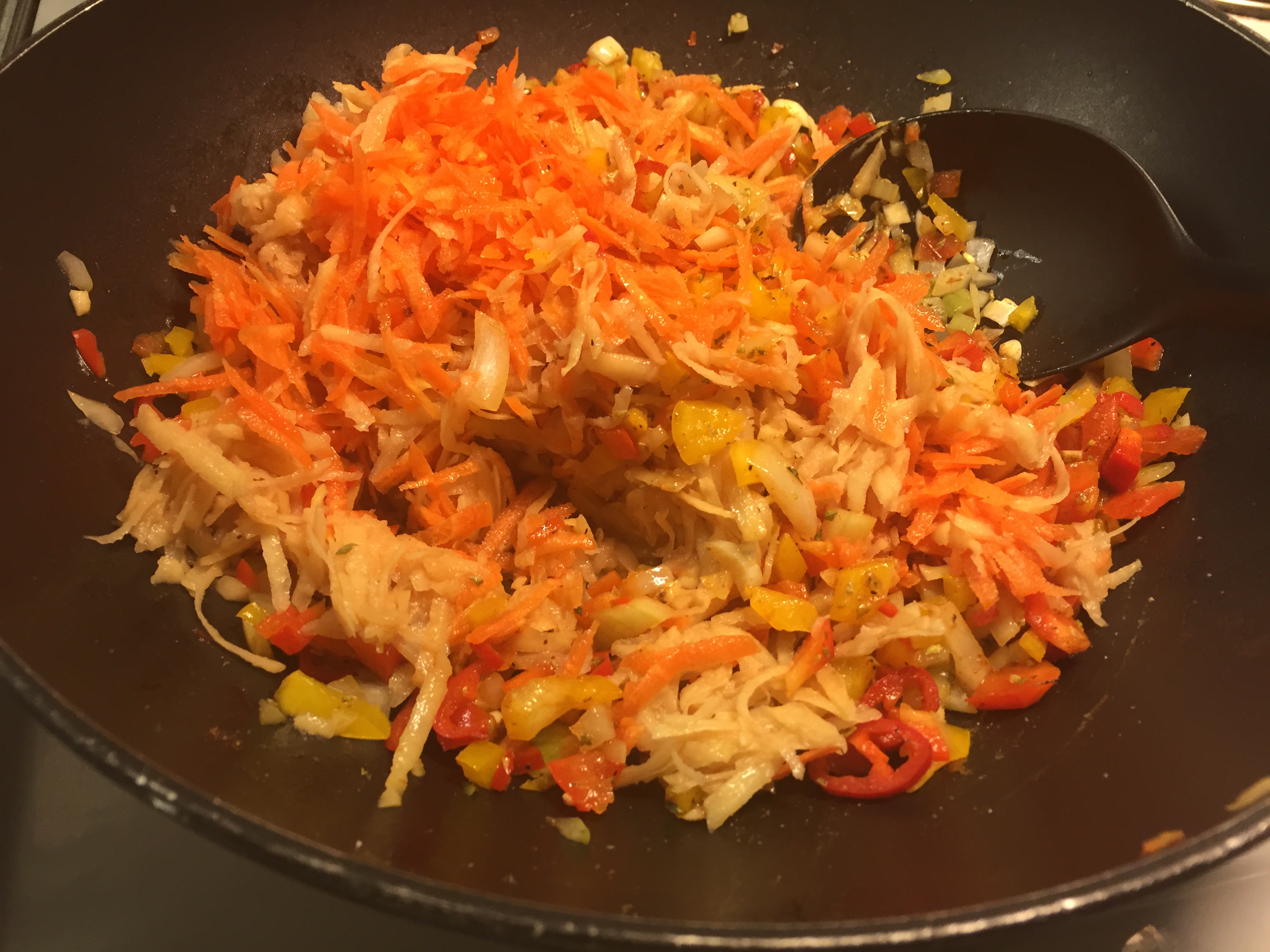 Sweat the chopped onion and garlic for a minute. Add the shredded carrots and potatoe. Add the chopped red peppar. Cook for a few minutes until the carrots are soft. Add the spices and fry for a minute. Add a little water. It should not be runny. Add the tomatoe paste and stir. Let it cook together for a minute. Take off the heat and add the Tofu and mix all. Leave until cooled off completely.
