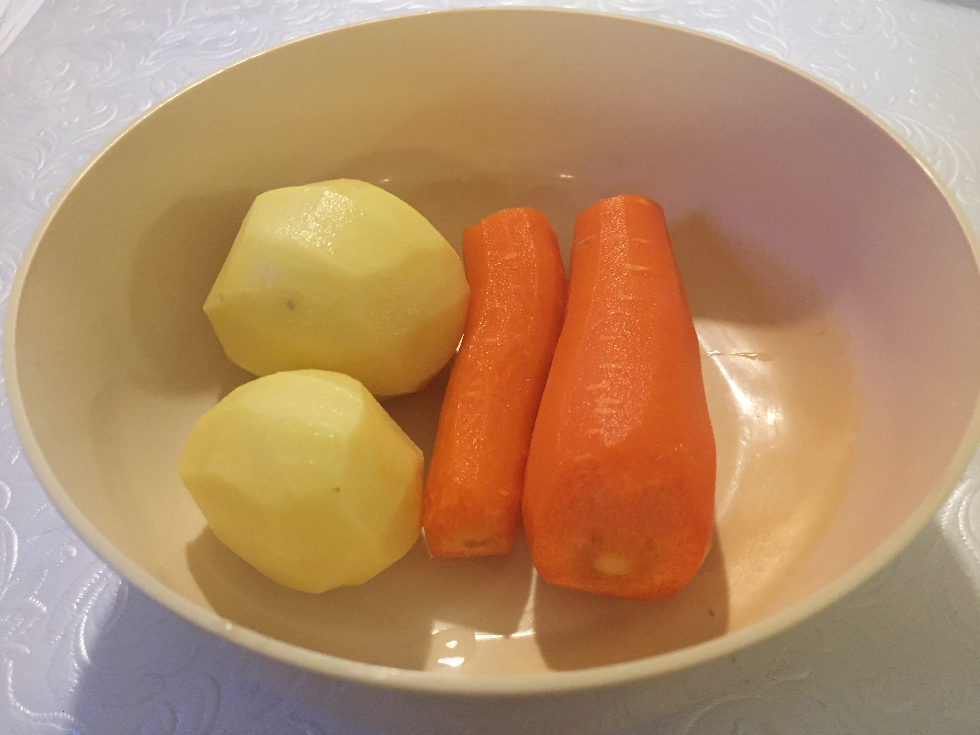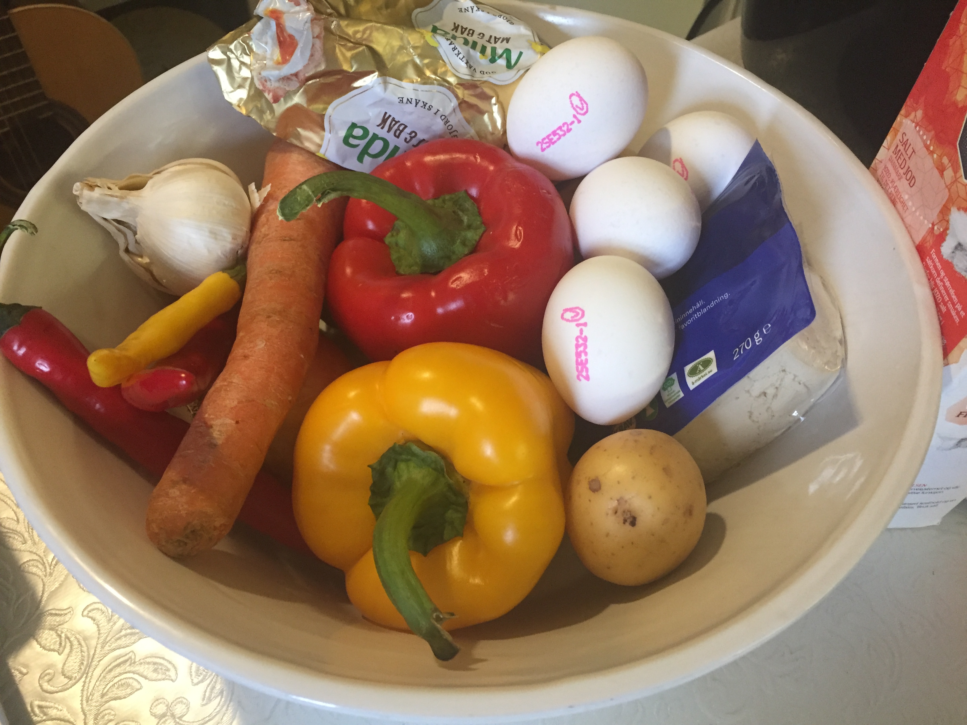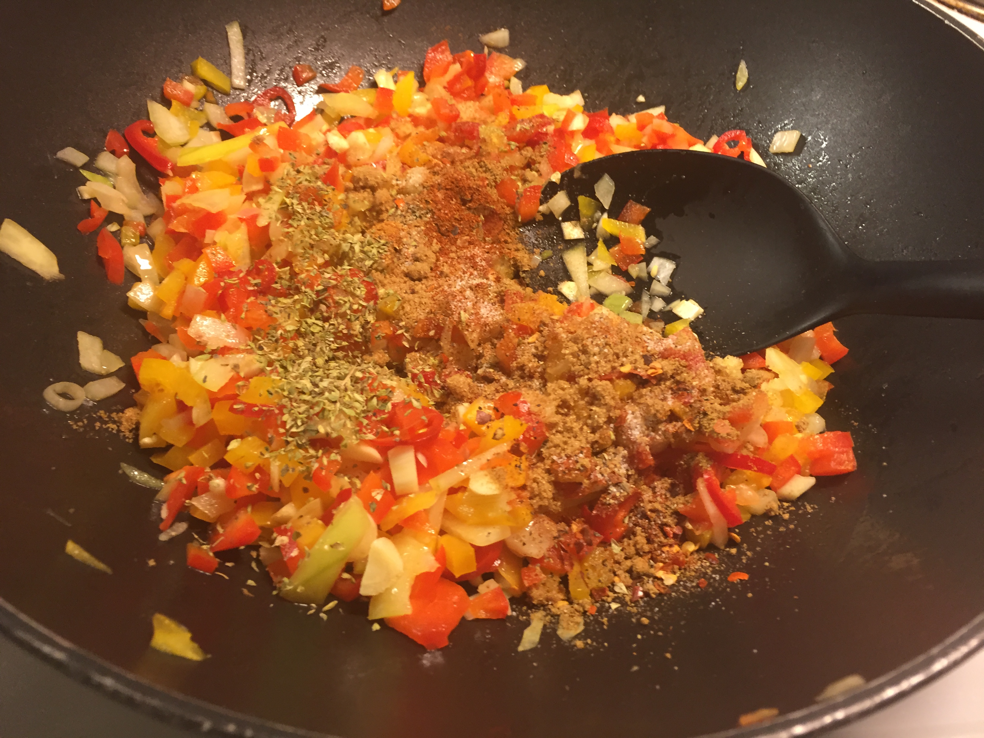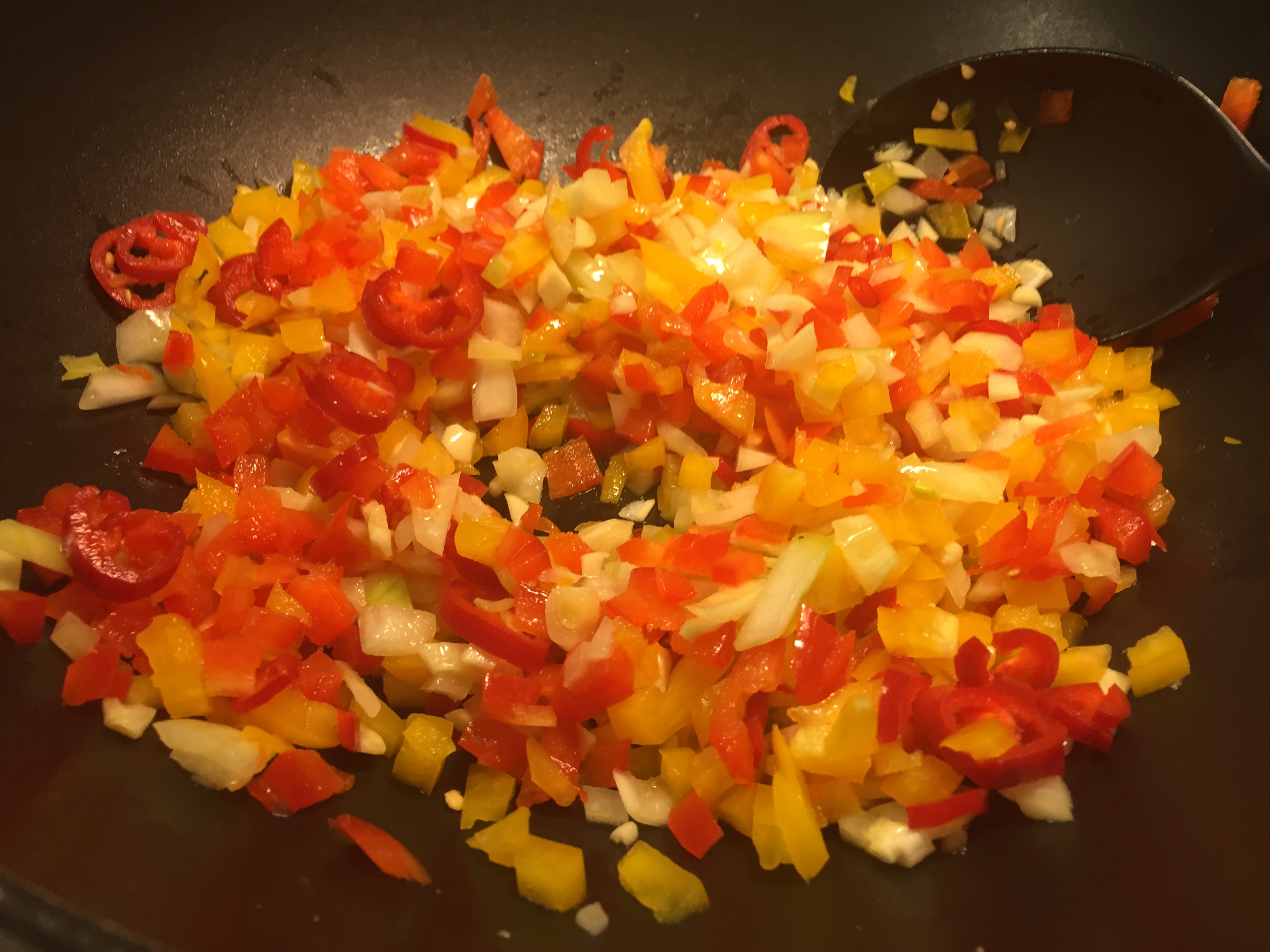 Sweat the chopped onion and garlic for a minute. Add the shredded carrots and potatoe. Add the chopped red peppar. Cook for a few minutes until the carrots are soft. Add the spices and fry for a minute. Add a little water. It should not be runny. Add the tomatoe paste and stir. Let it cook together for a minute. Take off the heat and add the Tofu and mix all. Leave until cooled off completely.