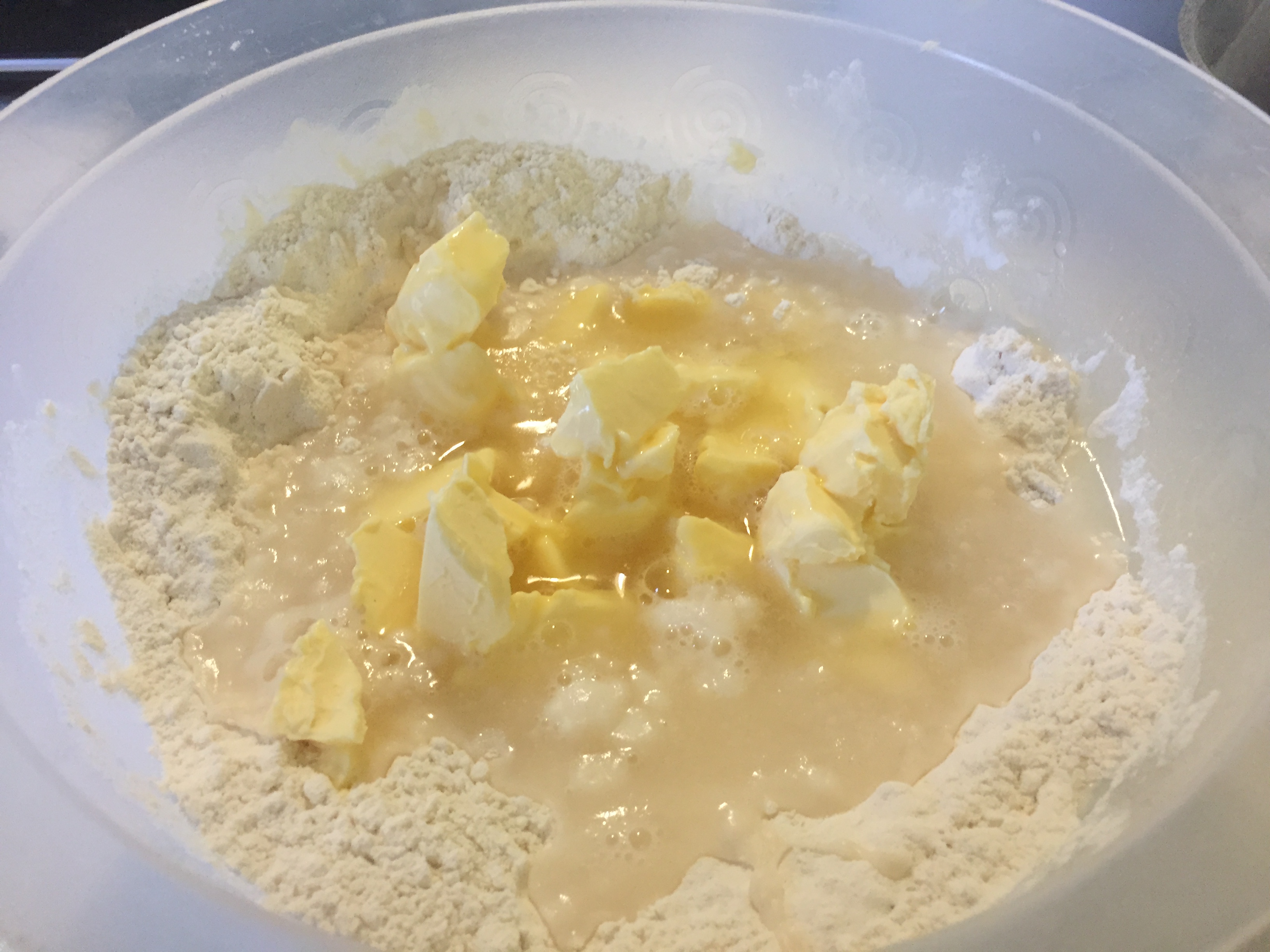 Put the butter in small pieces in the middle and pour on the boiling water.