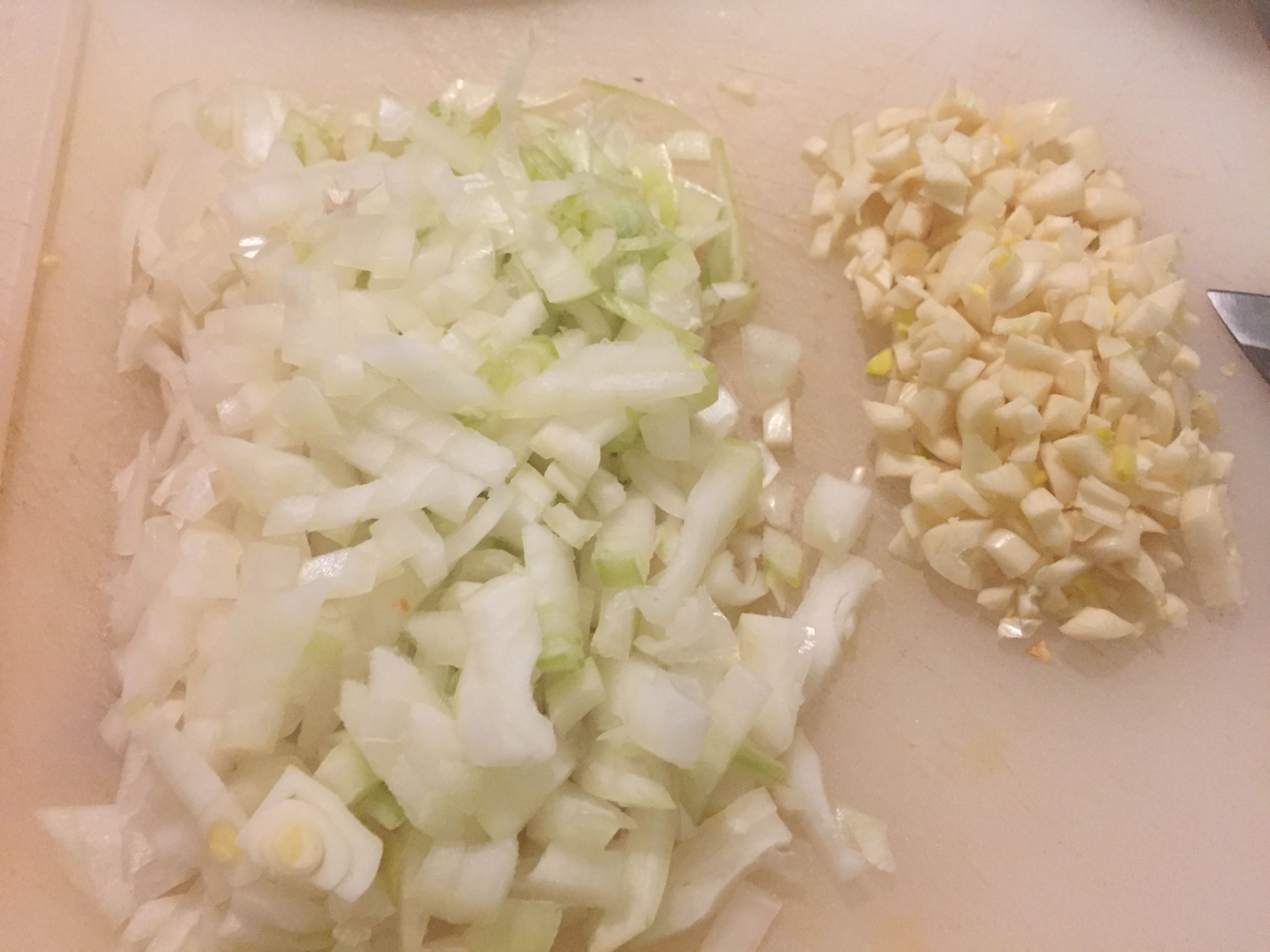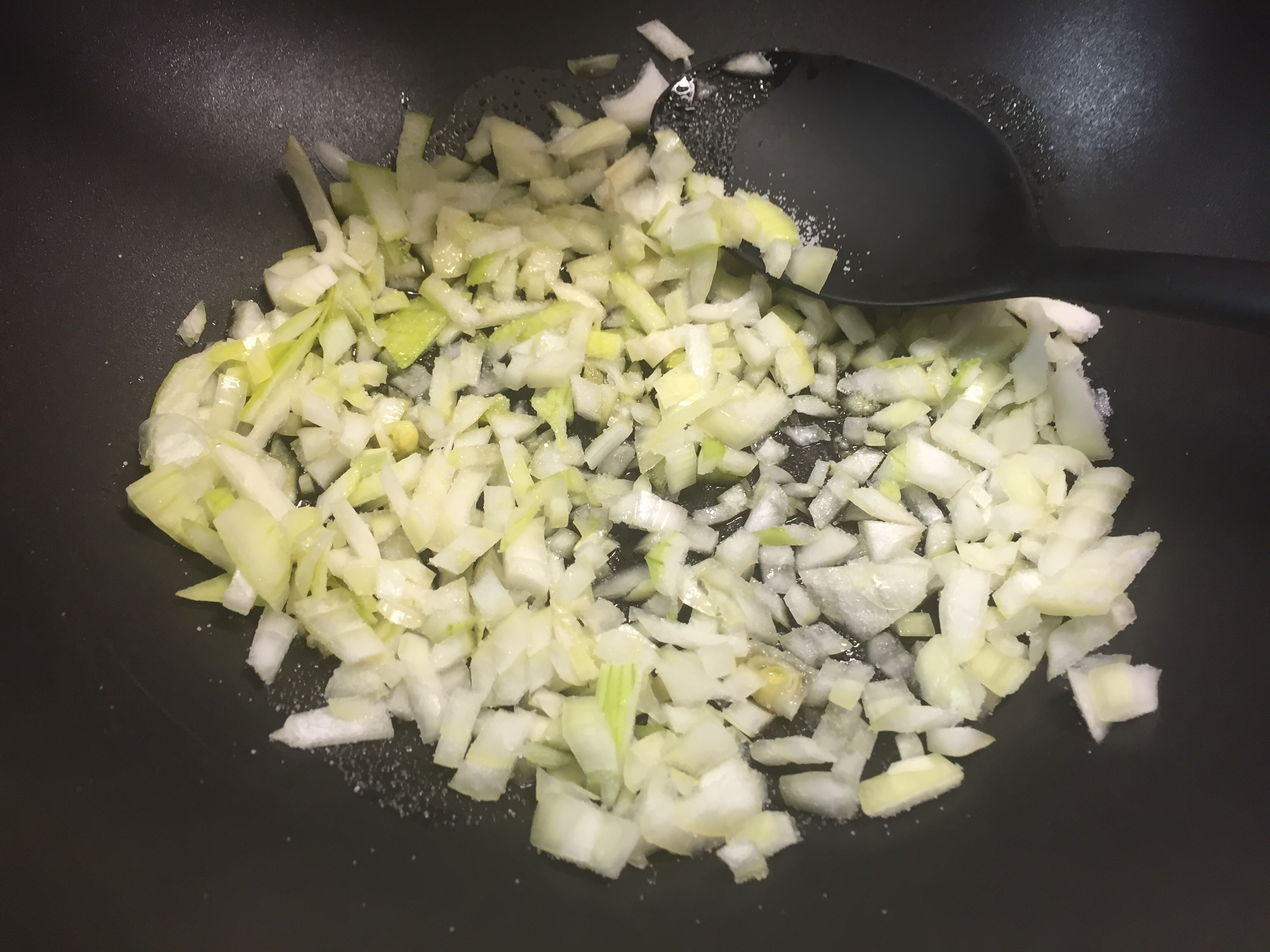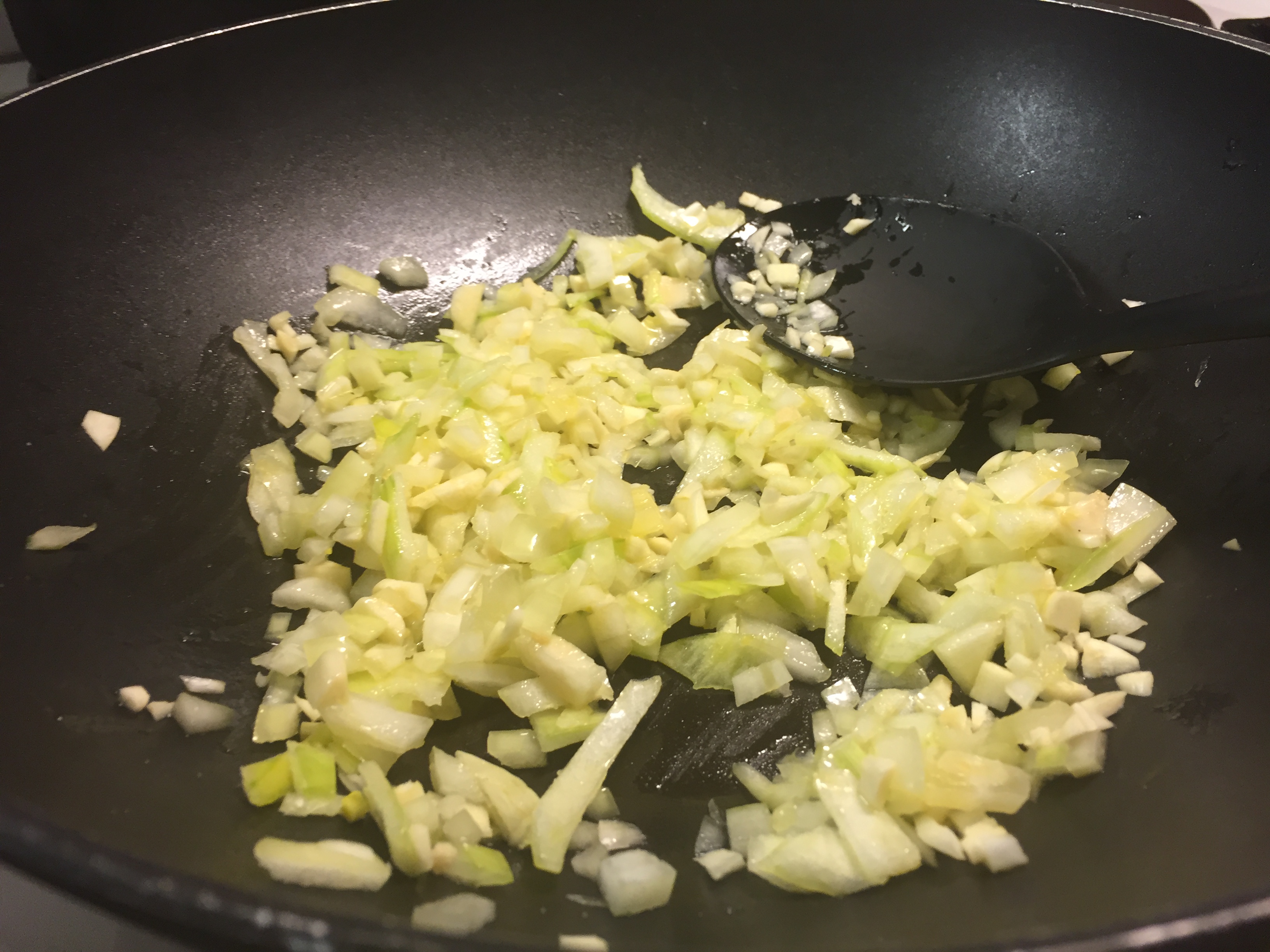 Add a tablespoon of olive oil in a frying pan. Add the onion and garlic. Sprinkle a little salt.