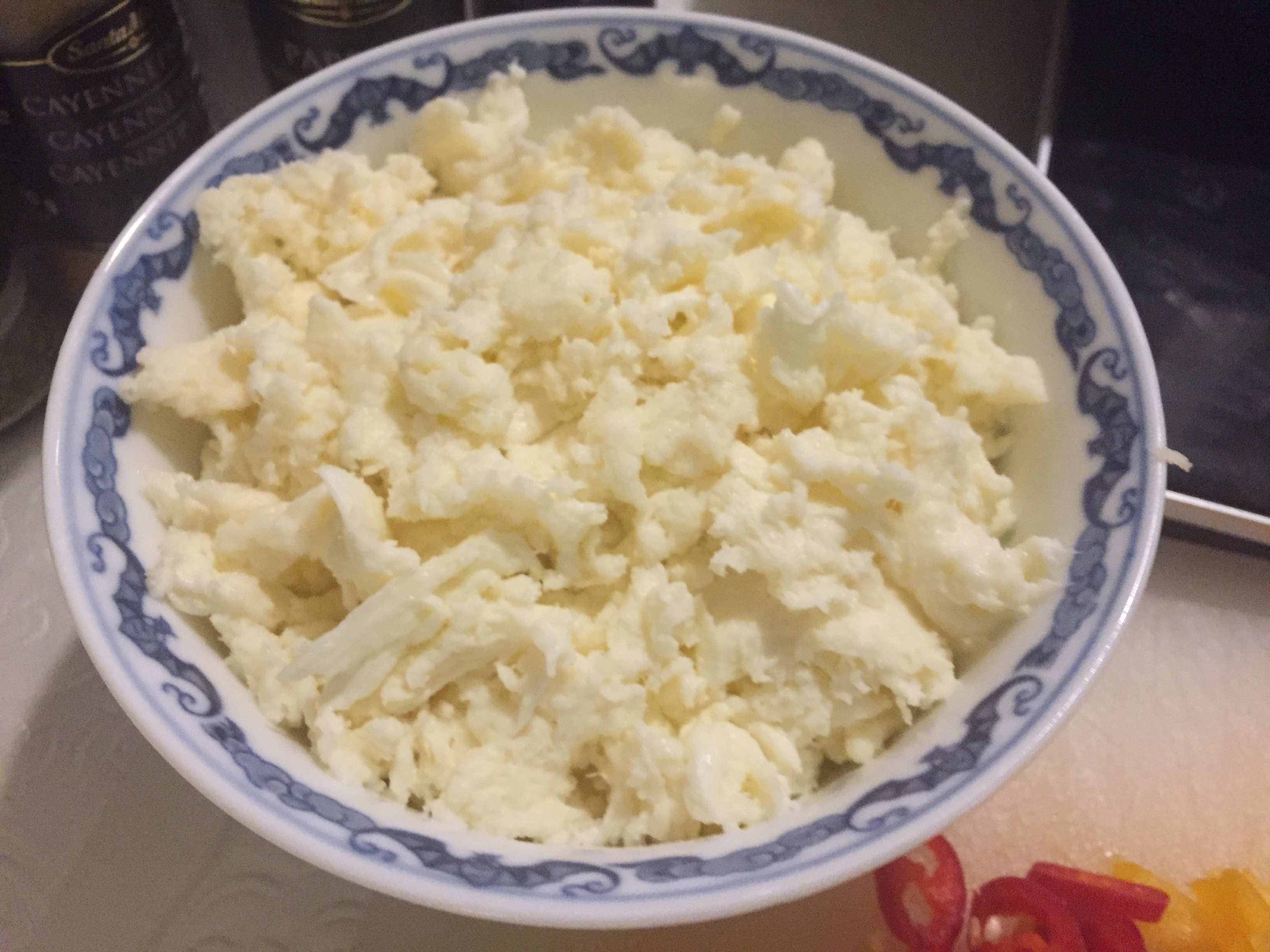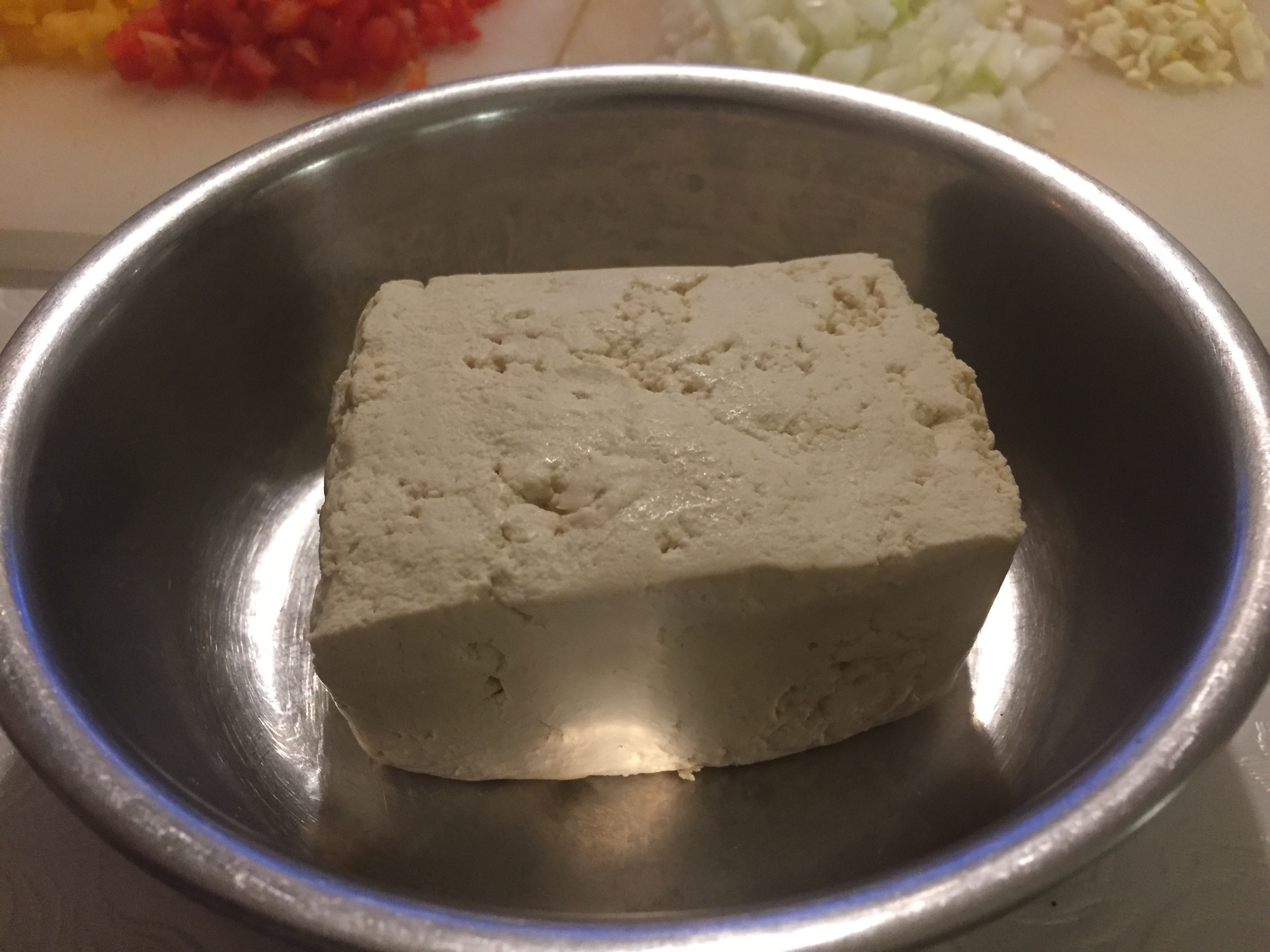 To prepare the Tofu take it out of it´s package and wrap paper towels around like a package. Place it in a container and under pressure. I put my iron cast frying pan on top. This to press the water out. Leave it under pressure for 10-15 minutes. Change the paper around if it is a lot of liquid.