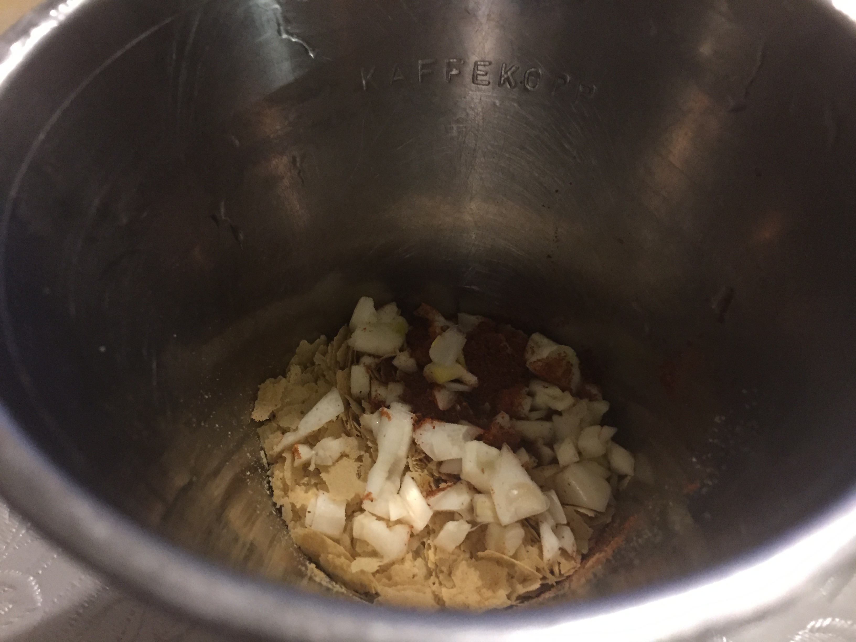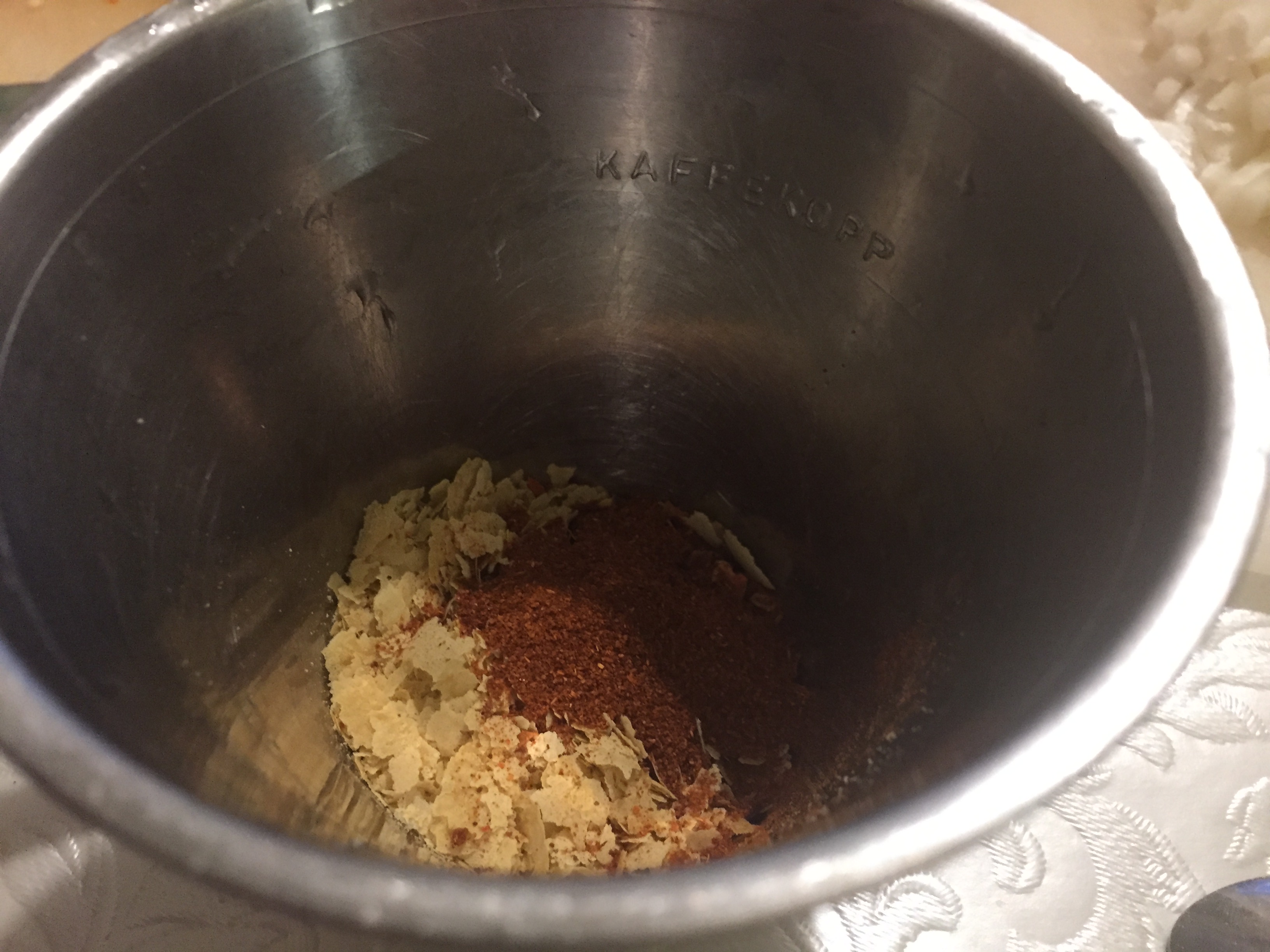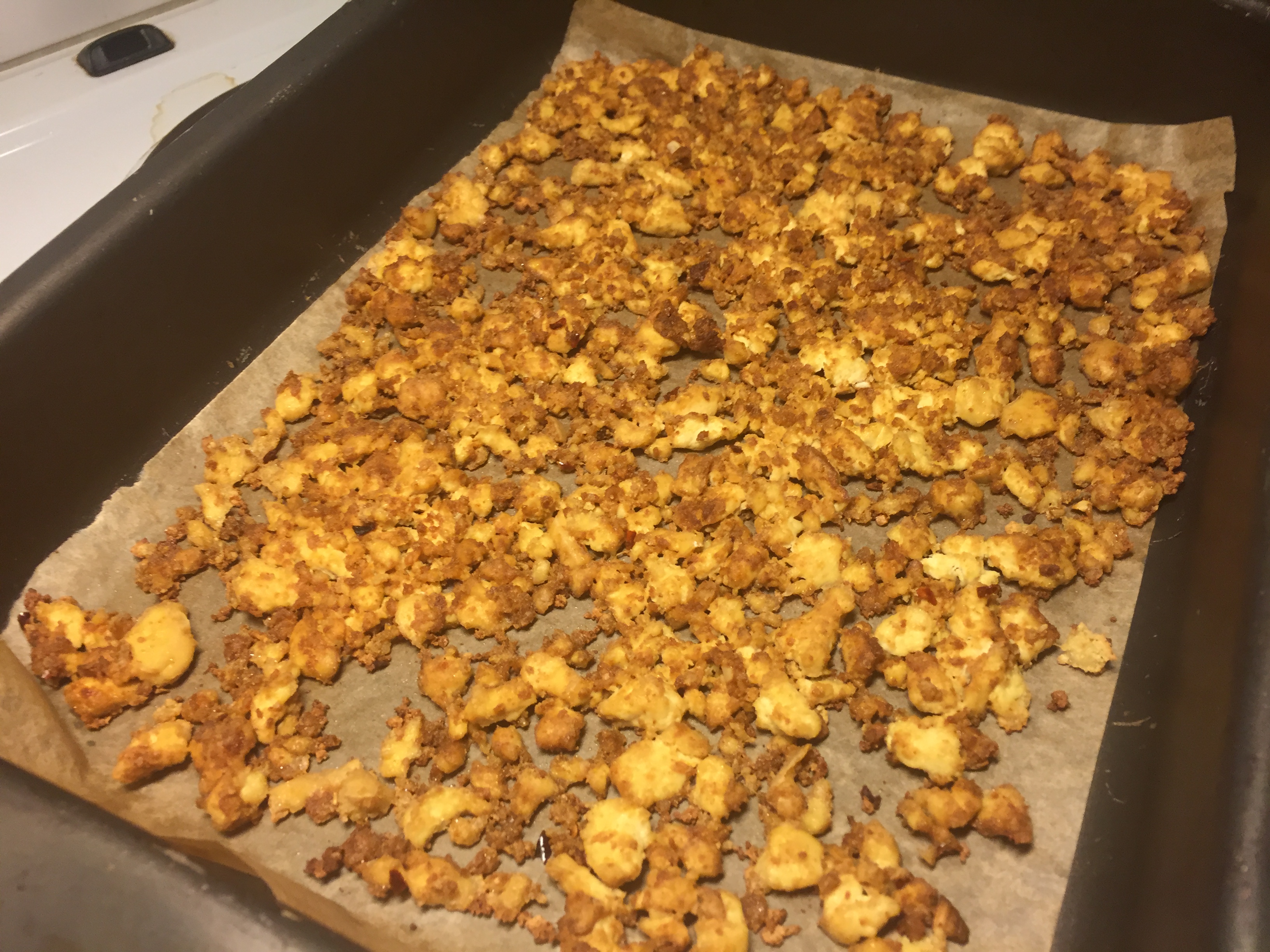 Meanwhile mix the soysauce, olive oil, garlic powder, paprika and Nutritional Yeast in a bowl. Unwrap the Tofu and crumble in small pieces. Toss the Tofu in the soy mixture until all is covered. Place a parchment paper in a baking tray and spread the Tofu out on the tray. Bake in the oven for 20 minutes at 400 Fahrenheit/200 Celsius Degrees.