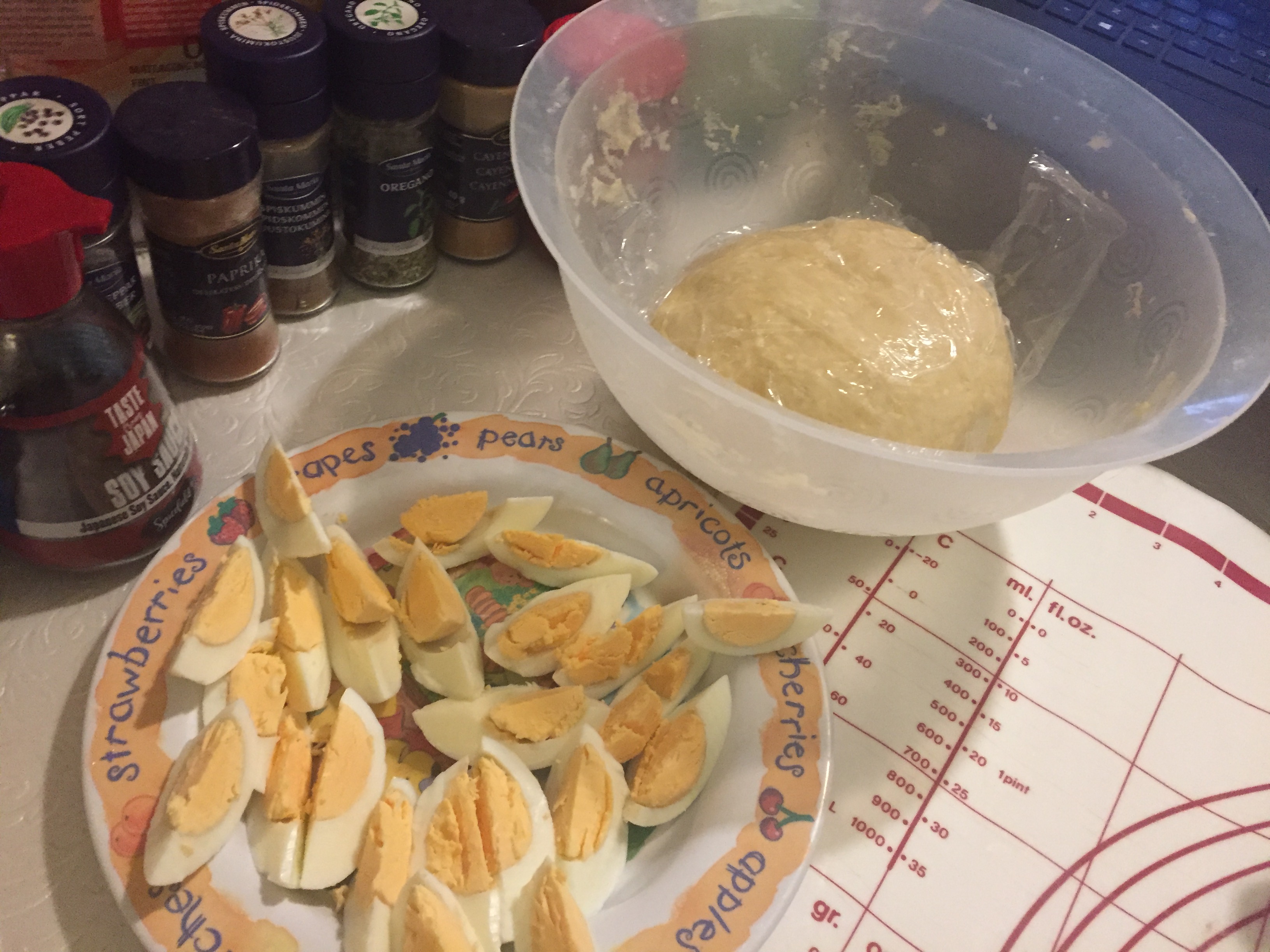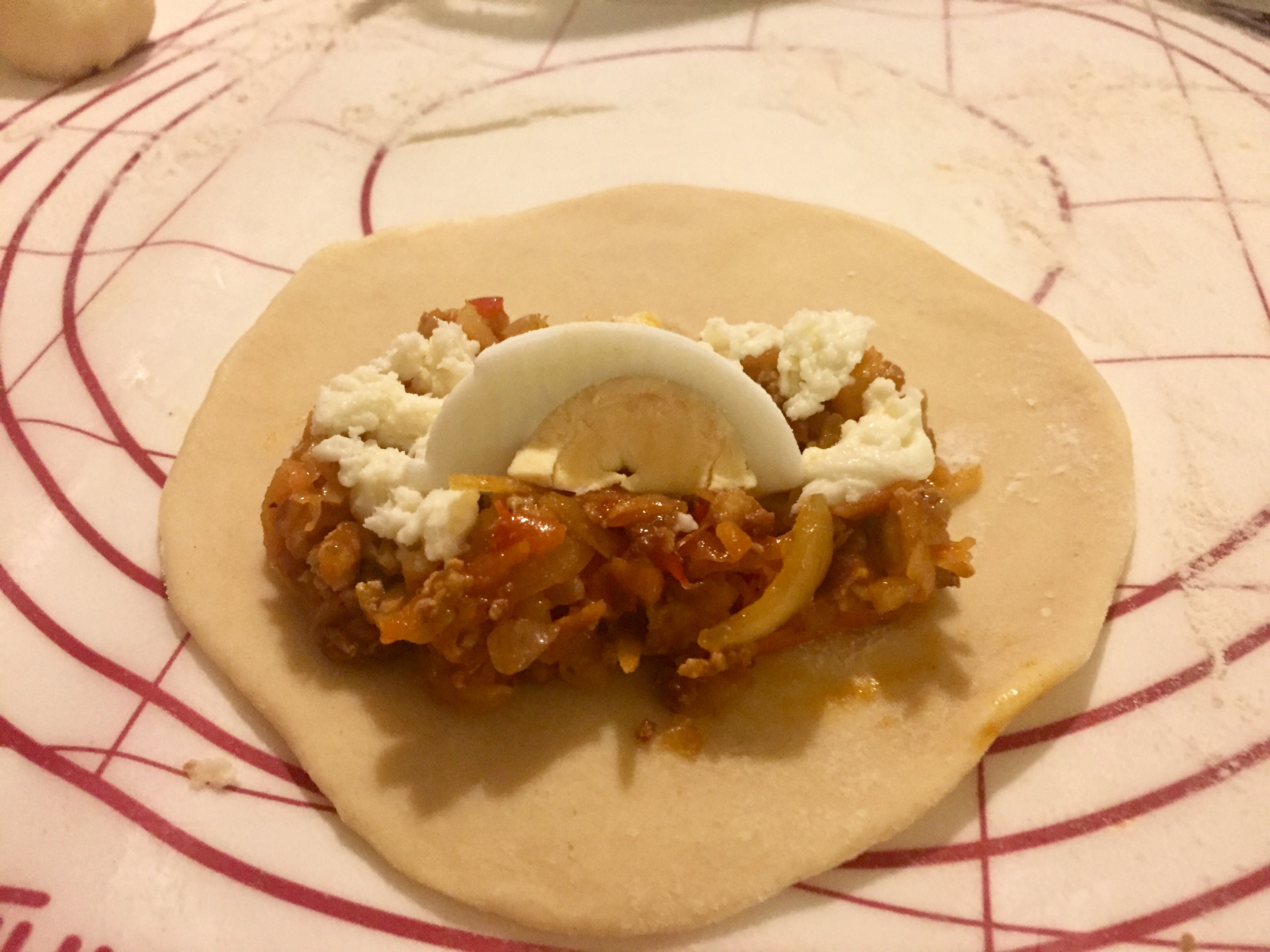 On each round place filling on one half side, add one eggboat and a couple olives (if you have olives. I didn´t so I had to make without)