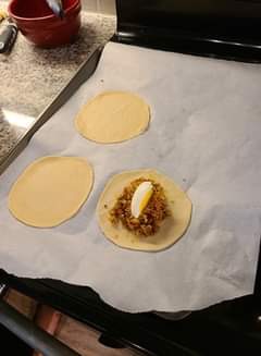 When you have placed the filling in the middle of each round, brush half the edge with water or eggwash.