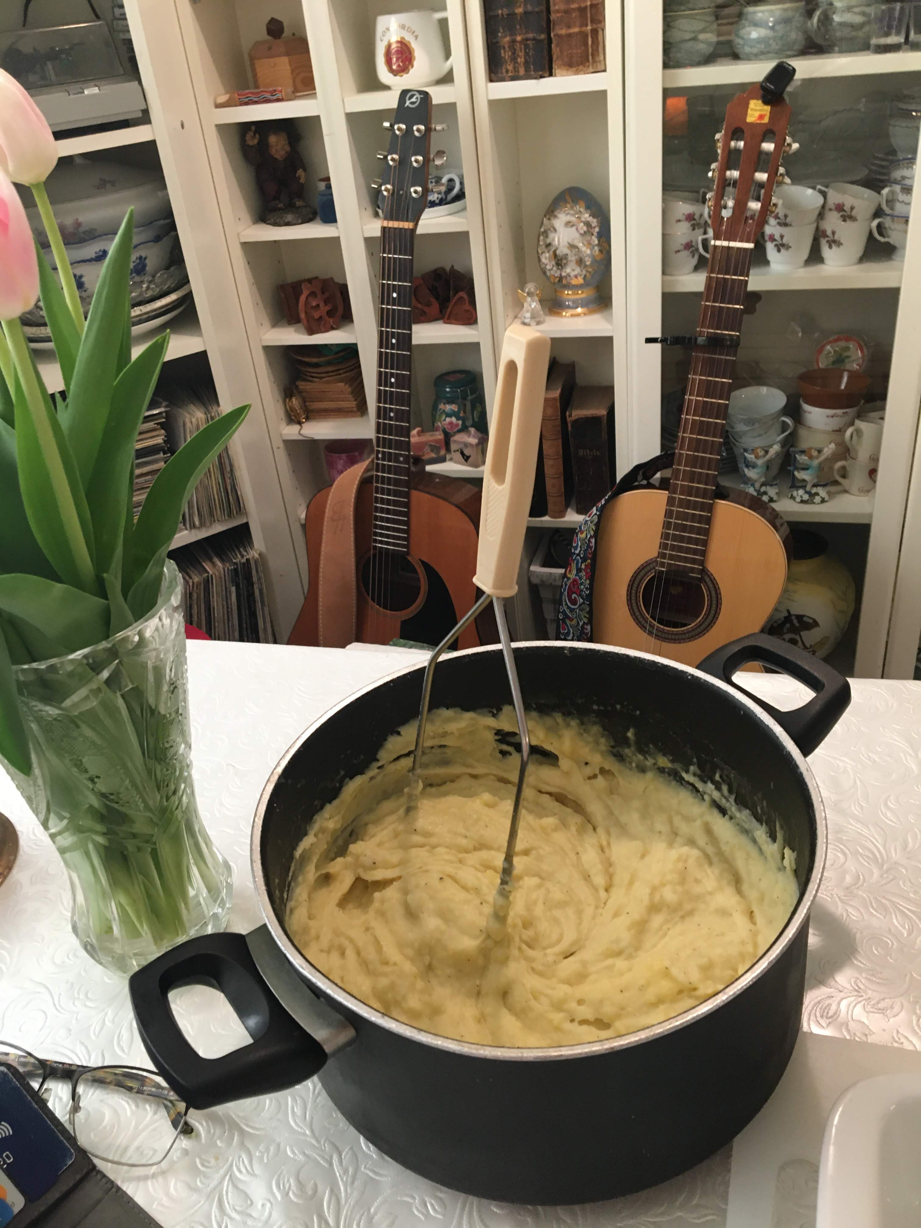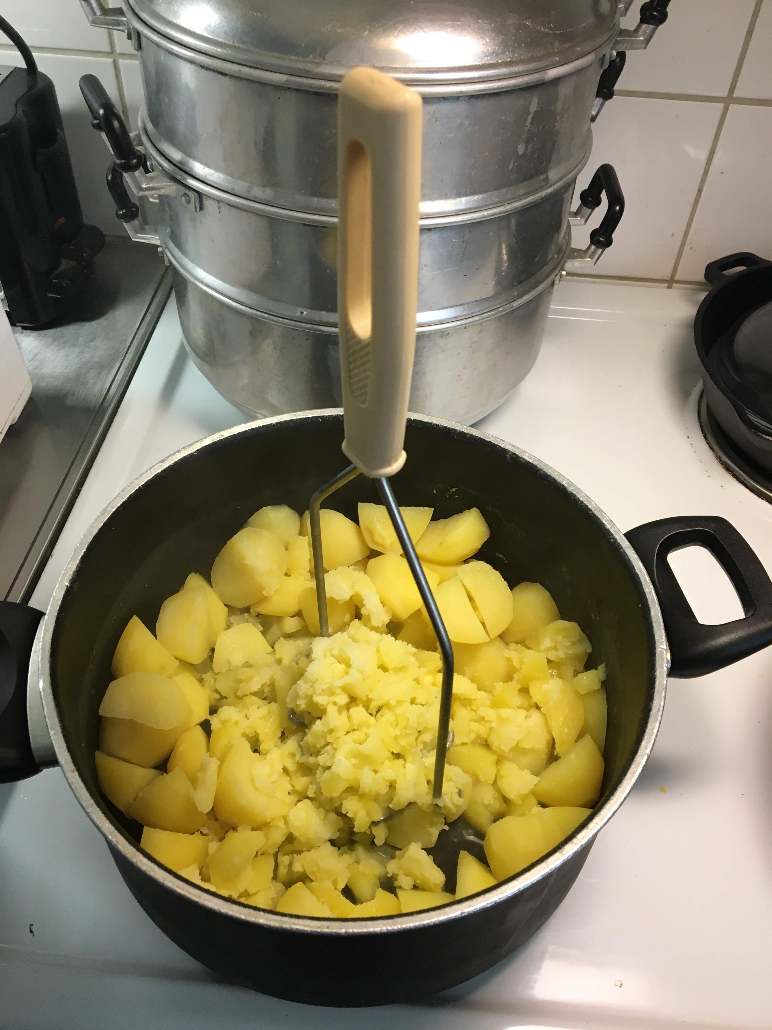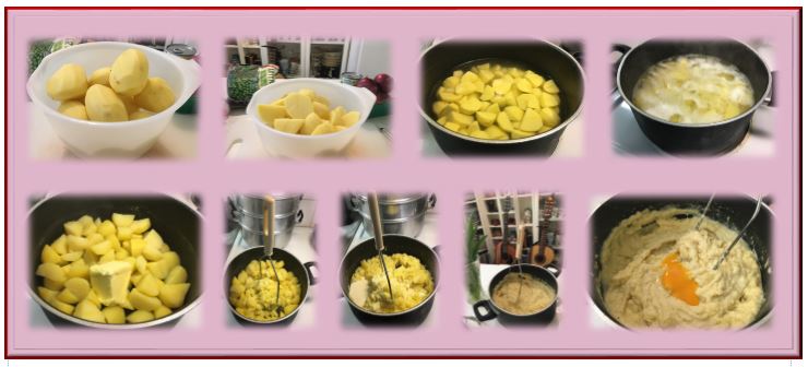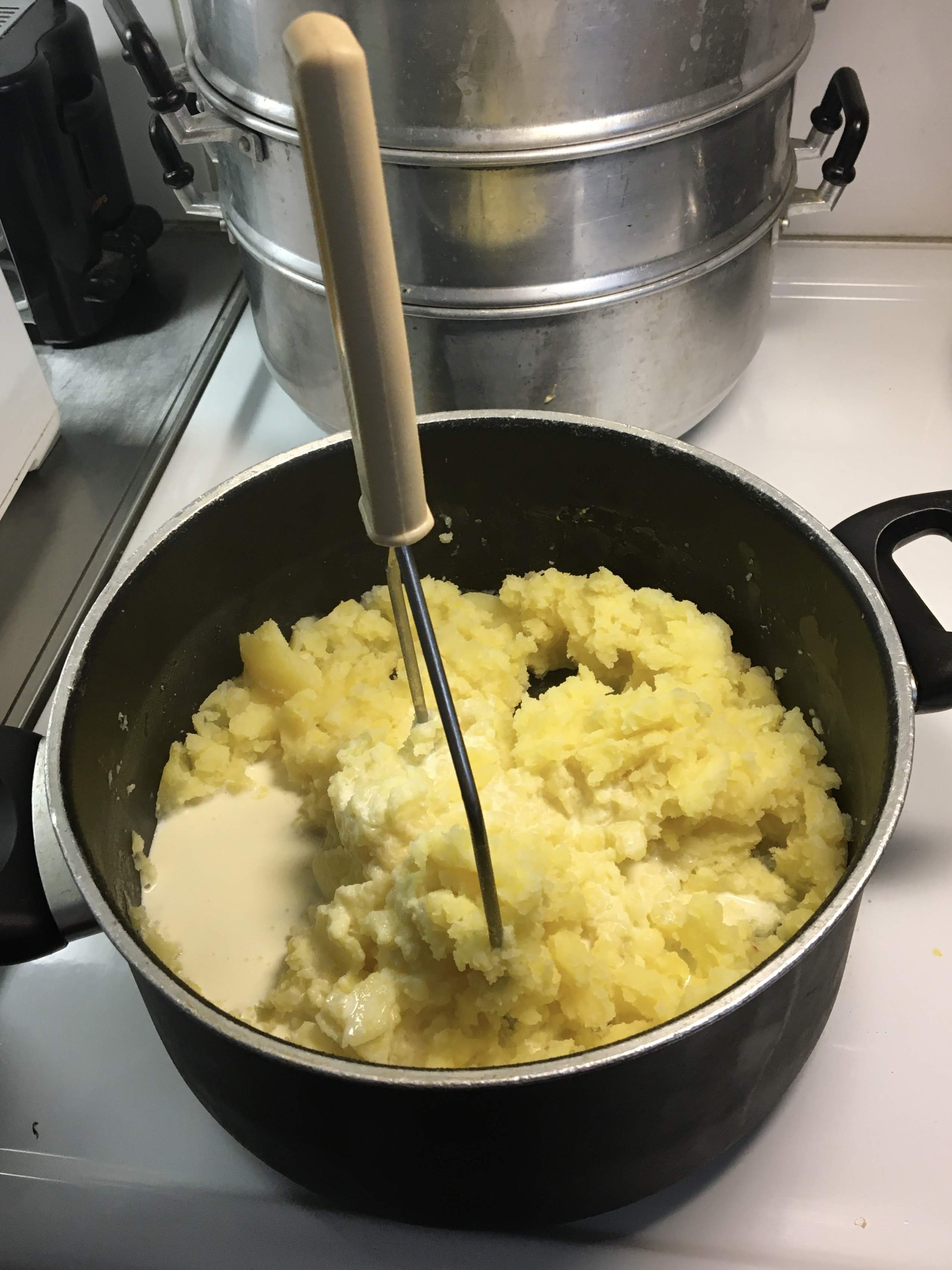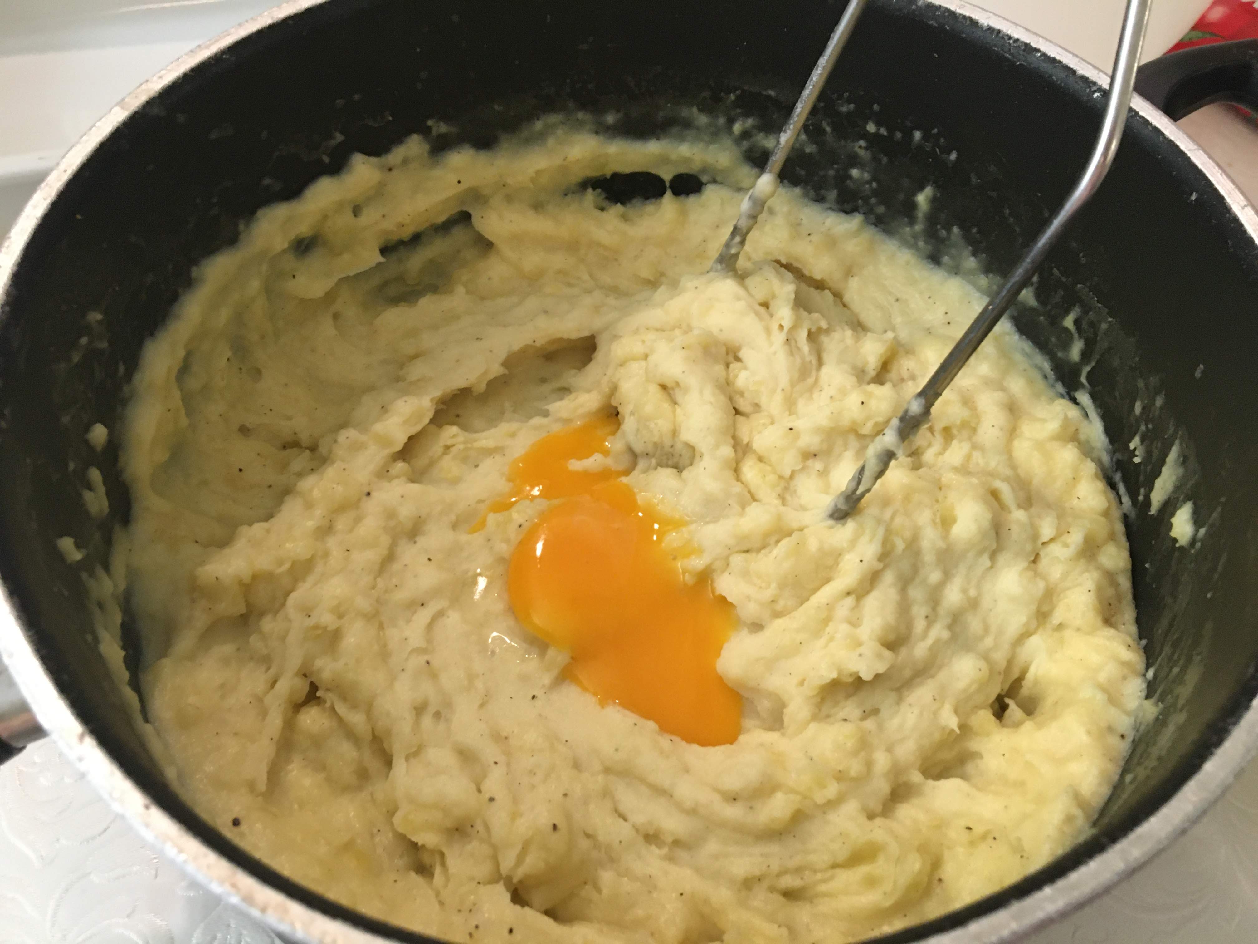 Returning to the boiled potatoes. Add the butter, milk, sour cream, salt and pepper, mash until mostly smooth and the butter is melted. Taste and adjust seasoning as needed. Stir in the egg and set aside. If the potatoes seem a little dry than add a splash or two more of milk.