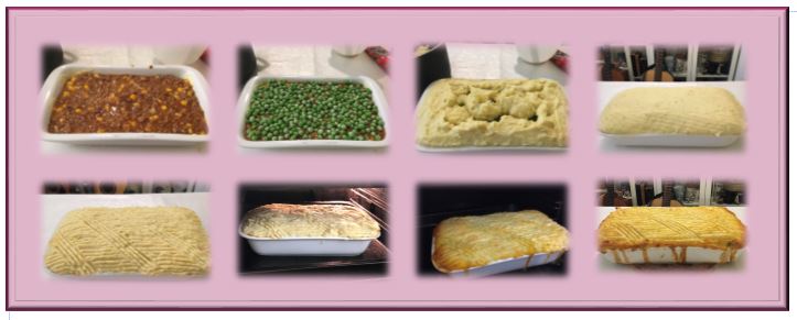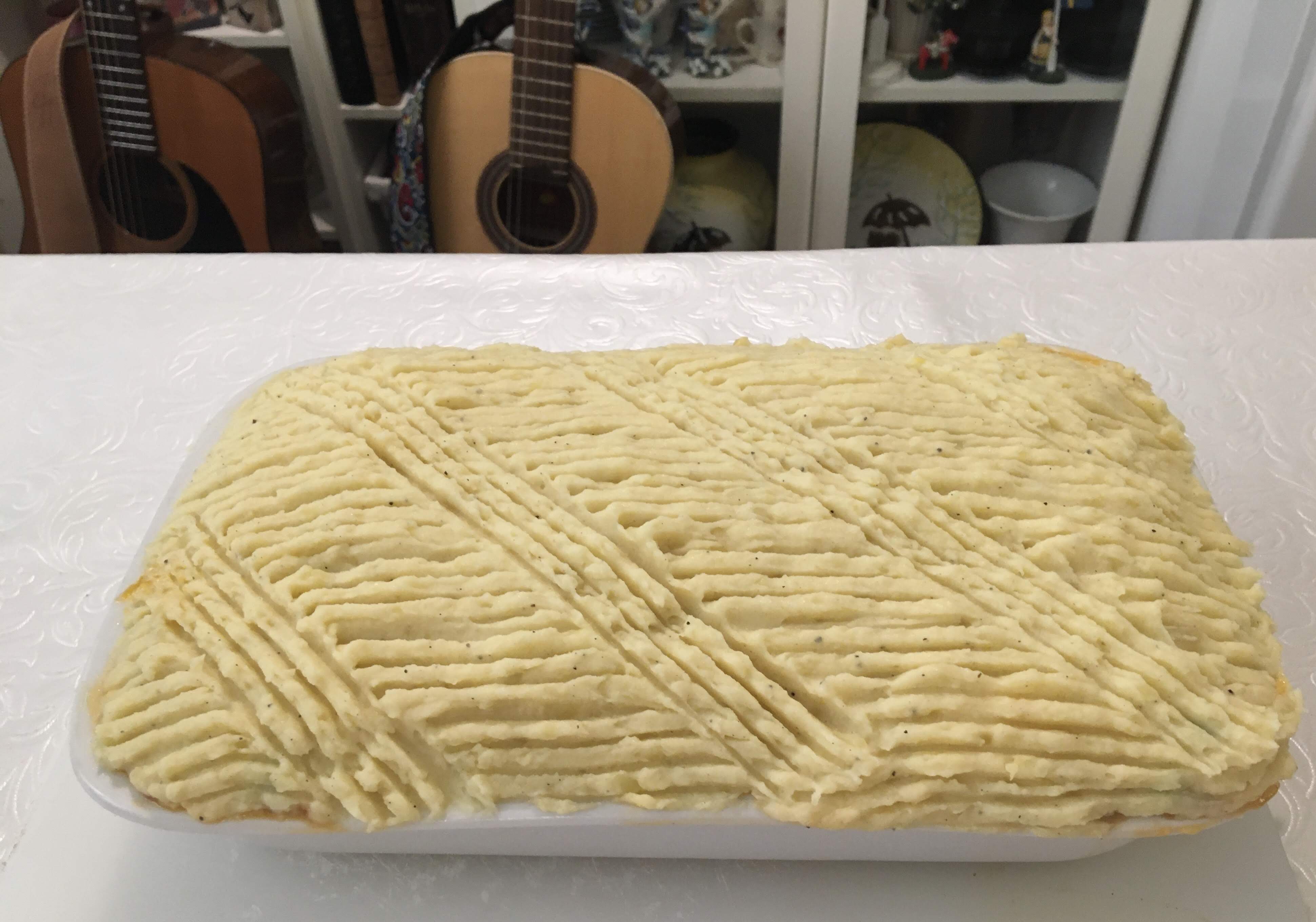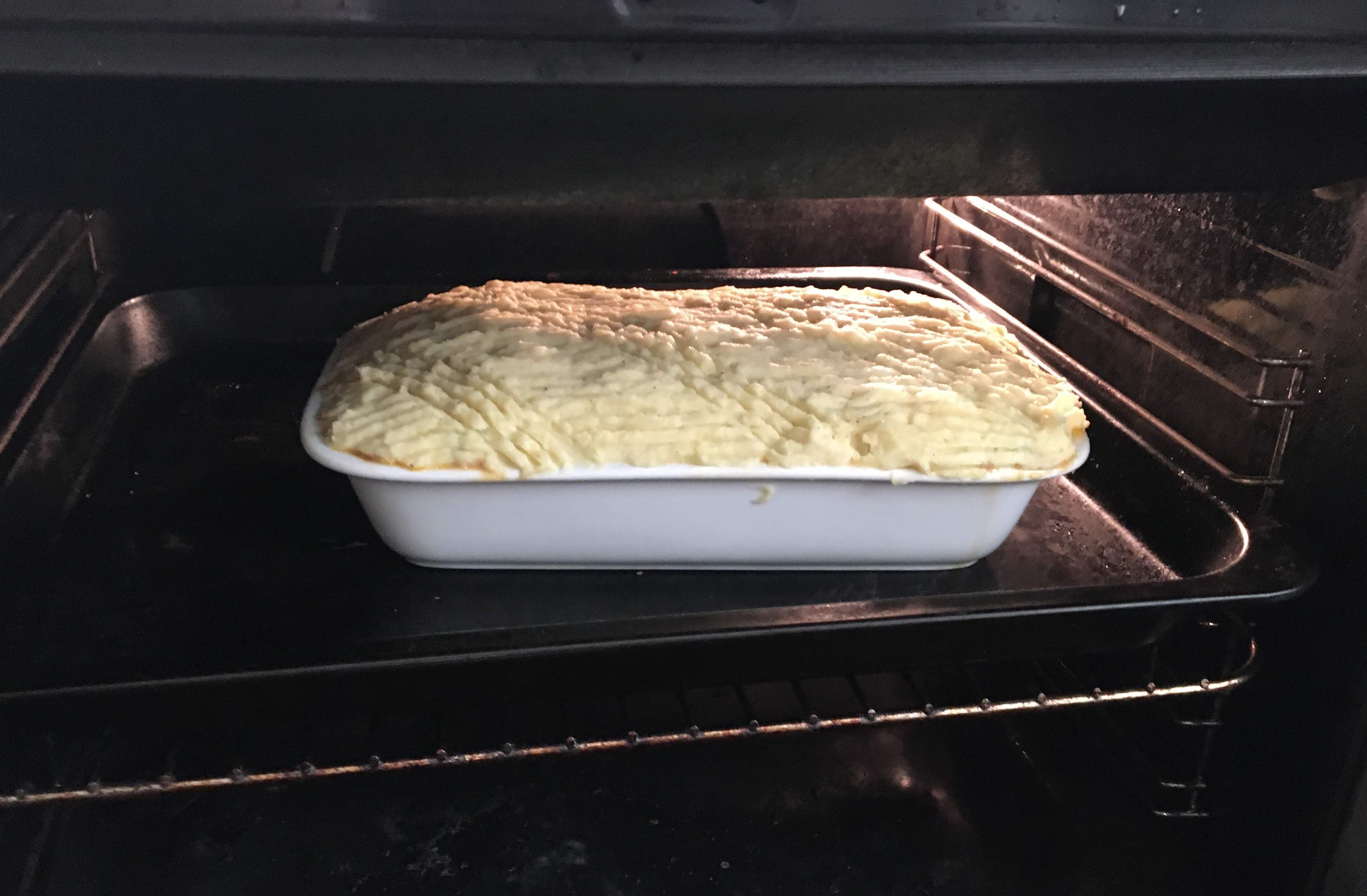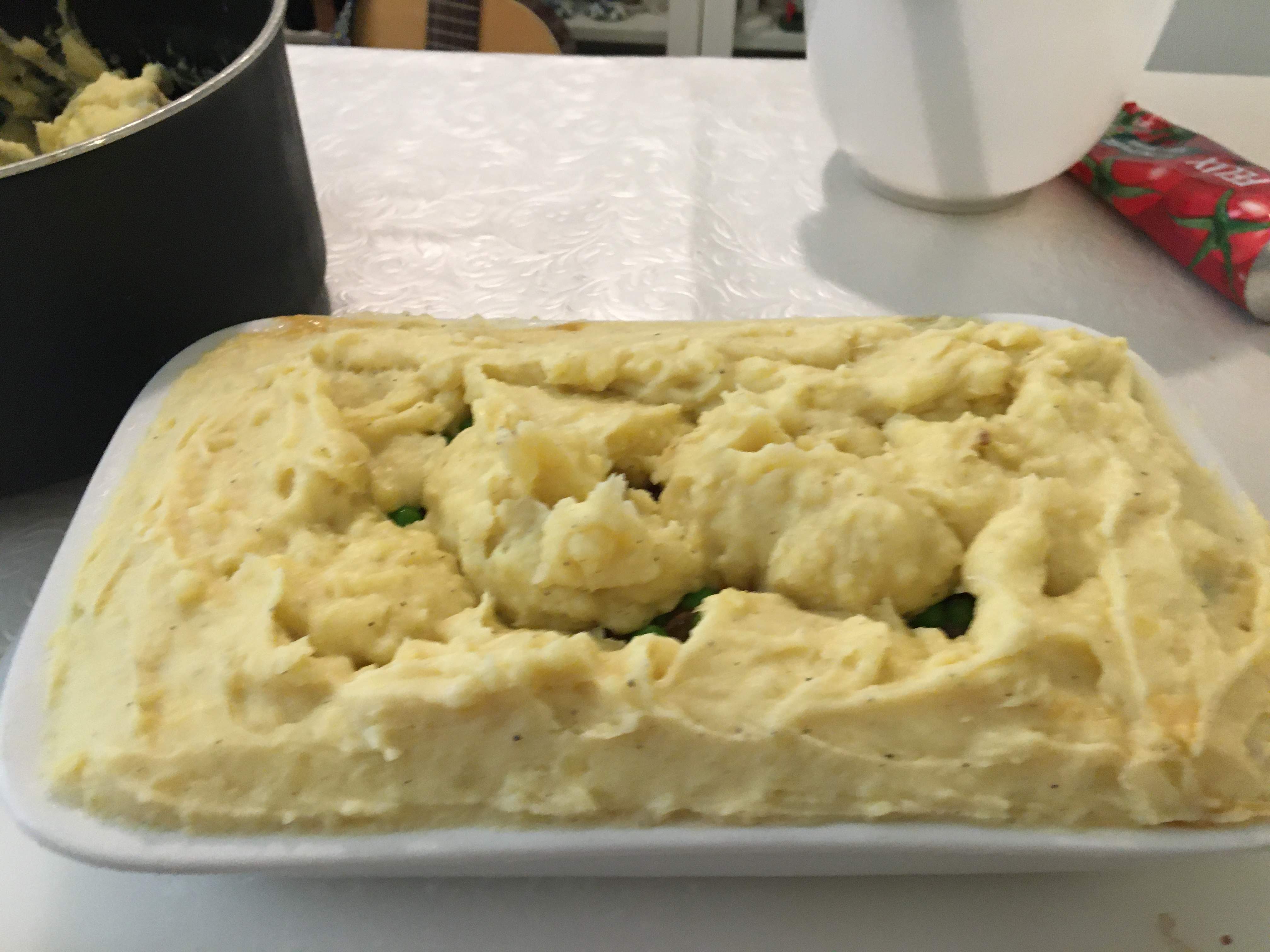 Pour the filling in a greased oven proof dish. Top with the green peas evenly all over the pie. Top with mashed potatoes: Spread the filling out evenly and spoon the mashed potatoes over top of the filling. Use a spatula to spread out the potatoes evenly over the filling. Make a nice pattern with a fork.