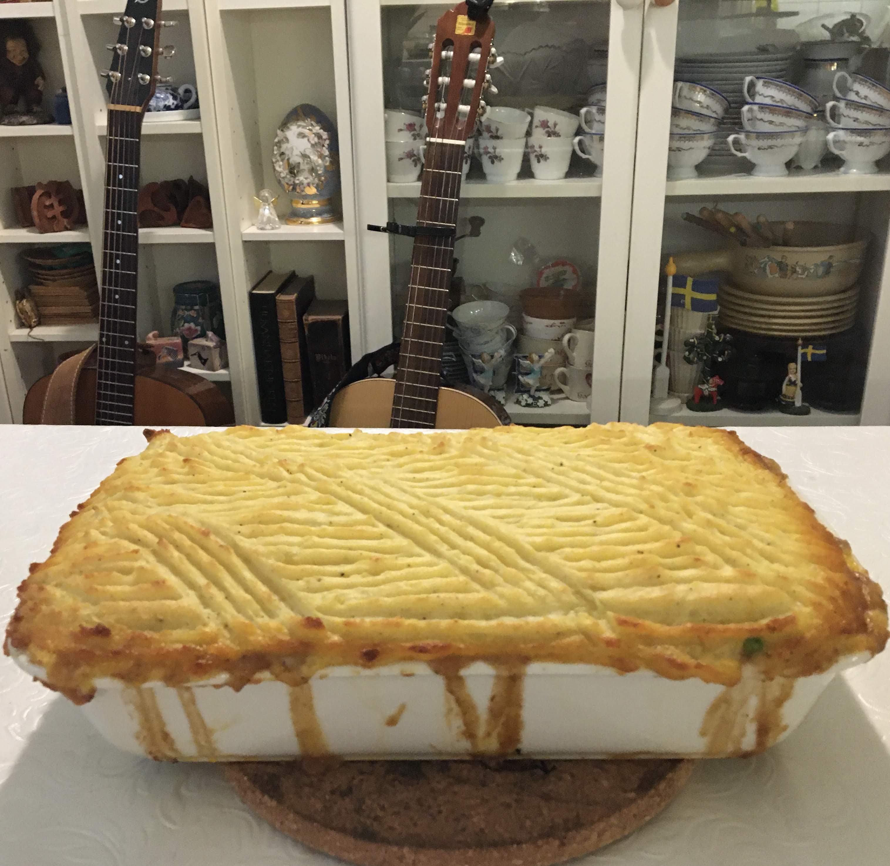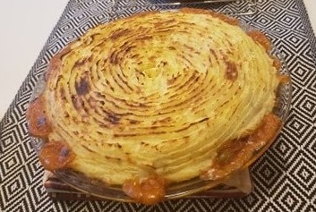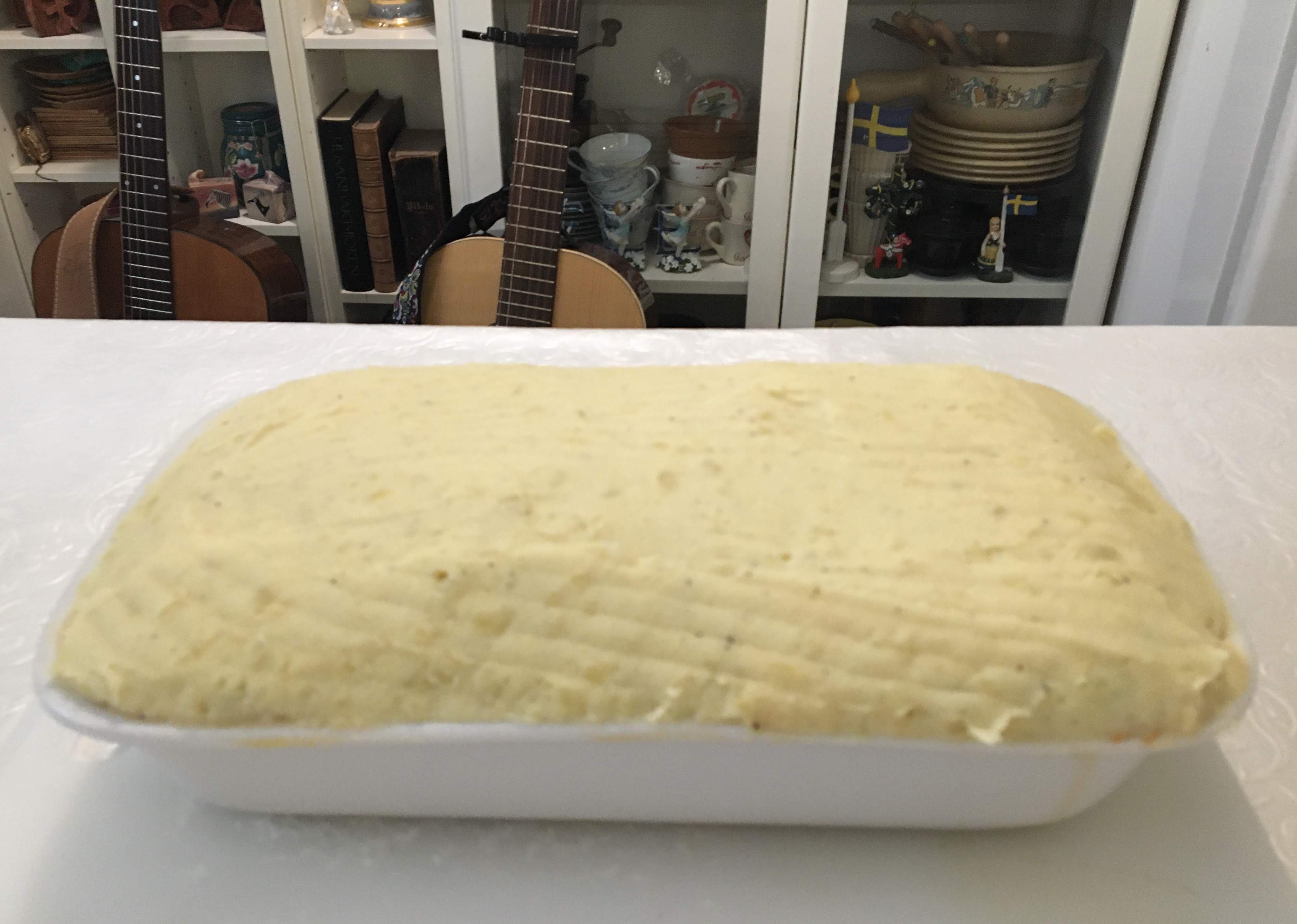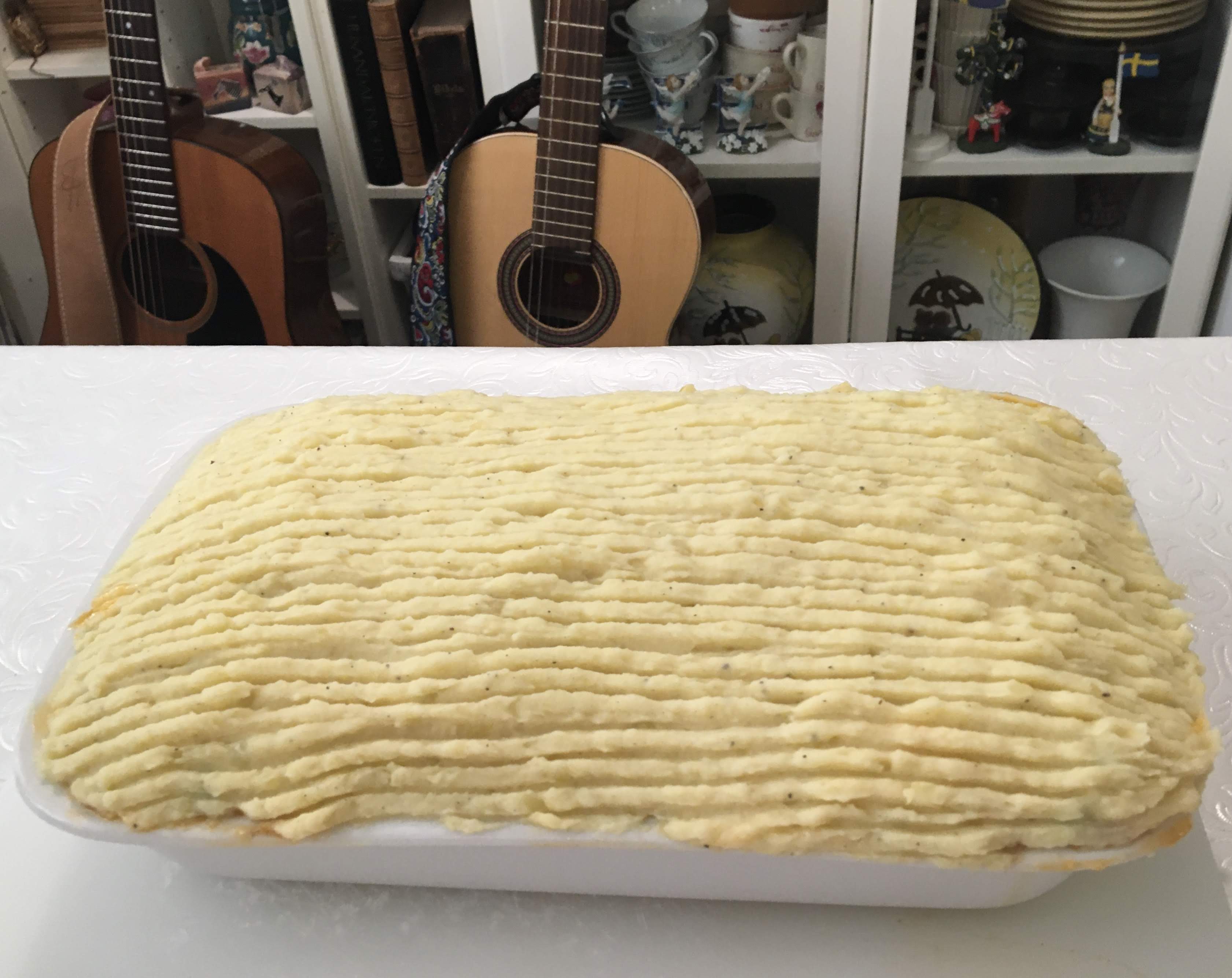 Pour the filling in a greased oven proof dish. Top with the green peas evenly all over the pie. Top with mashed potatoes: Spread the filling out evenly and spoon the mashed potatoes over top of the filling. Use a spatula to spread out the potatoes evenly over the filling. Make a nice pattern with a fork.