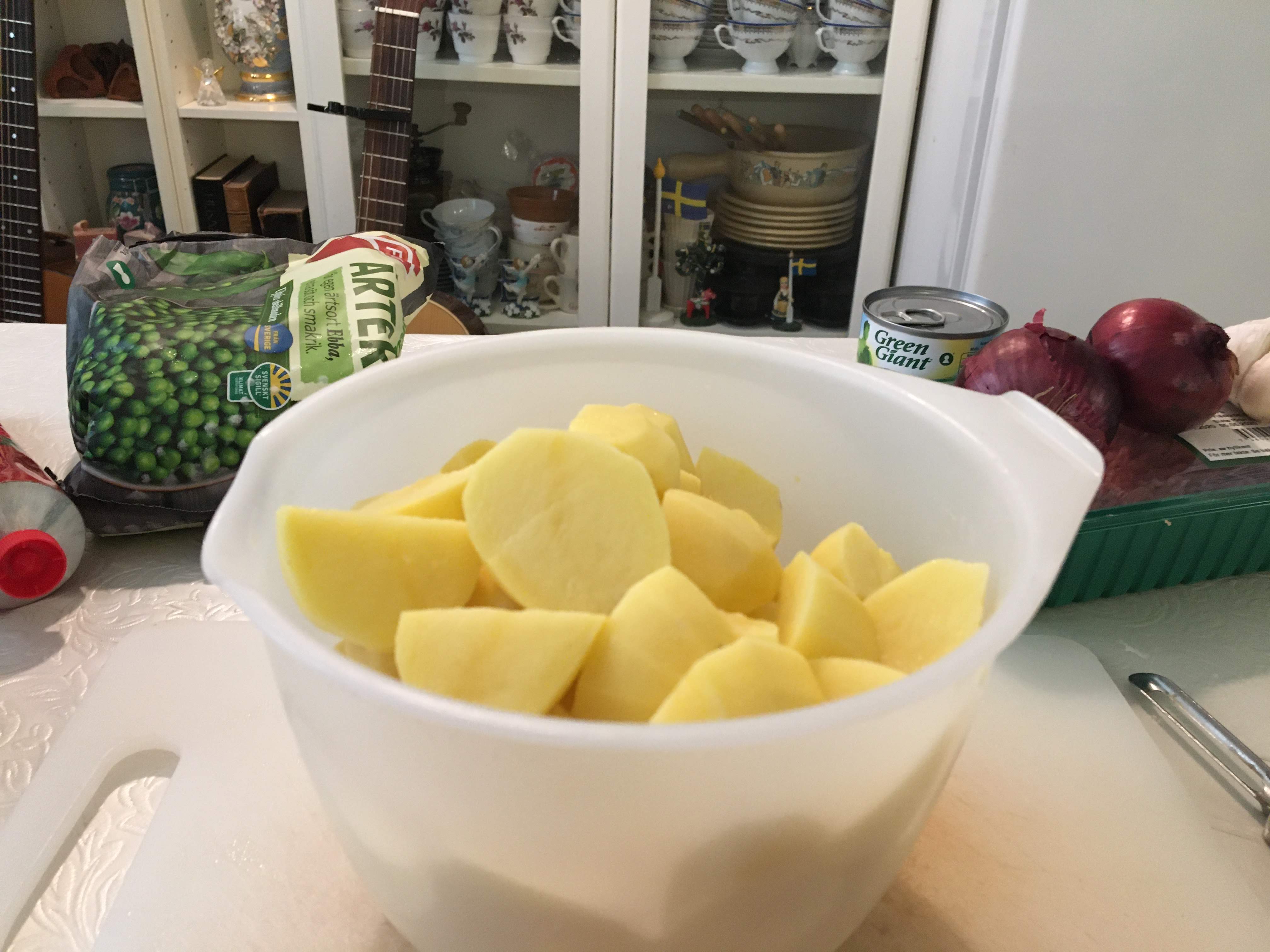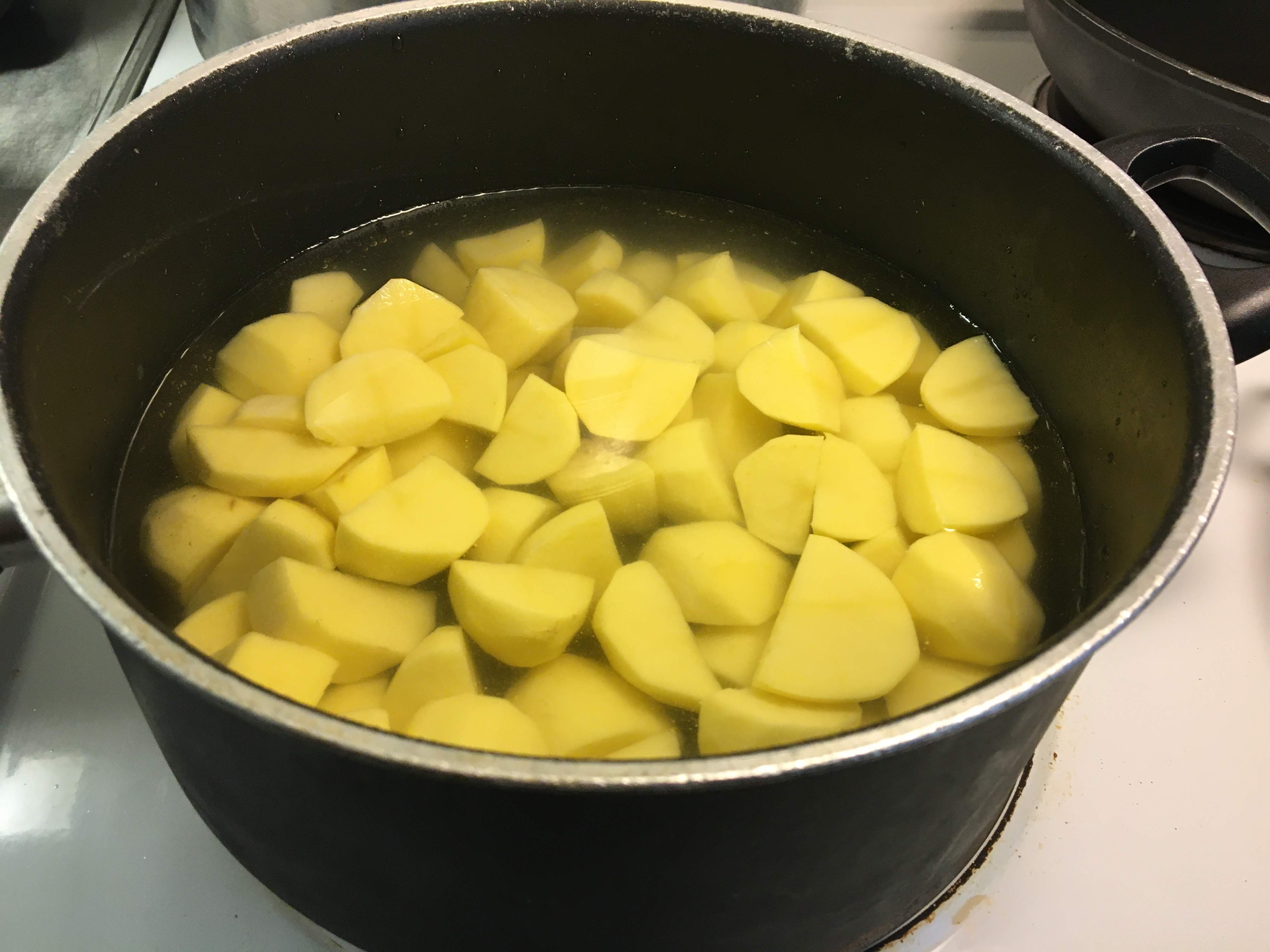 Add the peeled potatoes to a medium pot, fill with water. Turn the heat on high and allow the water to come to a boil, without the lid, reduce to a simmer. Allow the potatoes to simmer for 8 to 10 minutes, or until the potatoes are fork tender. Drain the potatoes from the water and place them back into the now empty pot that the potatoes were cooked in. Allow them to cool a little.