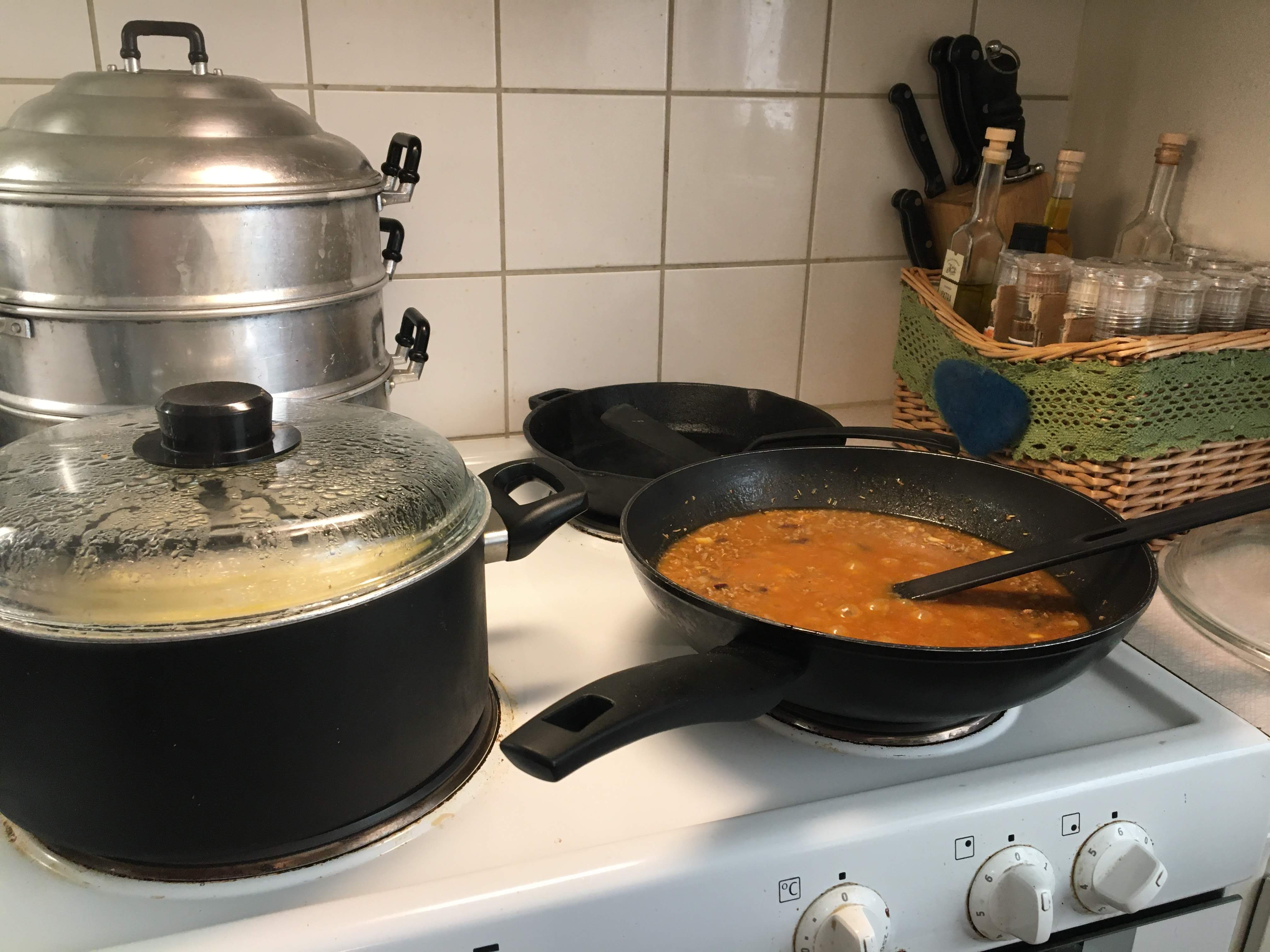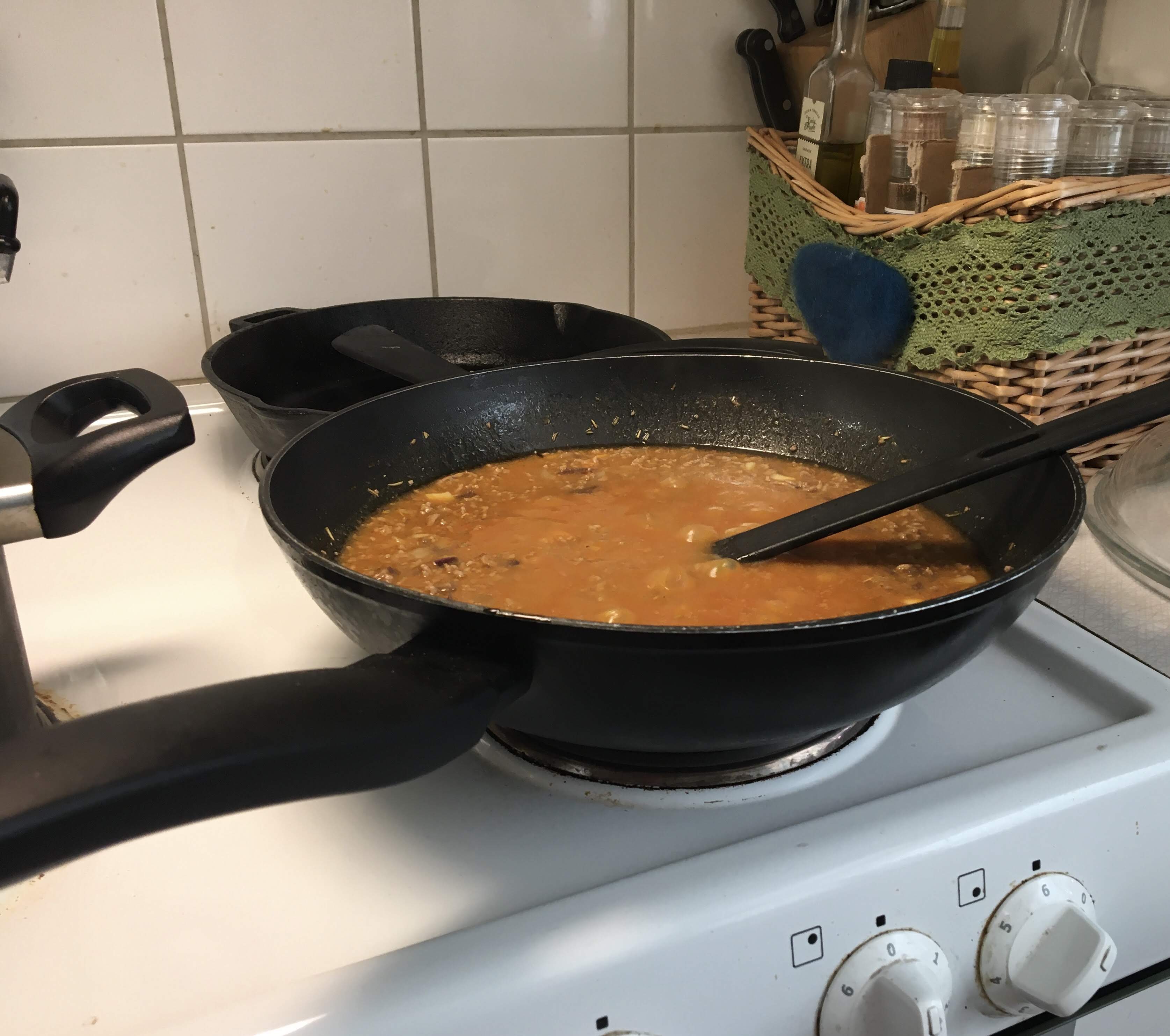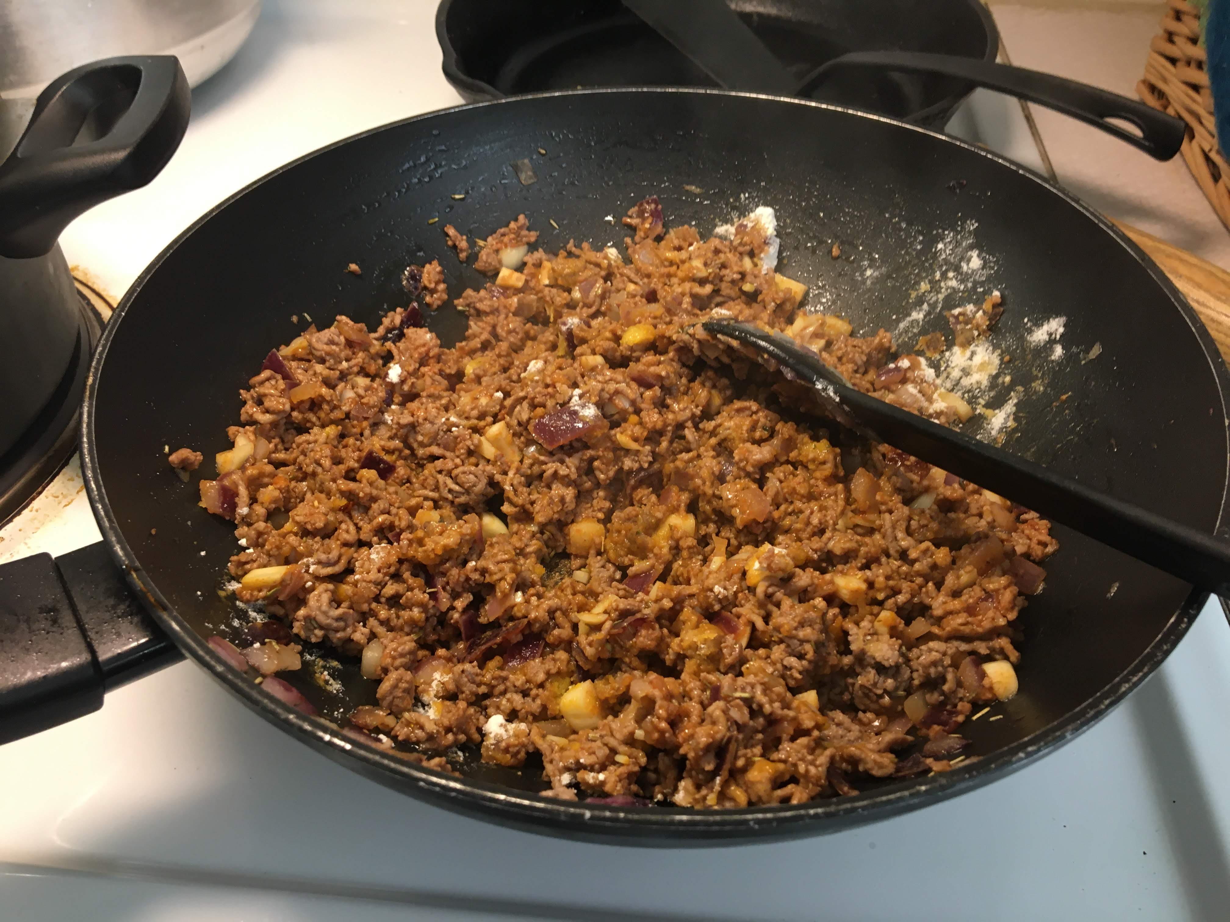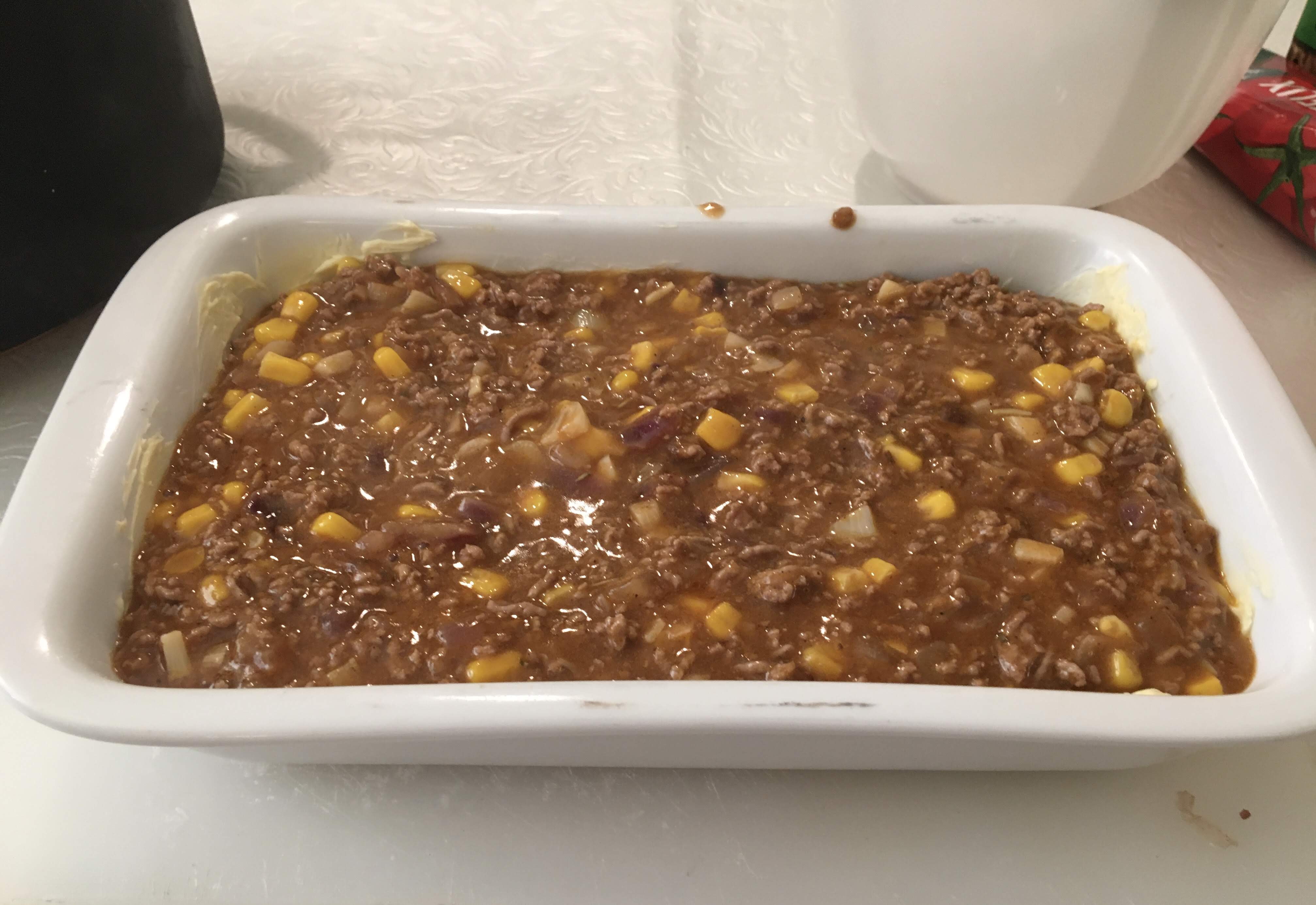 Heat a large, oven safe skillet over medium heat. Heat up the oil. Add the onion, allow it to cook until the onion is tender. Add the ground beef or lamb and break the beef up into small pieces, add salt and pepper and cook until the beef has mostly browned. Add the garlic and tomato paste and stir. Add the Worcestershire sauce. Add the rest of the spices. Add the flour over the filling and stir. Add the broth and wine or bear if you use wine or bear. If not add broth instead. Add the carrots and cook until the carrots are tender (if using fresh carrots). Add the corn.