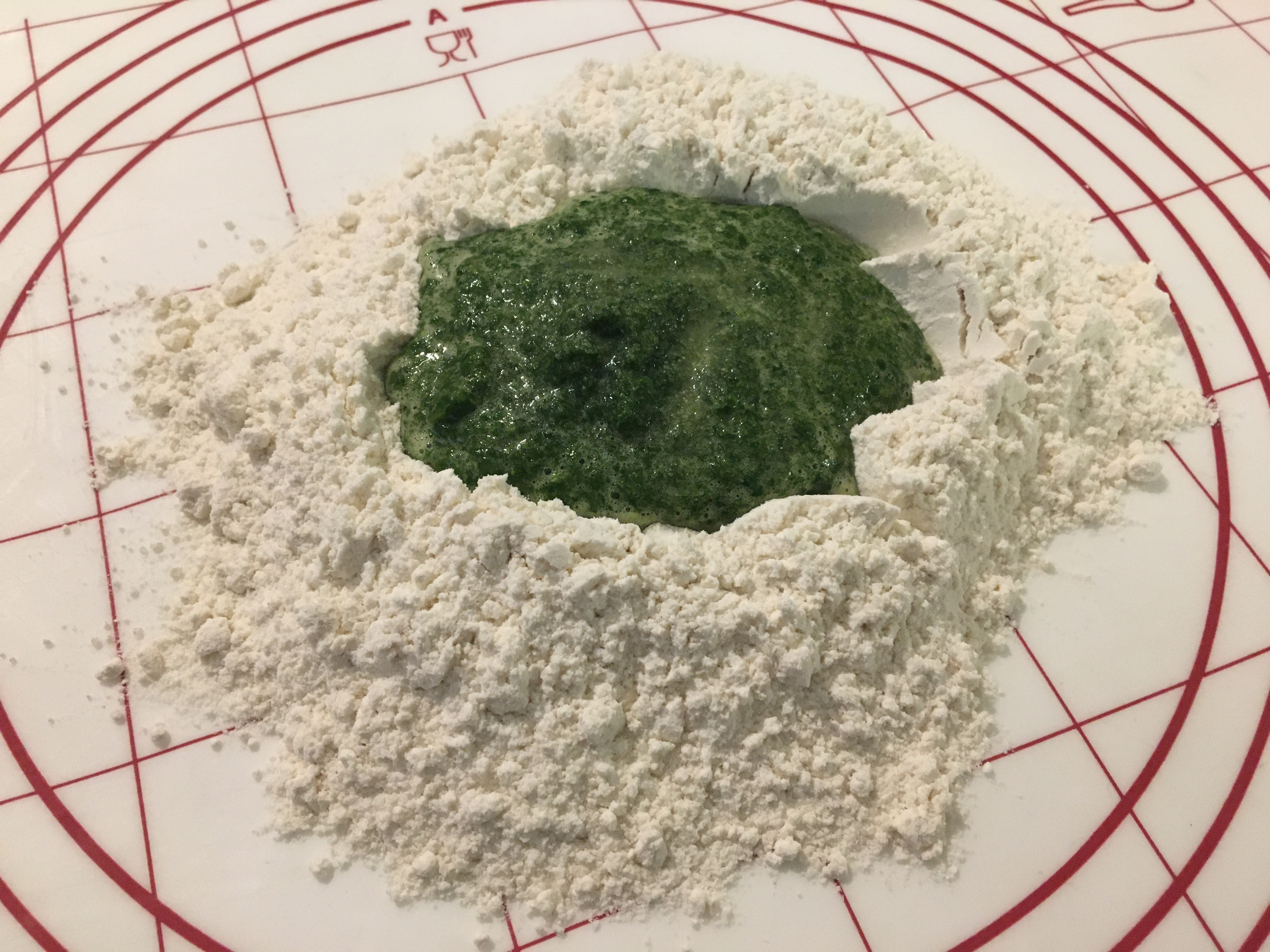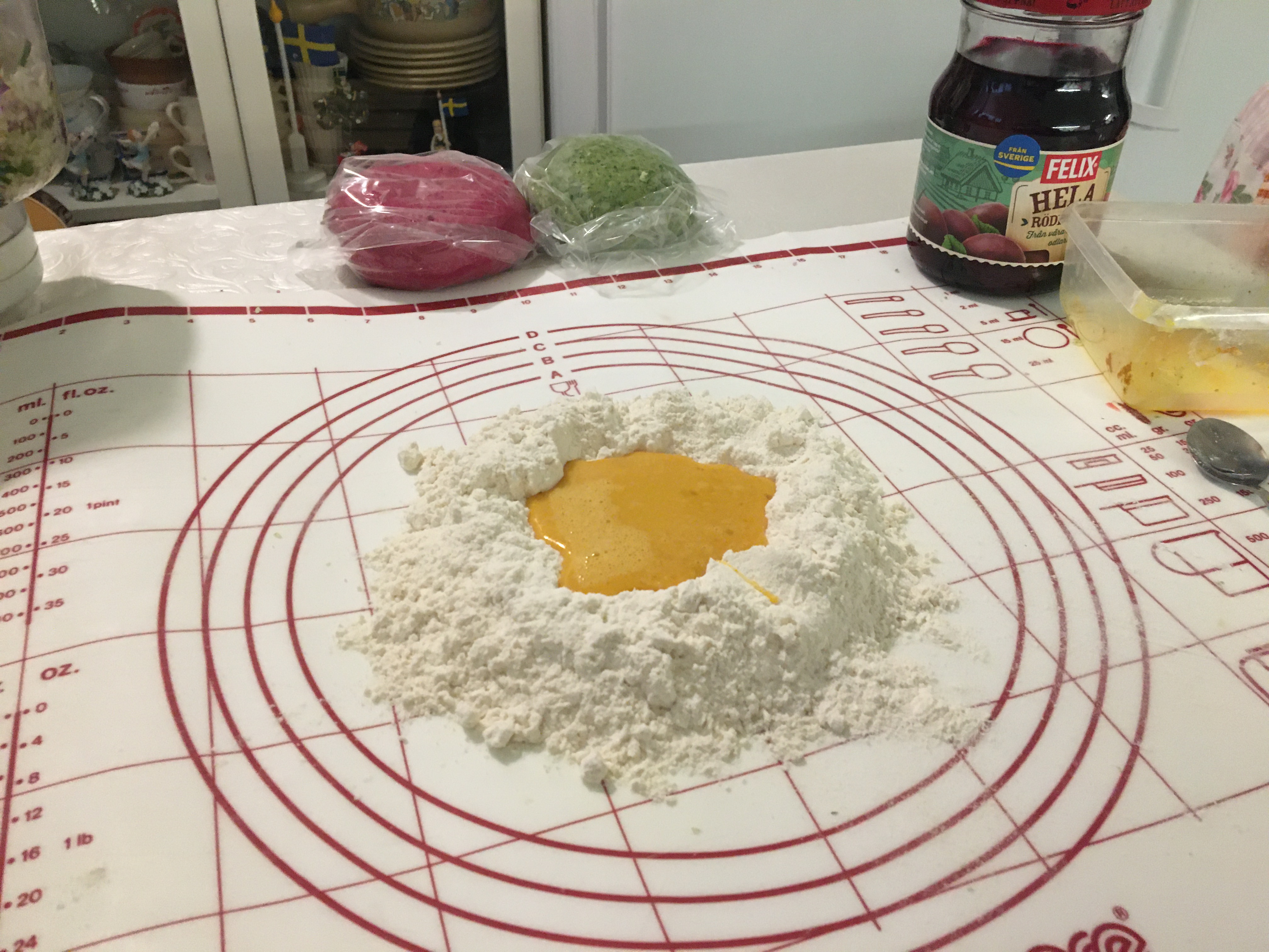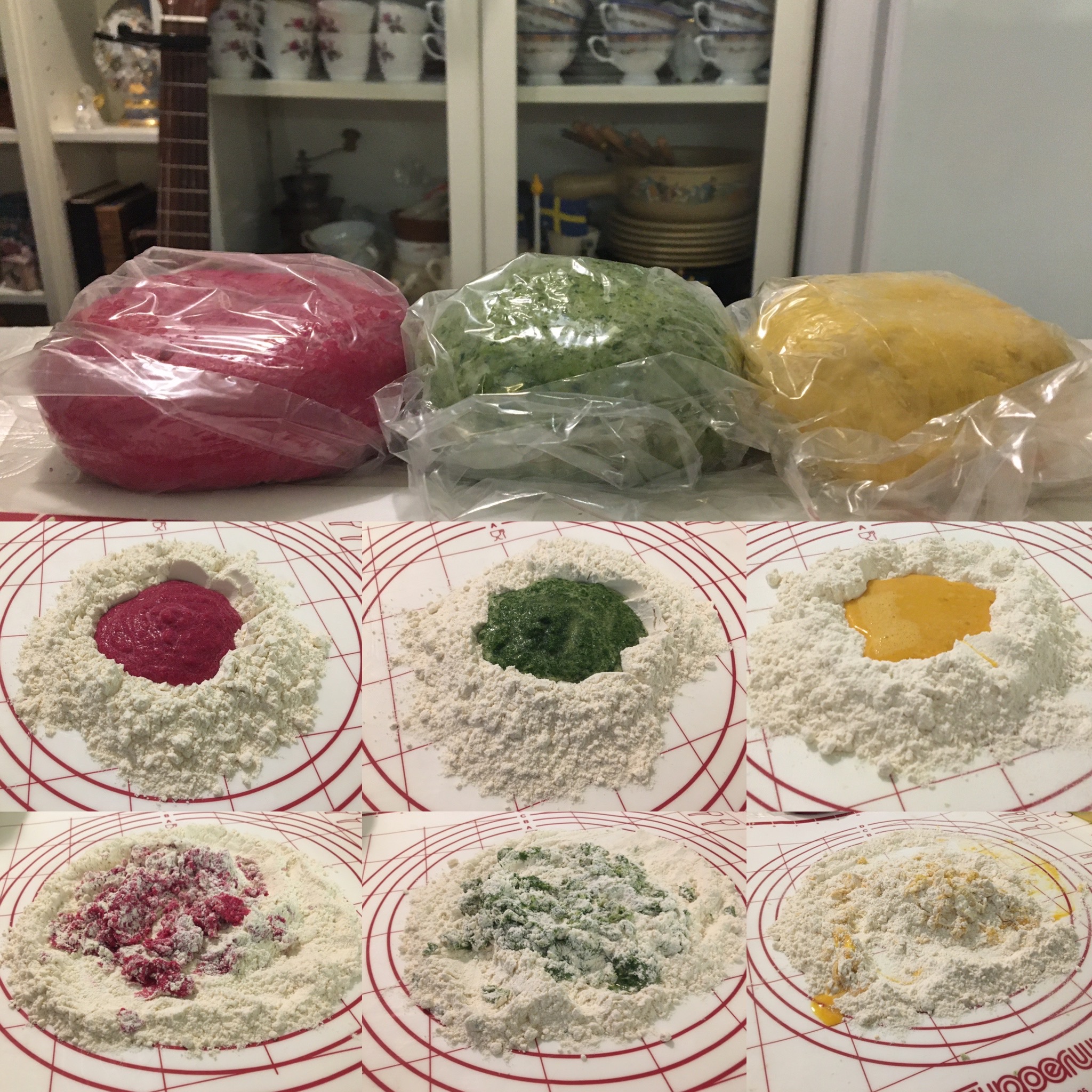 To make the colors I put the vegetables one color at the time in my blender, added 1 egg, a pinch of salt and 1 tsp olive oil for each part and blended. Then I added the mix in the middle of the “well” I created with my 100 g flour for each color.