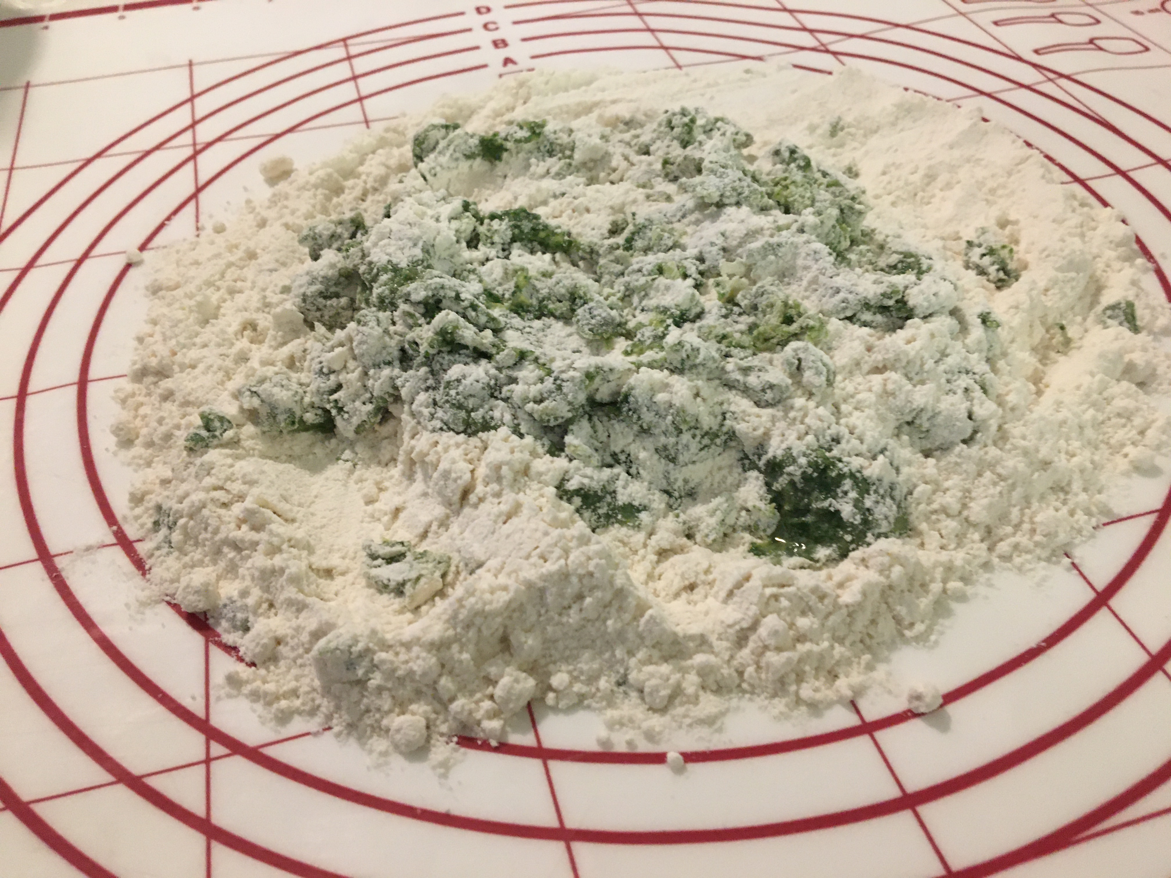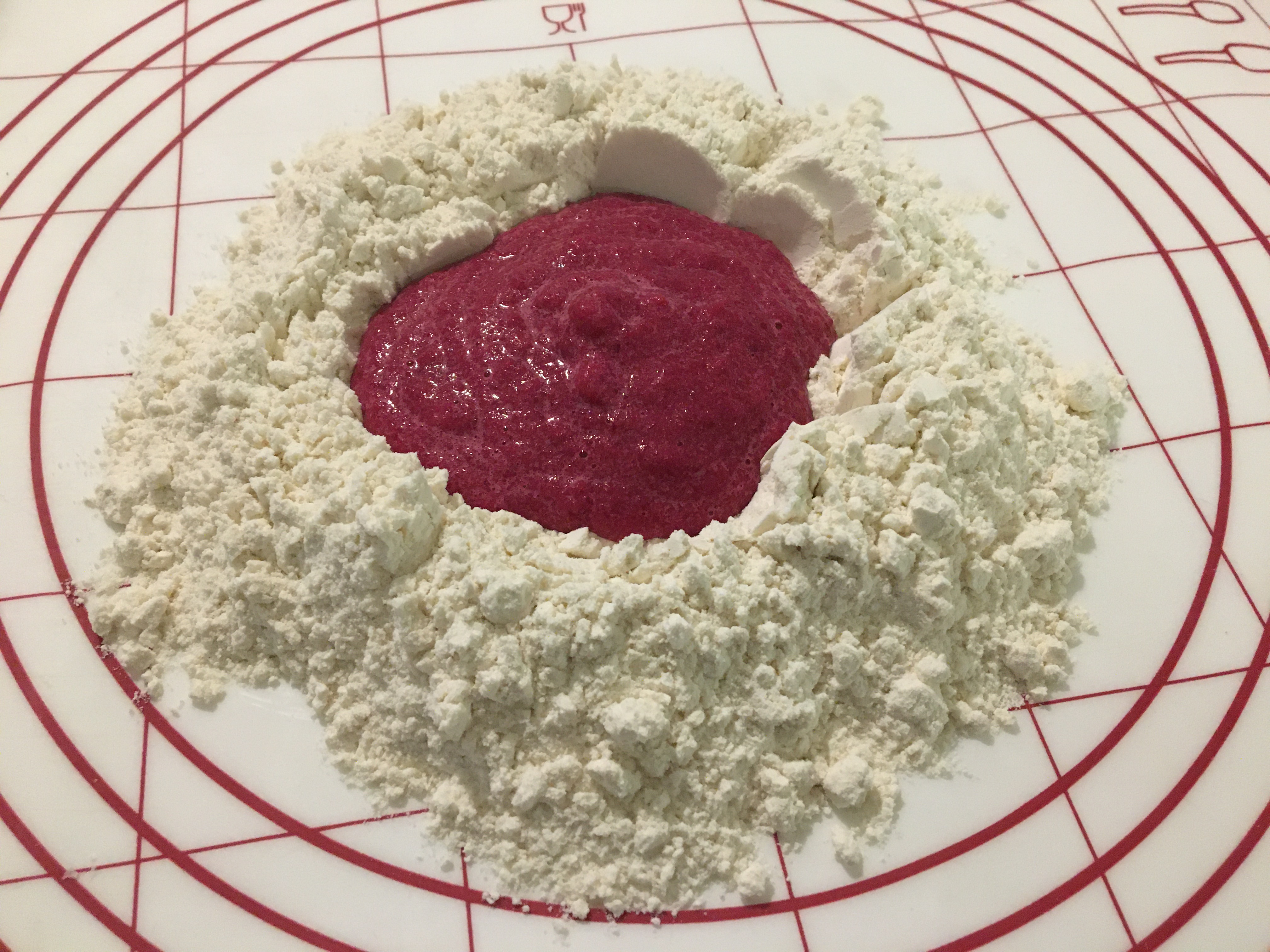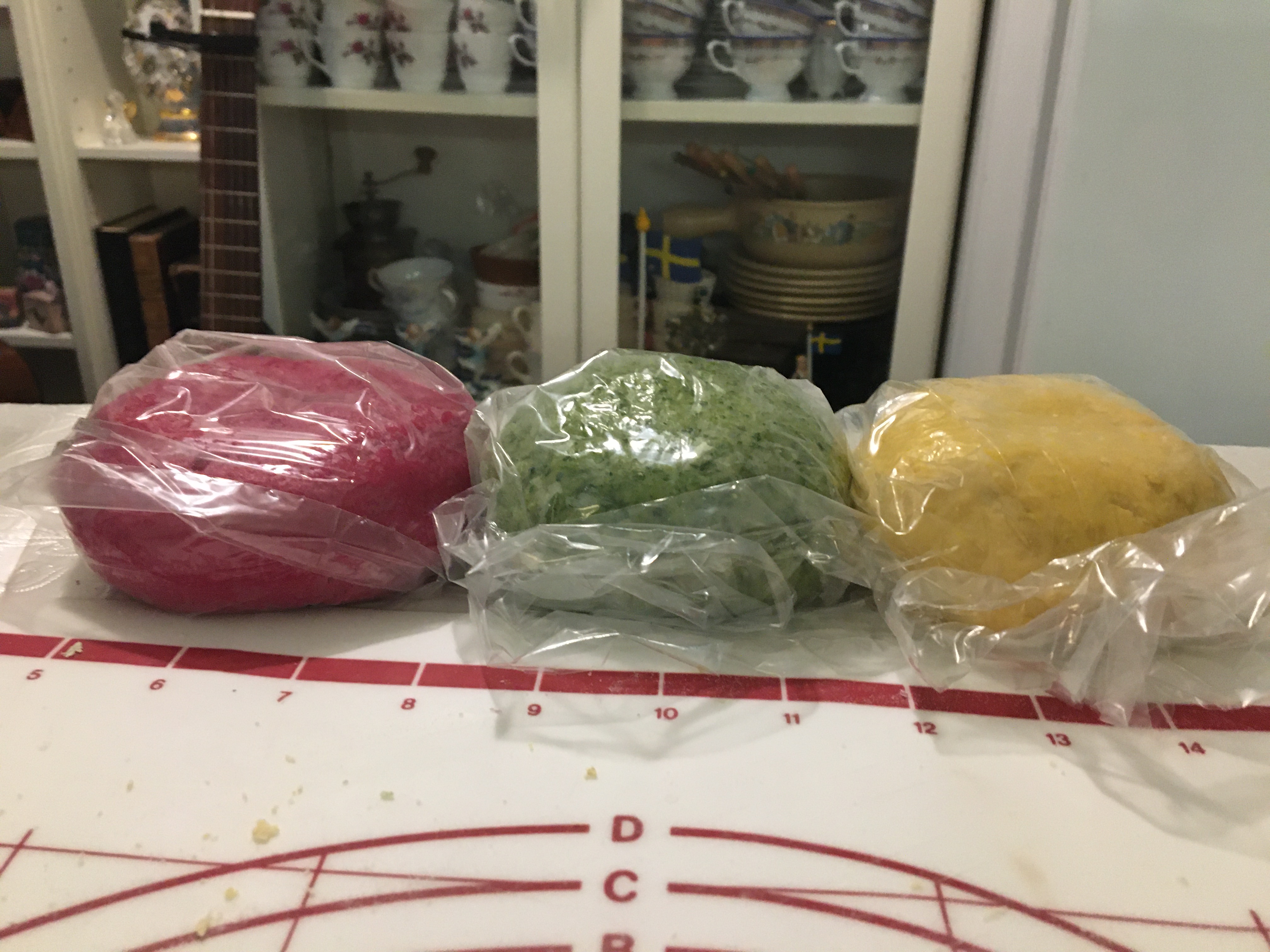 To make the colors I put the vegetables one color at the time in my blender, added 1 egg, a pinch of salt and 1 tsp olive oil for each part and blended. Then I added the mix in the middle of the “well” I created with my 100 g flour for each color.