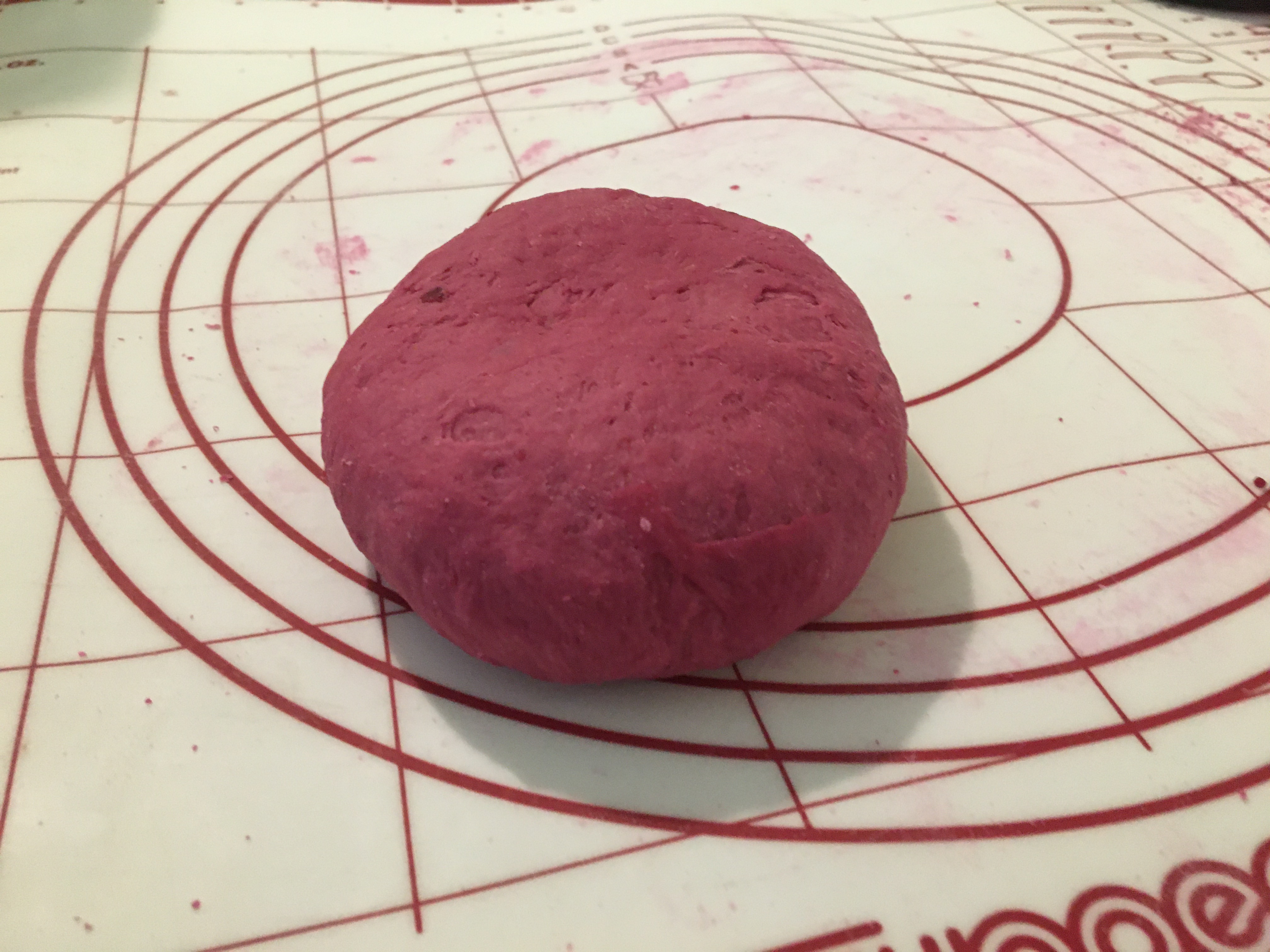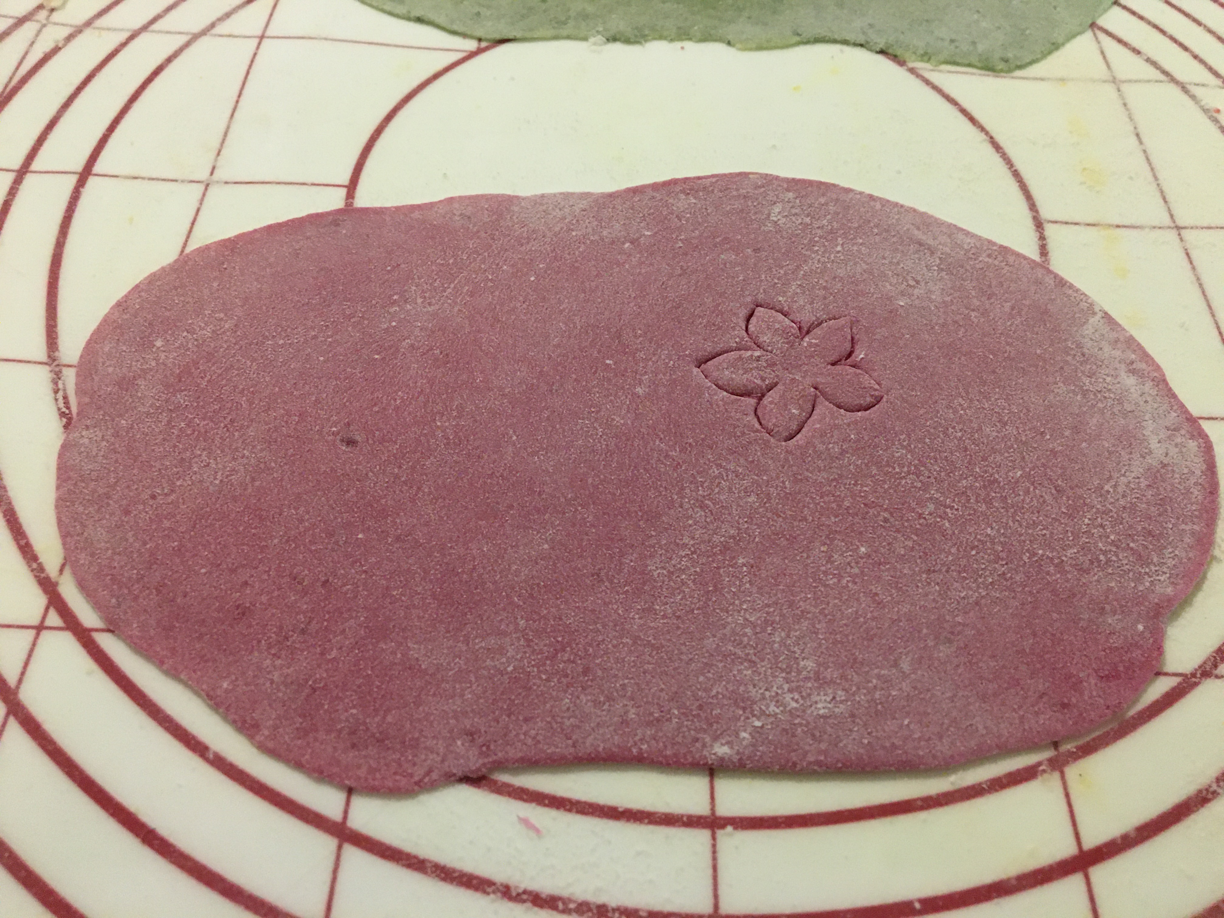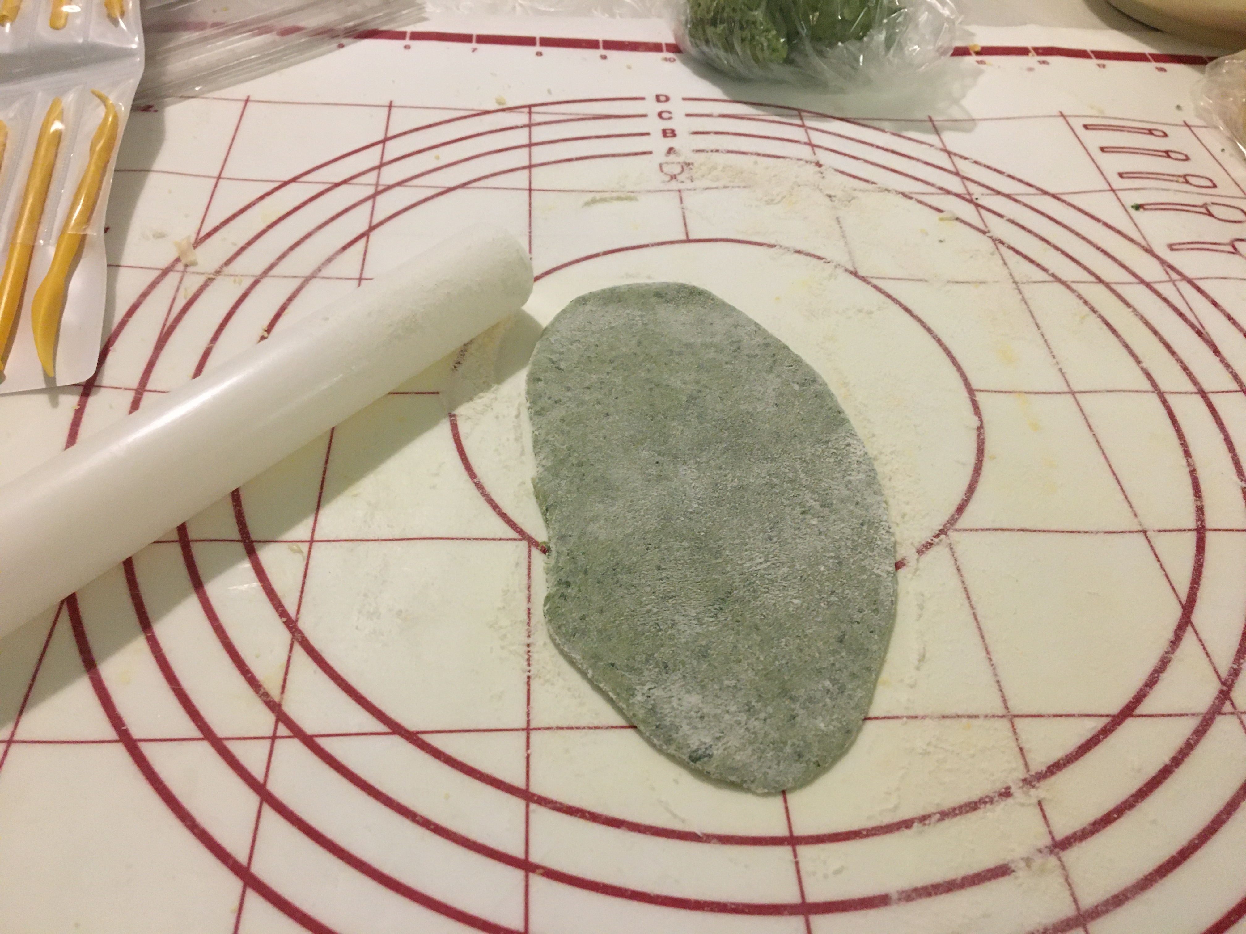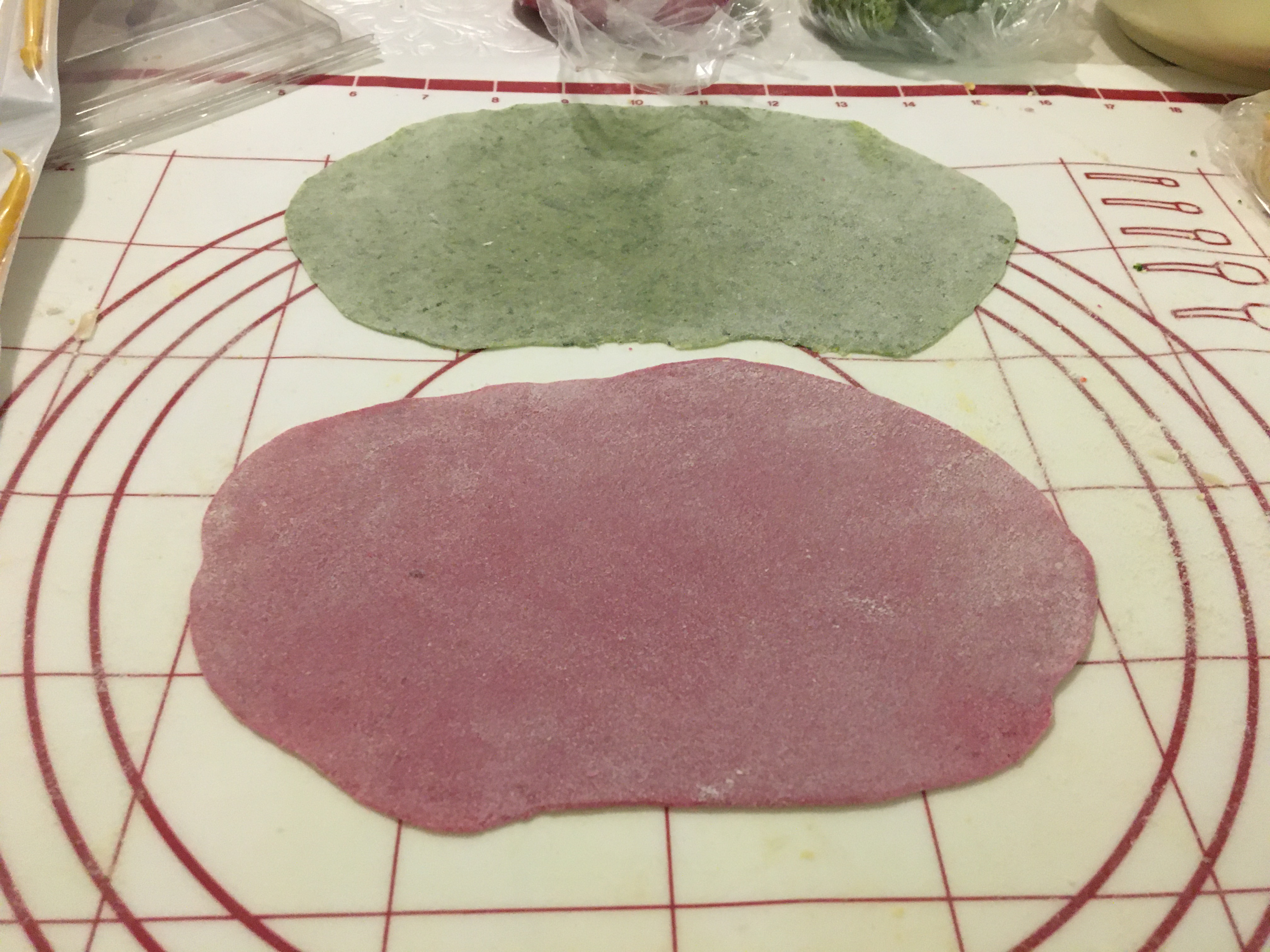 Flour your table well, and use your rolling pin to roll out the dough. With each pass as you roll, lift the dough up, re-dust the counter beneath, and flip it over. When you’re finished, you should have a thin piece of dough. It should be just about paper thin, but strong enough to be lifted off of the table. If you want to mix colores you have to place them in the pattern you like on top of another and roll them to integrate in each other. This is a little hard and easier with a machine. However I used my rolling pin since I don´t have a machine.