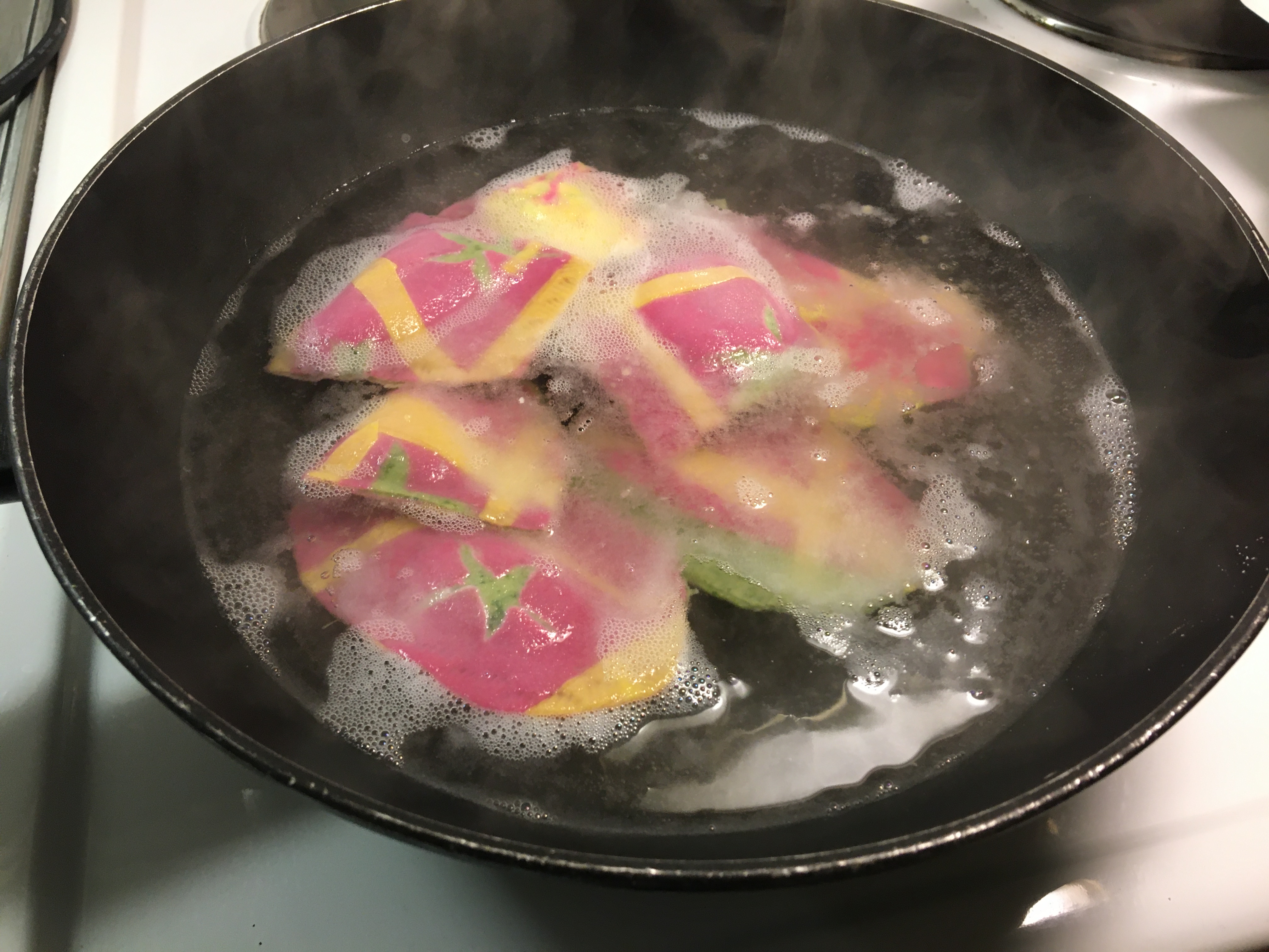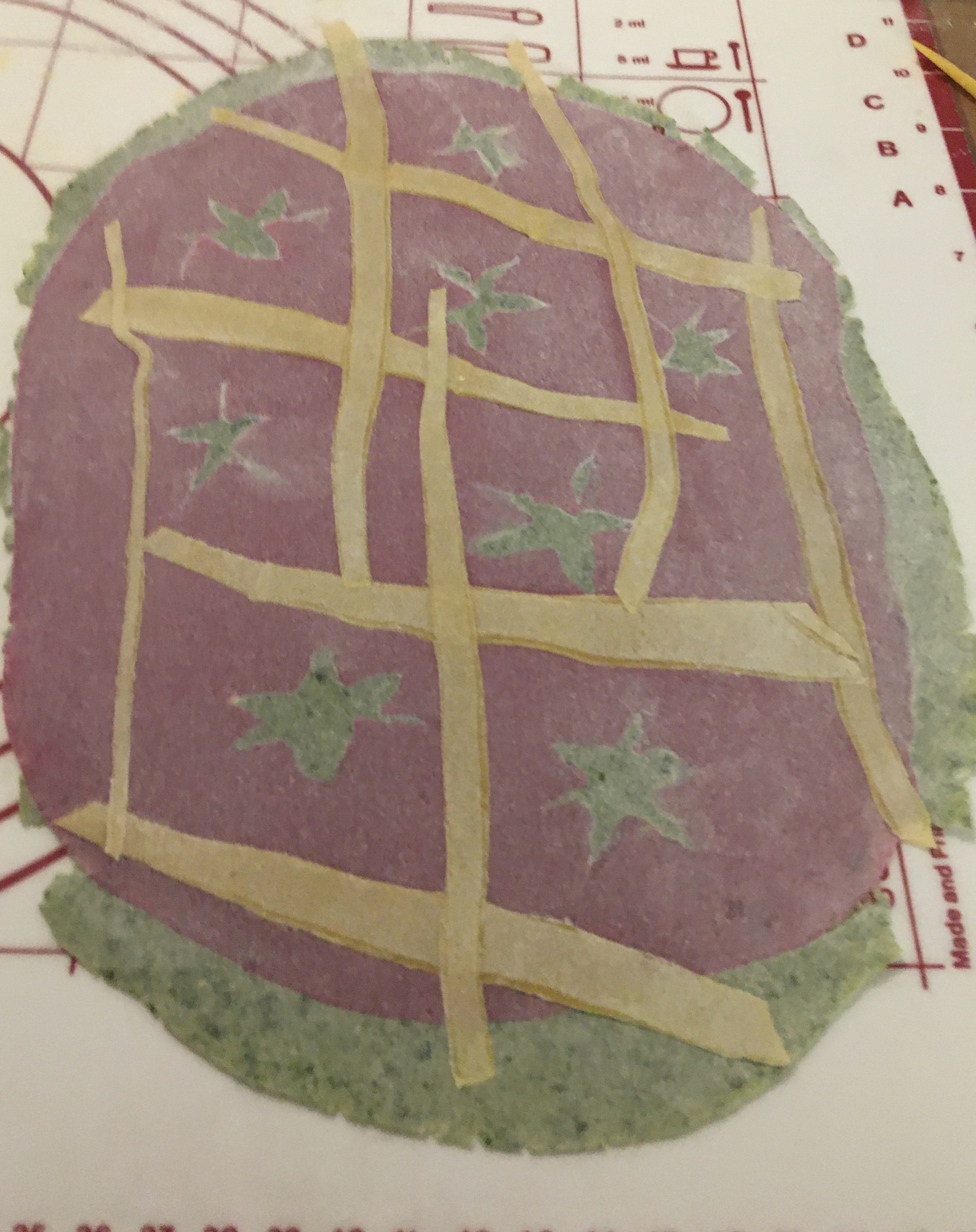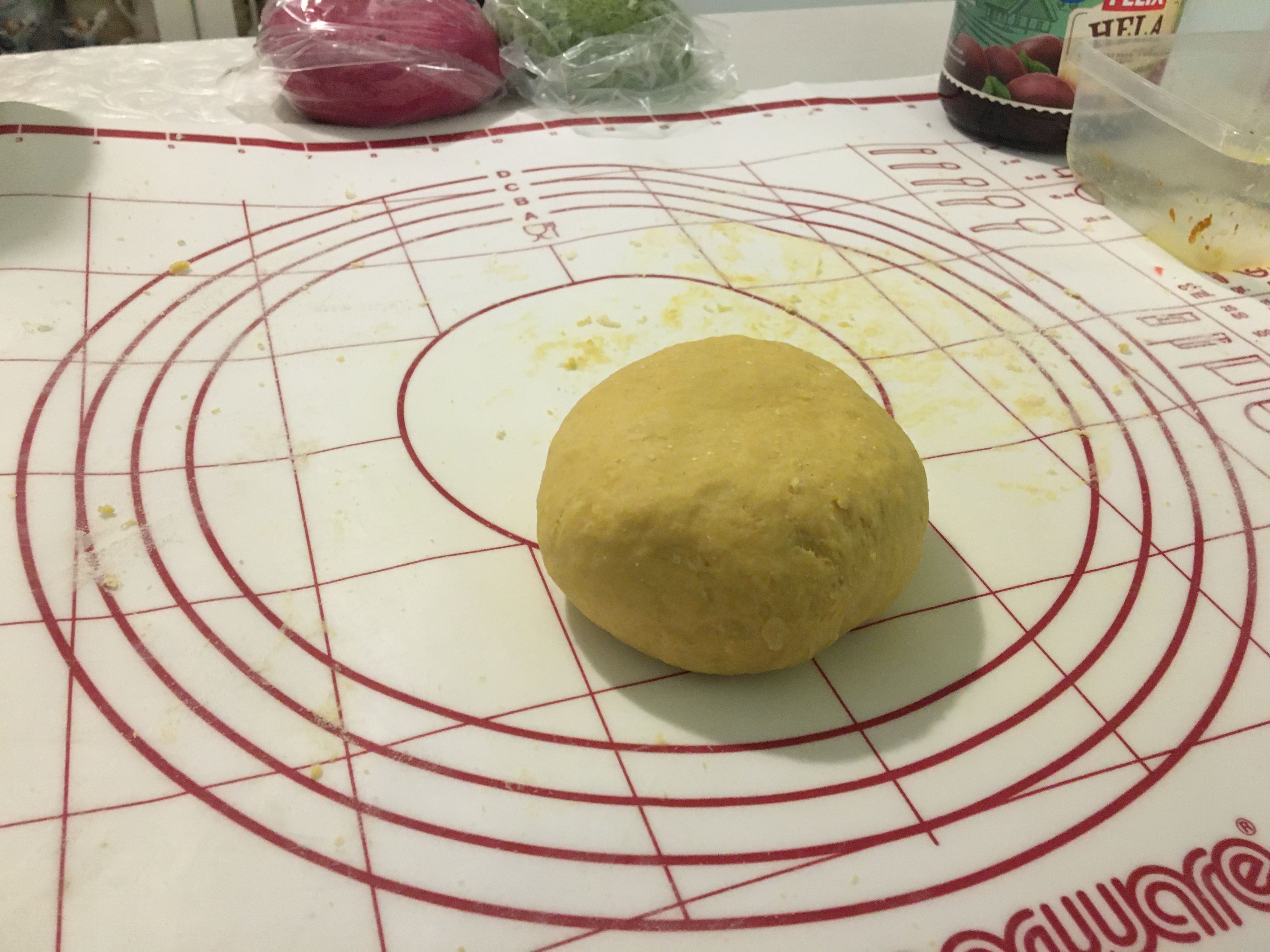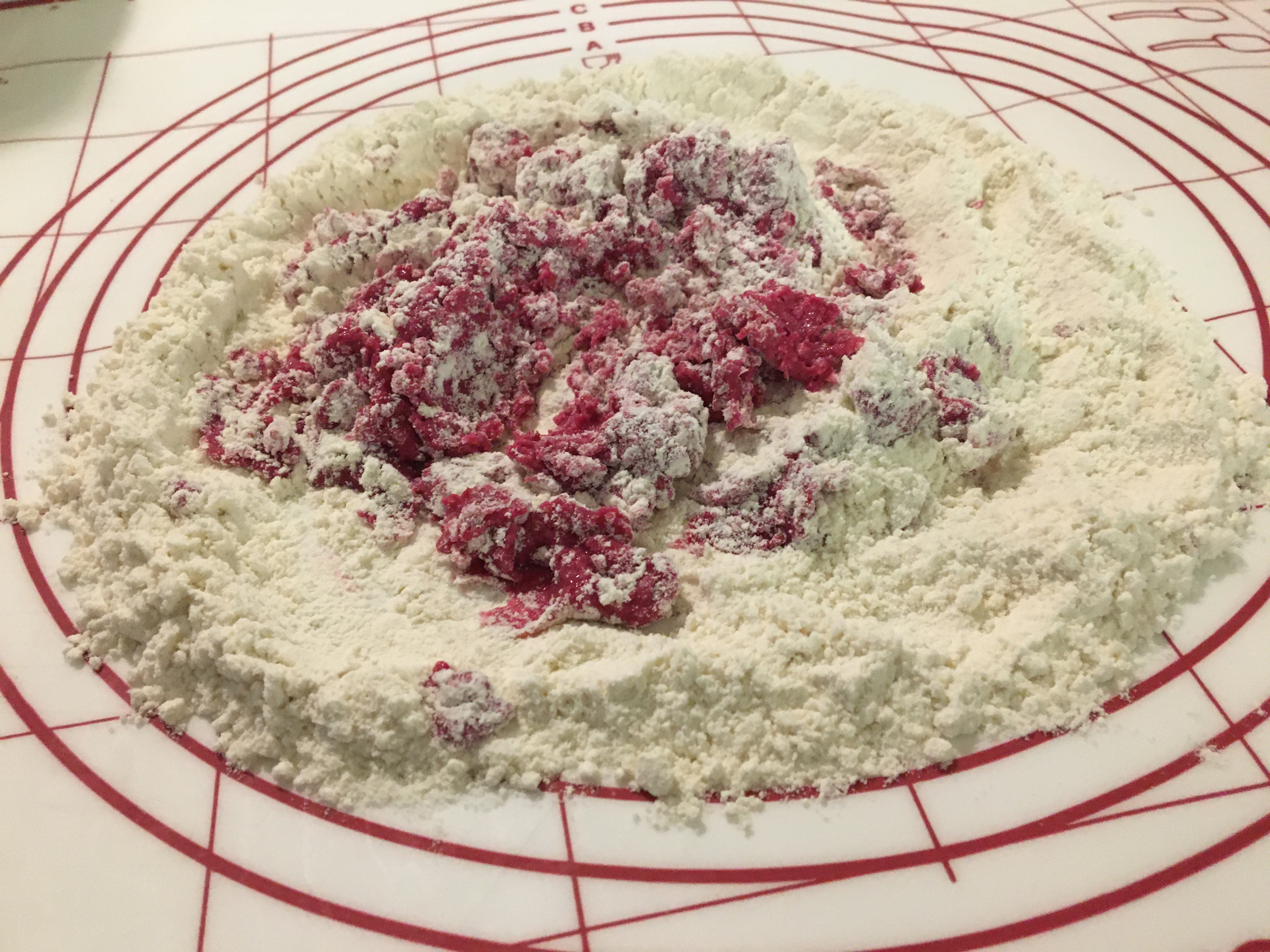 Flour your table well, and use your rolling pin to roll out the dough. With each pass as you roll, lift the dough up, re-dust the counter beneath, and flip it over. When you’re finished, you should have a thin piece of dough. It should be just about paper thin, but strong enough to be lifted off of the table. If you want to mix colores you have to place them in the pattern you like on top of another and roll them to integrate in each other. This is a little hard and easier with a machine. However I used my rolling pin since I don´t have a machine.