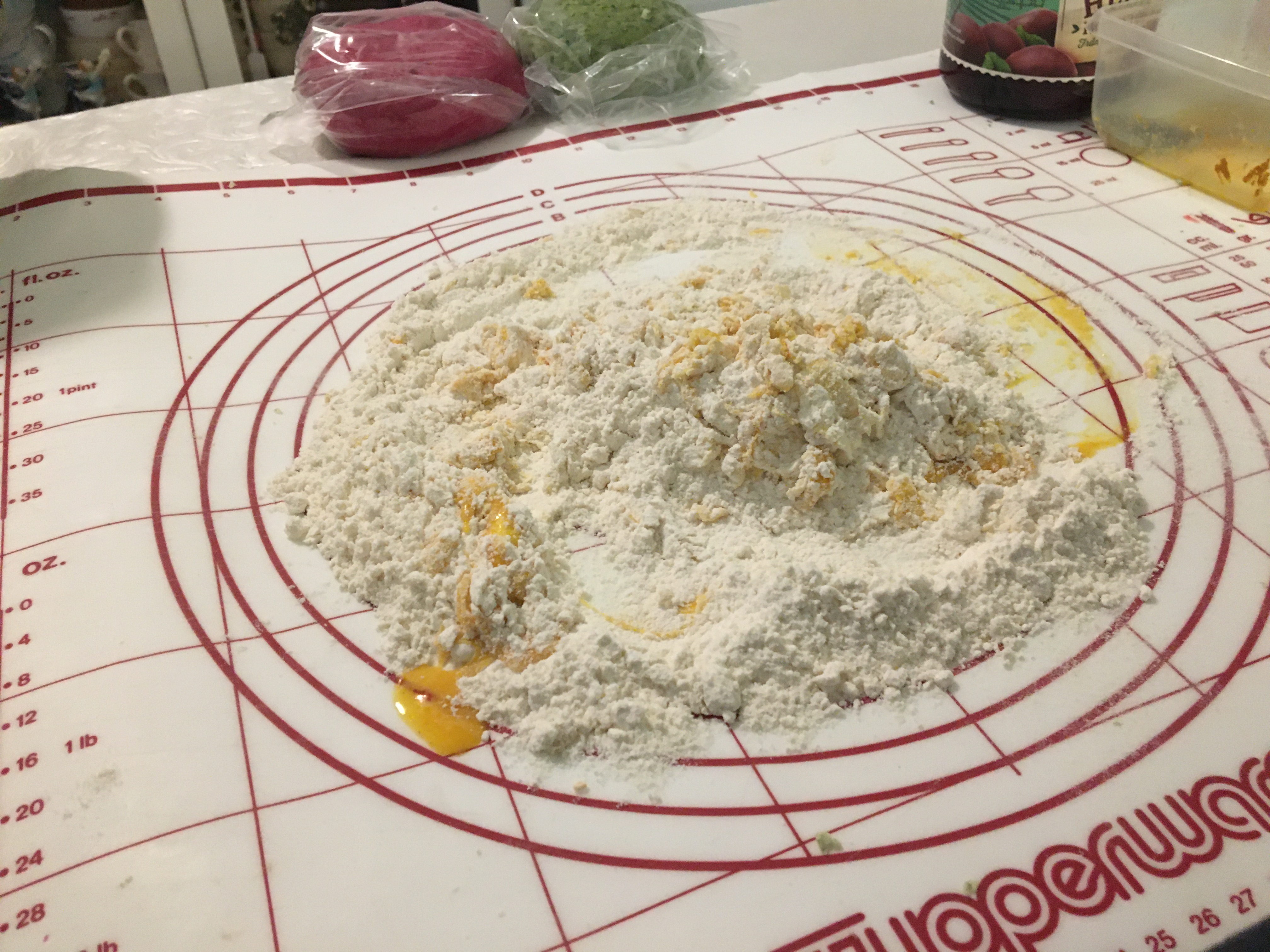 Continue whisking the eggs, but begin pulling in bits of flour from inside the well. Use a stirring motion and go slowly to avoid any eggs breaking through the flour.