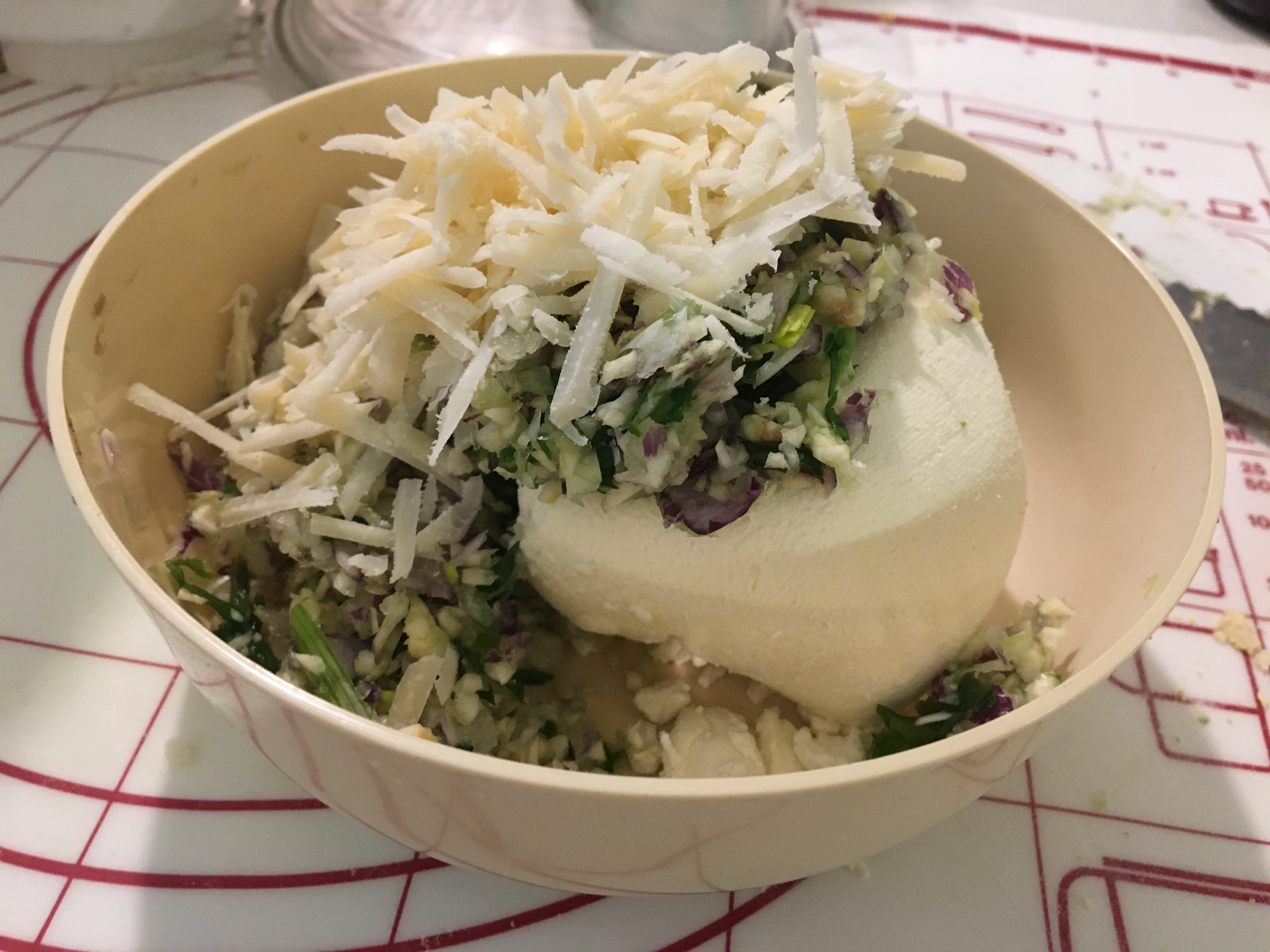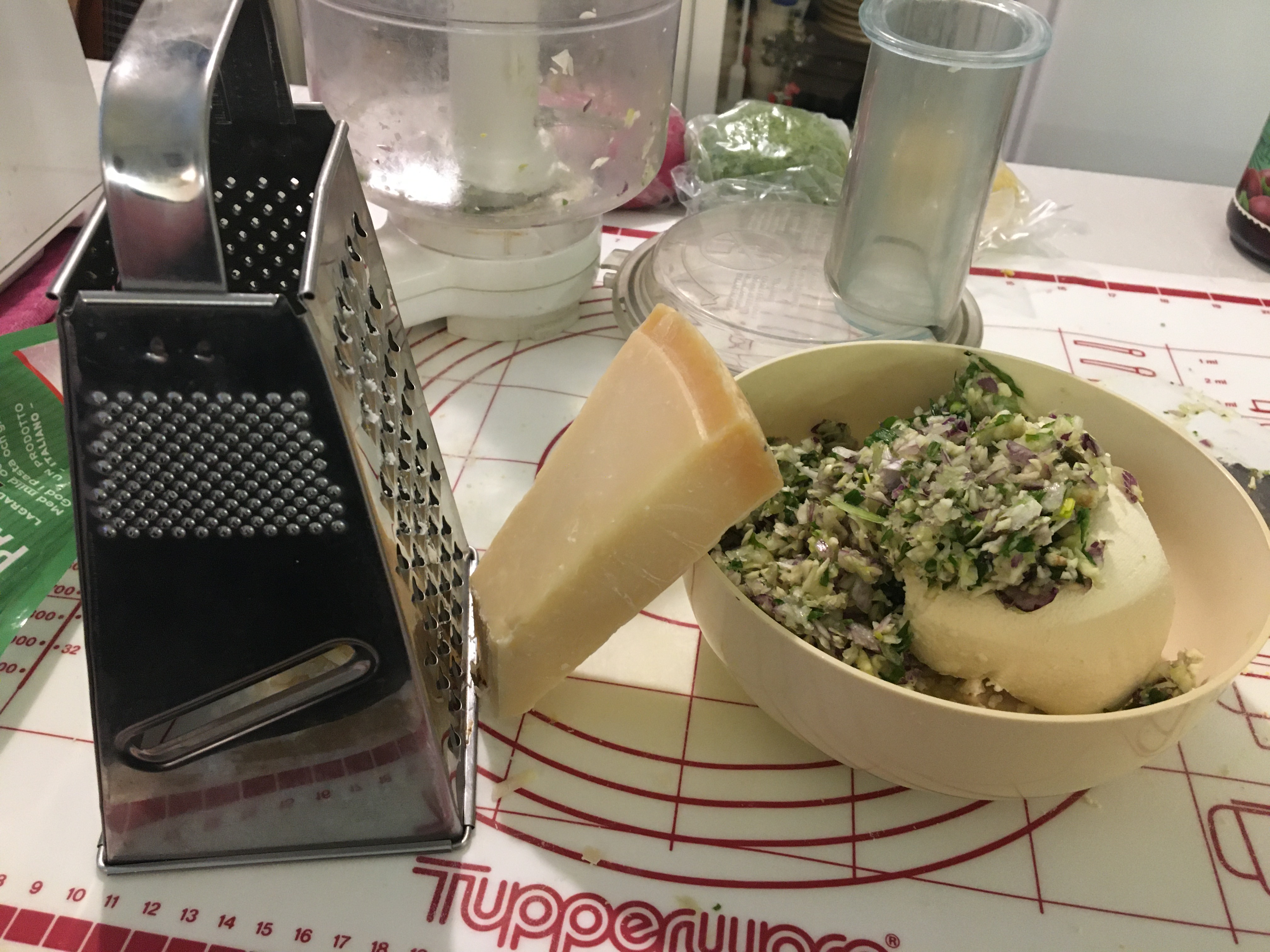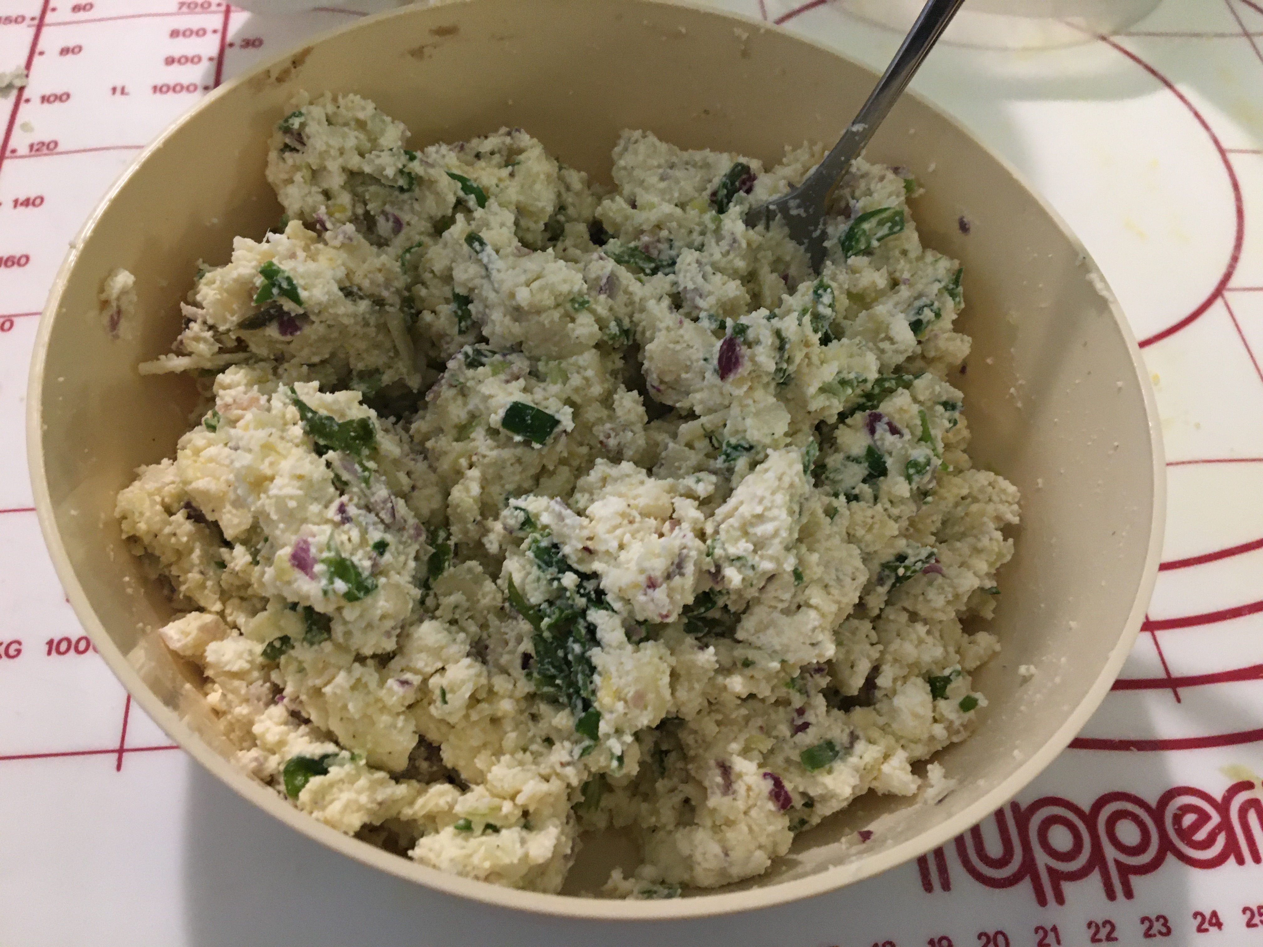 I made my own Ricotta Cheese. On the link here you find my recipe how to make the cheese. When the cheese was done I mixed in chopped red onion, chopped spring onions and some other greens I had, 1 egg, salt, pepper and shredded parmigiano cheese. Then mixed with a fork.