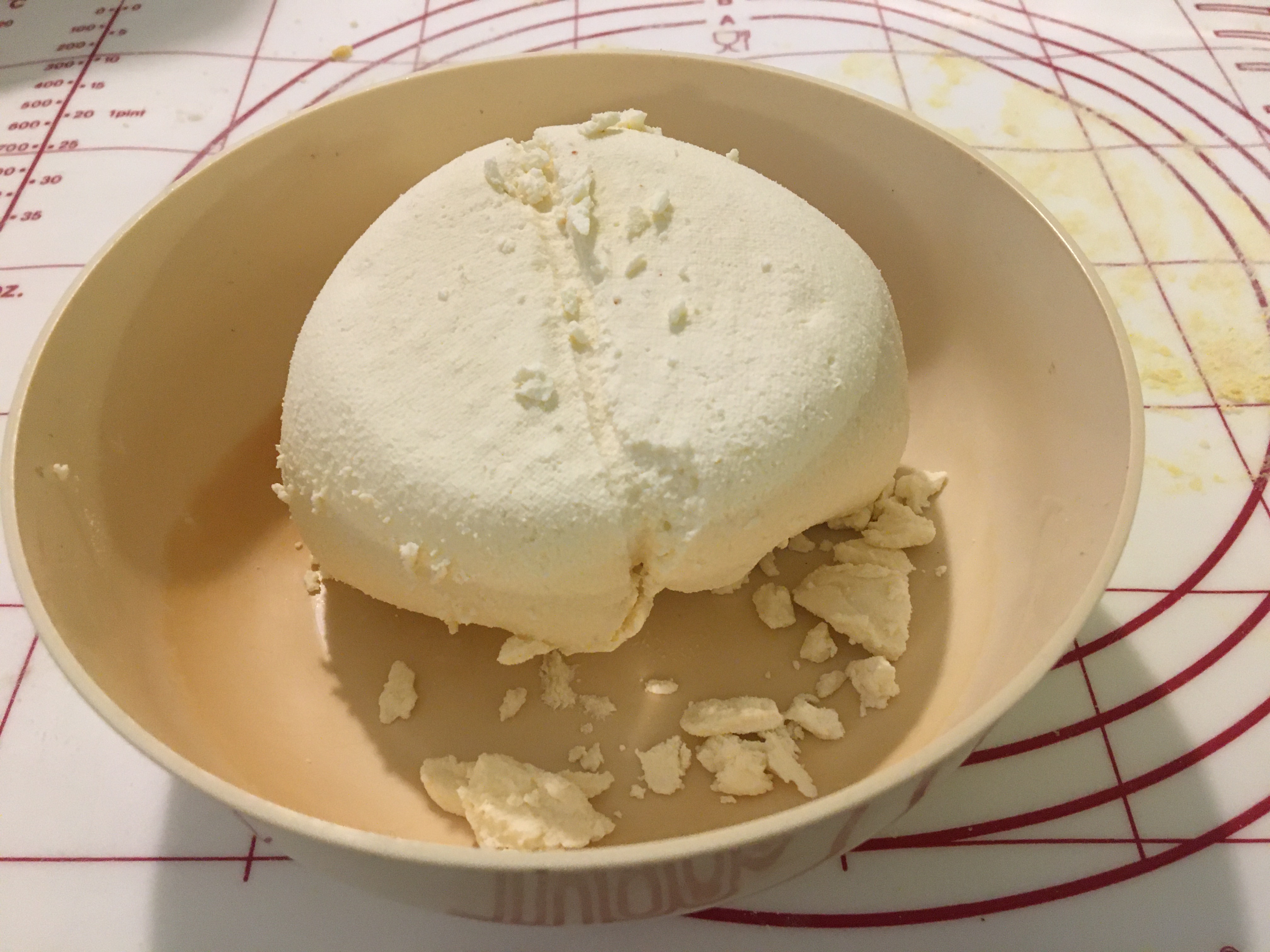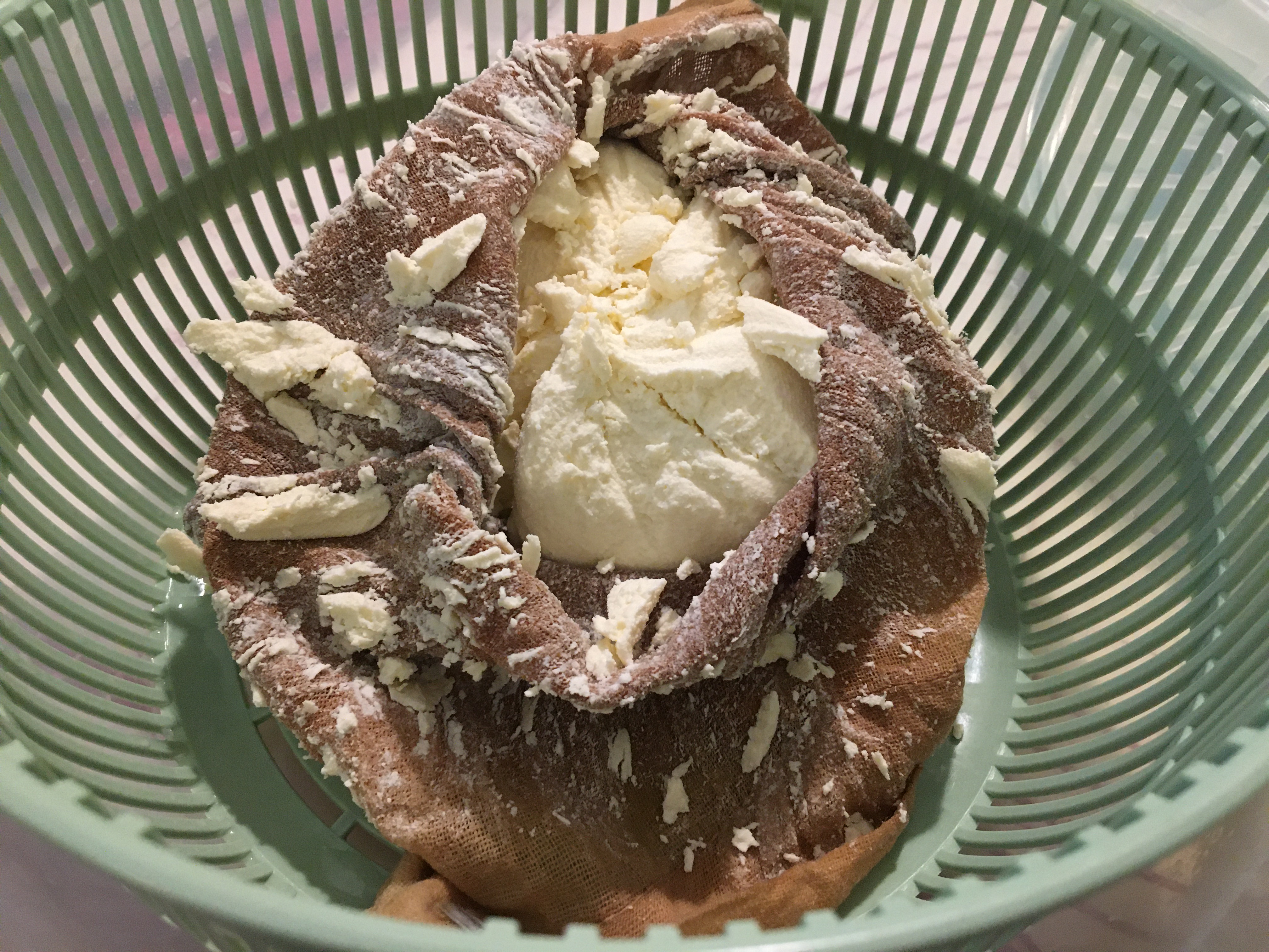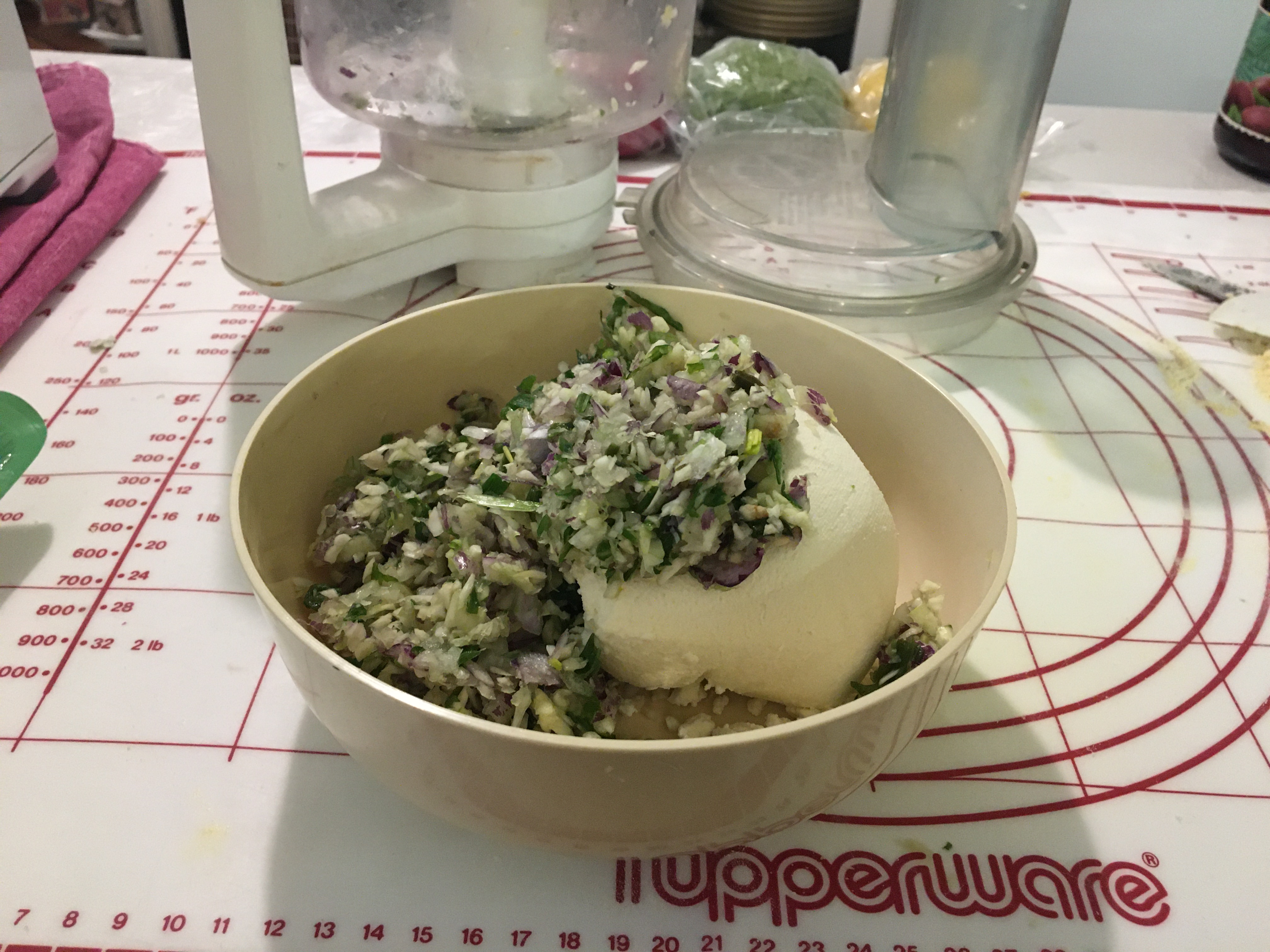 I made my own Ricotta Cheese. On the link here you find my recipe how to make the cheese. When the cheese was done I mixed in chopped red onion, chopped spring onions and some other greens I had, 1 egg, salt, pepper and shredded parmigiano cheese. Then mixed with a fork.