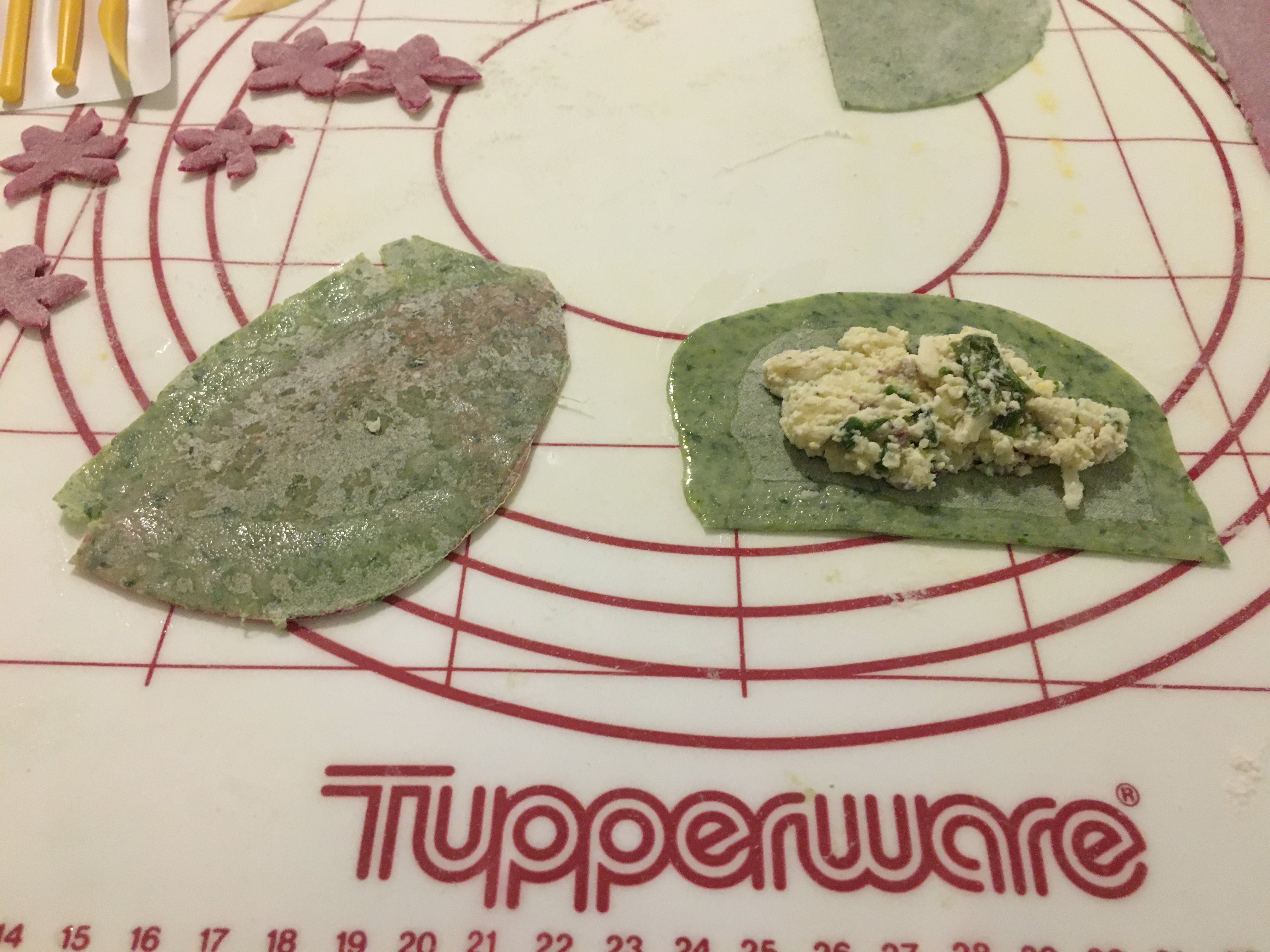 To make the ravioli you make a filling according to your liking and place it in the middle of one part of the ravioli. With your finger and a little water brush around the edge and press the top on. Make sure it is tight so the filling does not come out when cooking later. I made my own Ricotta Cheese for my filling. See link at the end of my recipe. You add the spices you like for your ravioli to your cheese.
