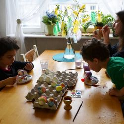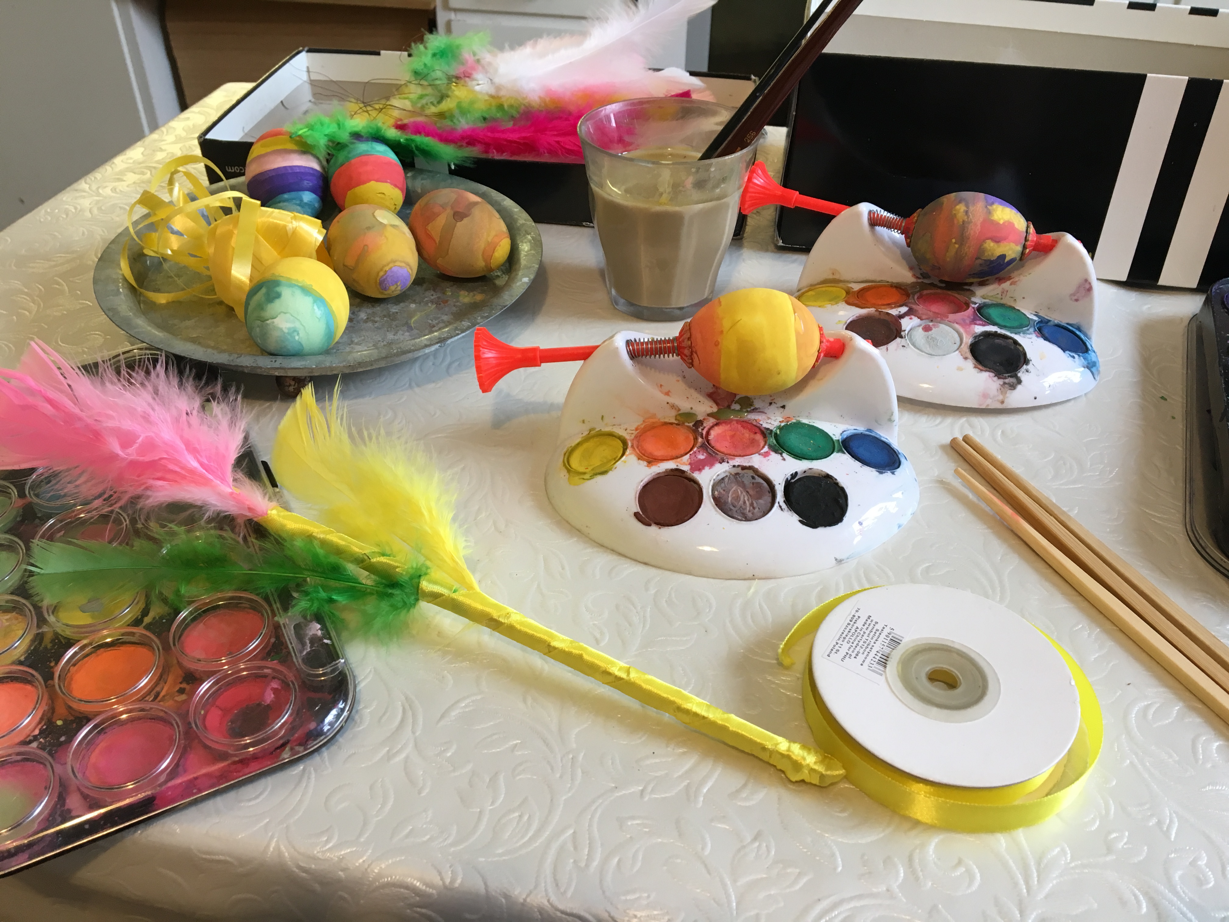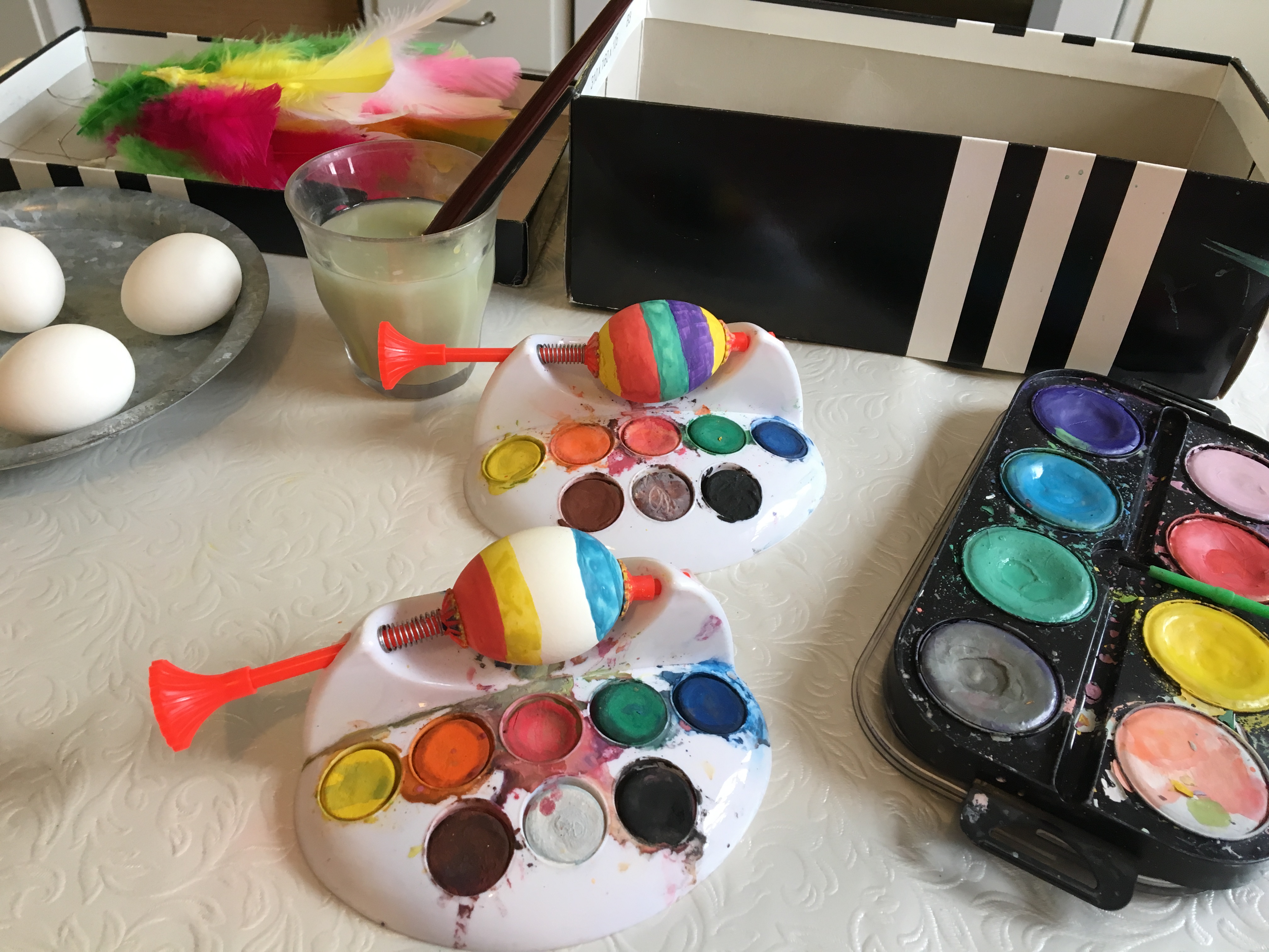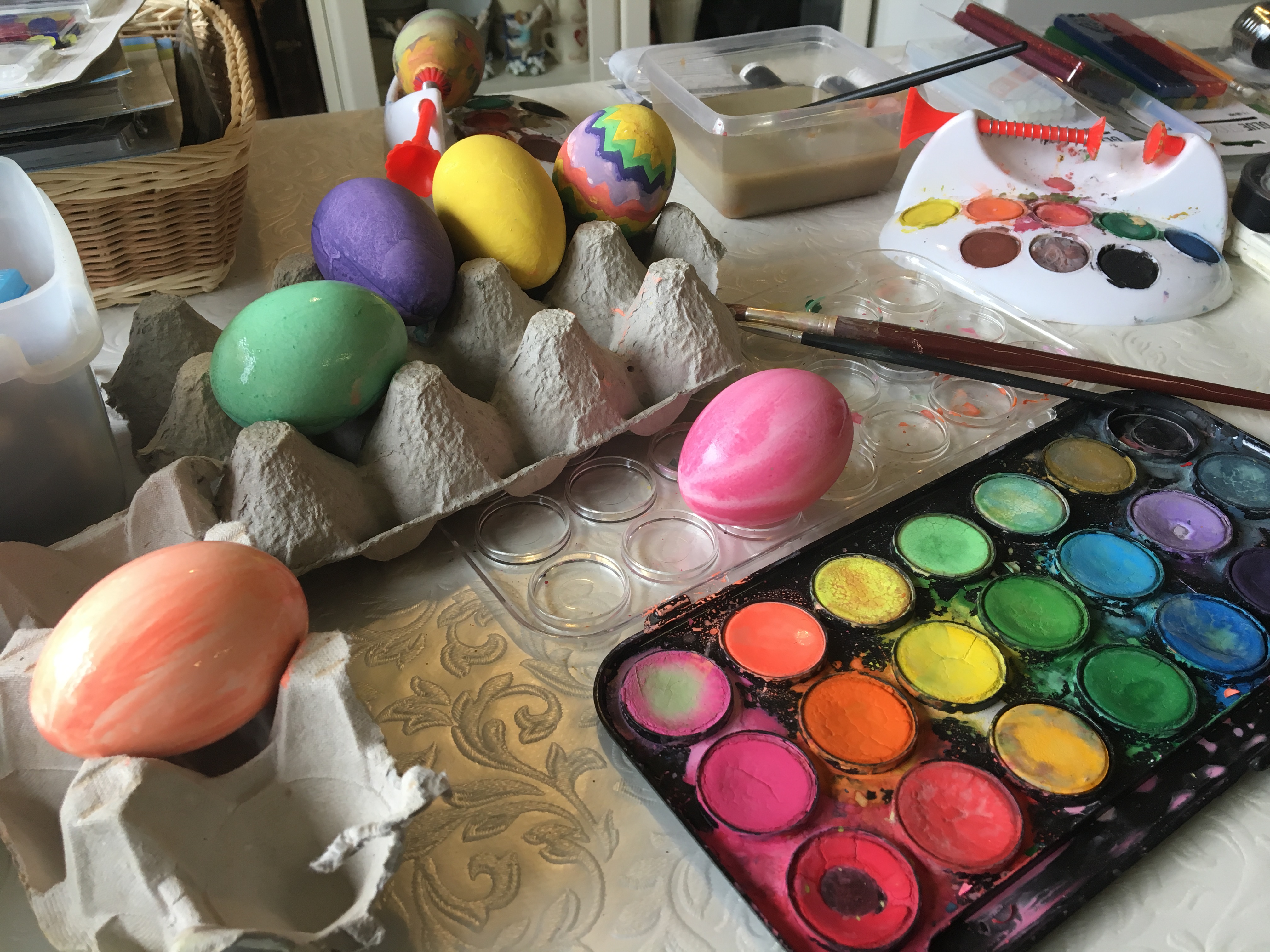 Hardboil the eggs before decorating. Let them cool and dry before you start painting. It is fun for the kids to paint by hand. I know there are a lot of egg coloring kits, however I like for the kids to be allowed to be creative.